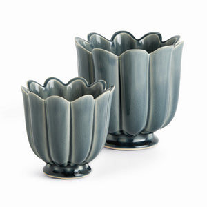 In a classic silhouette with petal edges, these footed pots are nature-inspired. Finished in a rich teal reactive glaze, a great way to add a touch of color to any space. Fill with your favorite small florals or herbs and watch them thrive.