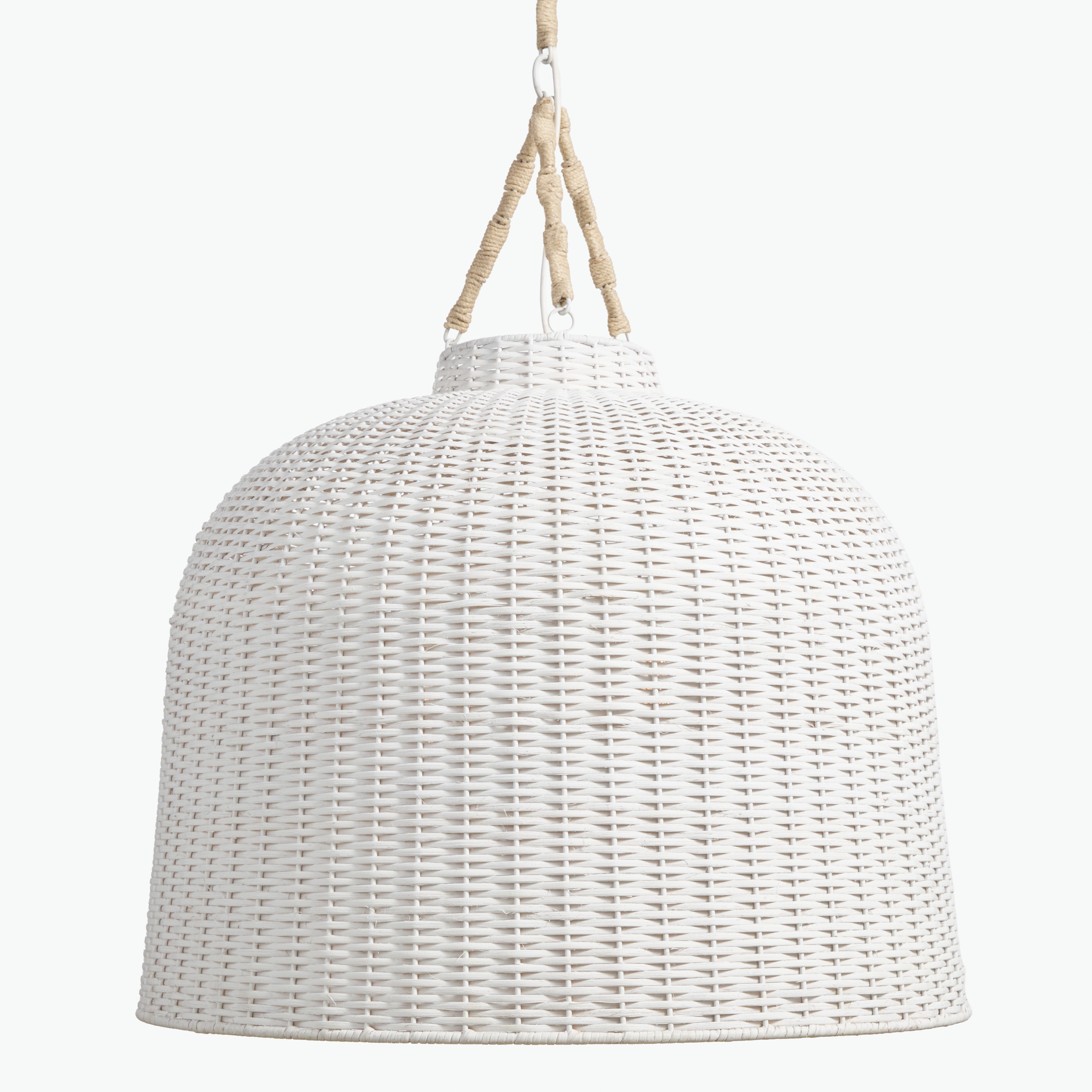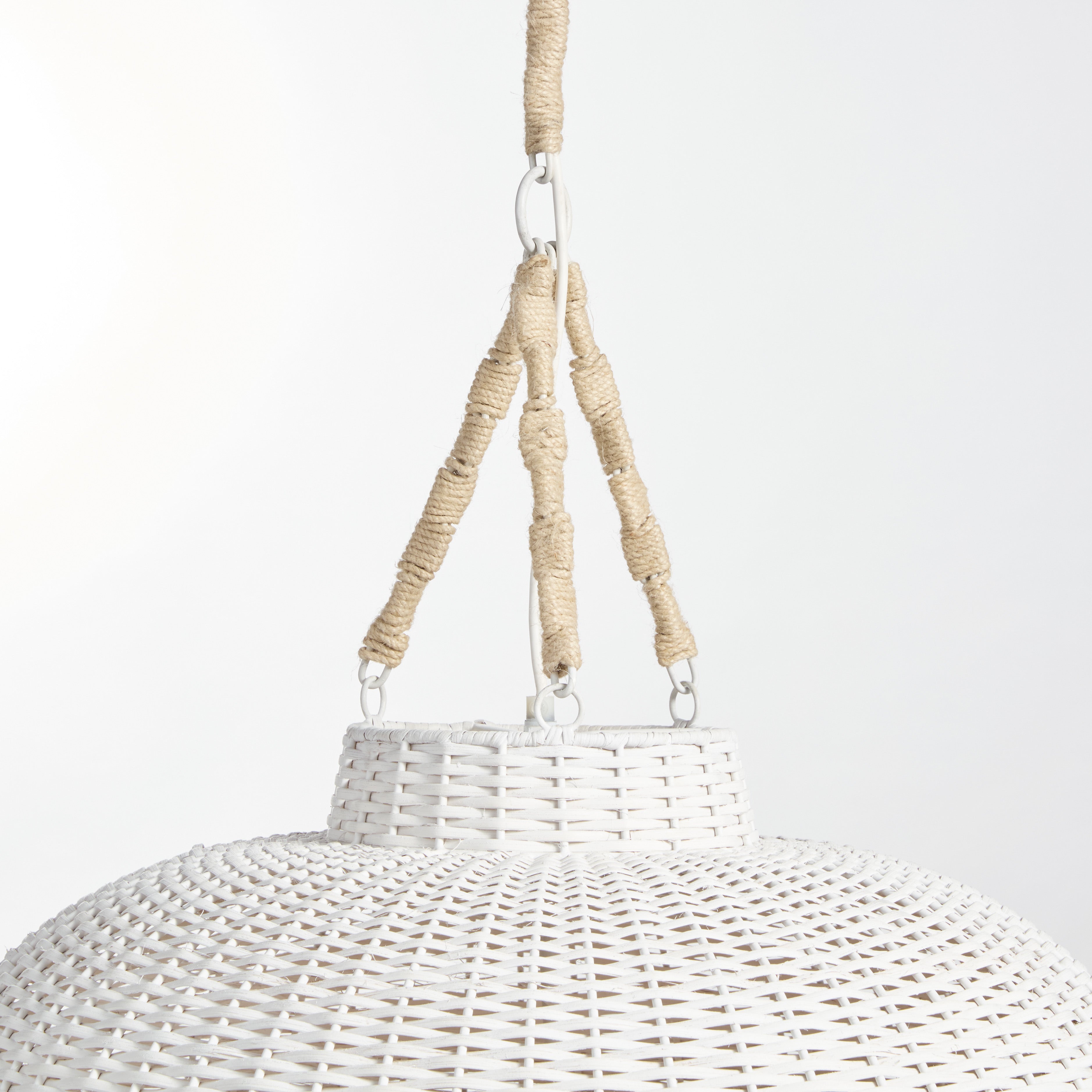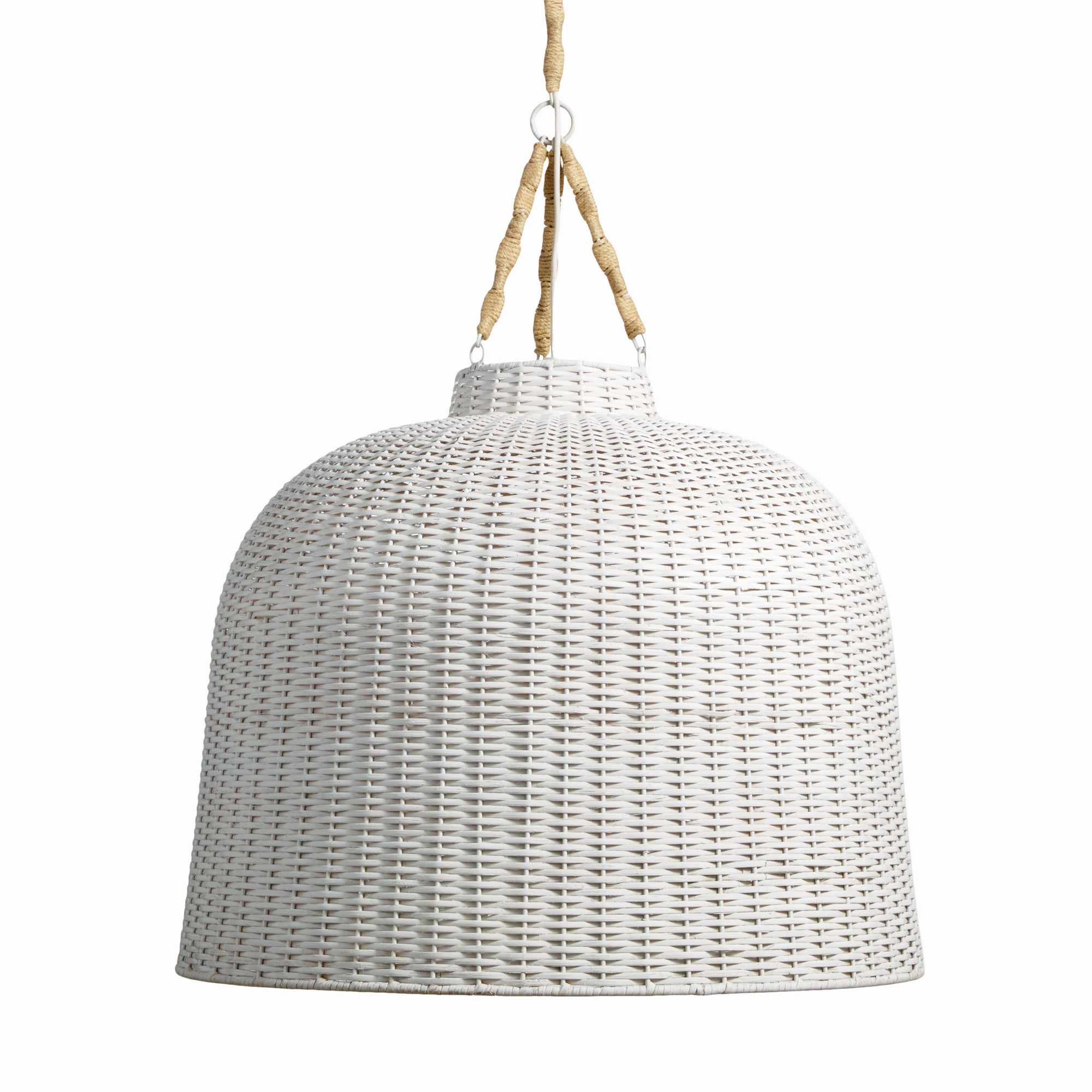 Hand-woven of natural rattan and designed in a bell-shaped silhouette, this casual, yet refined pendant is scaled for the wide open space. The whitewashed finish is right on time for the lighter, more airy trend interior designers are looking for. A unique fixture above kitchen island or dining table adding texture and warm filtered light to any space.