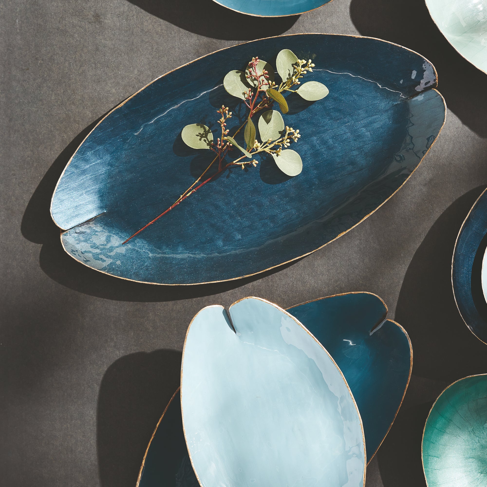 This charming set of hand-painted decorative trays are inspired by lily pads. With a gold edge detail, and coordinating soft blue hues, they add a pop of character to kitchen island, side table or ottoman.