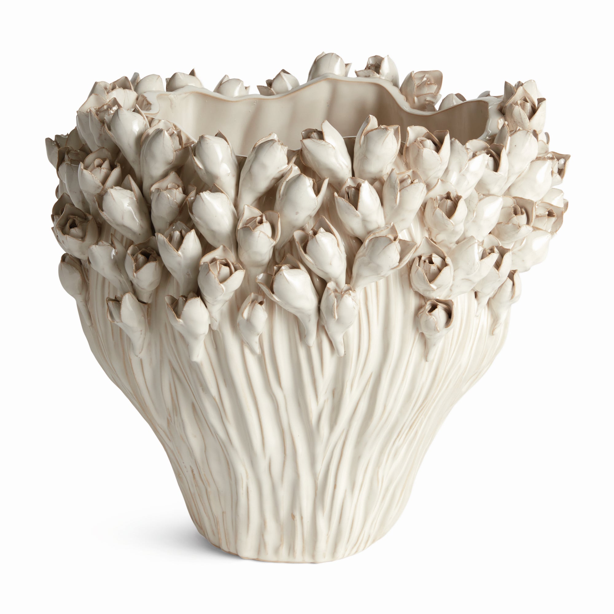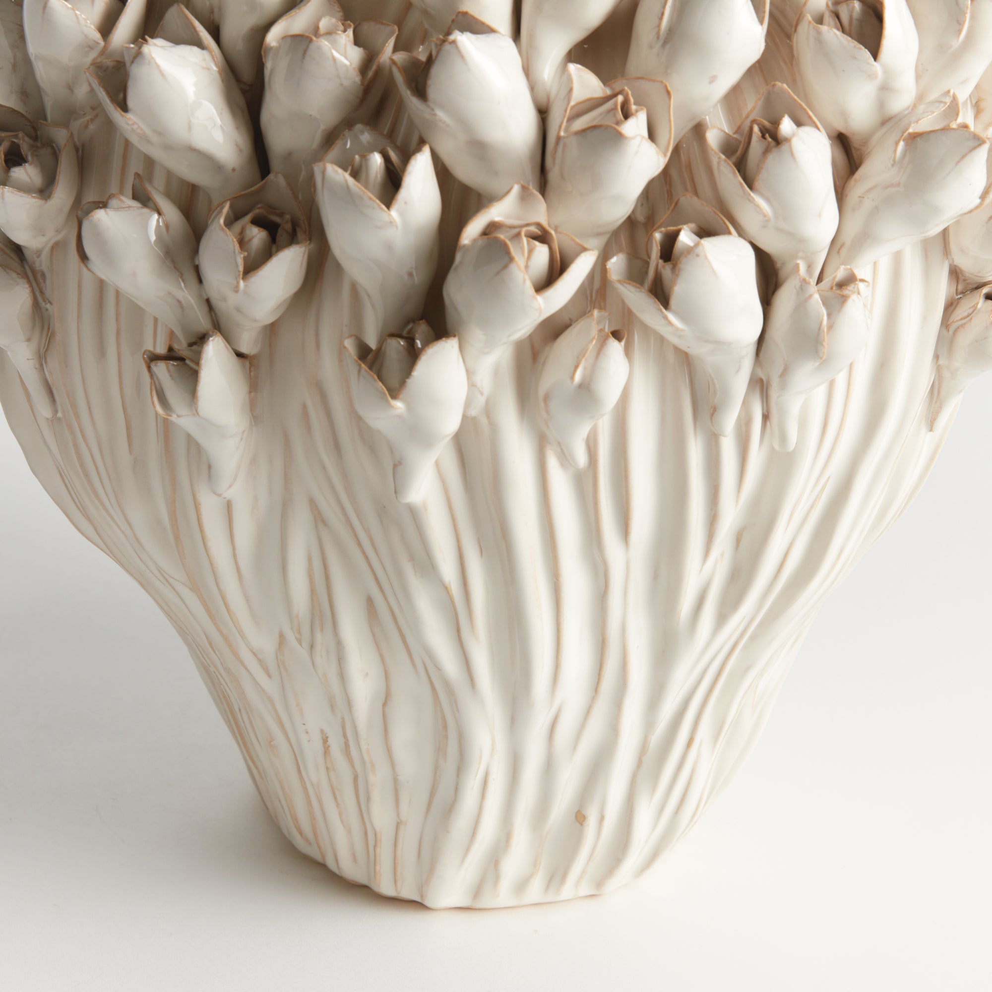 The multi-floral design of this vase is truly extraordinary. The sculpted buds are hand-applied and each piece is uniquely finished by a skilled artisan. Finished off with a dynamic reactive glaze and finally a brushed antique detail. A show-stopping accent all on its own, or add some faux stems for a little extra drama.