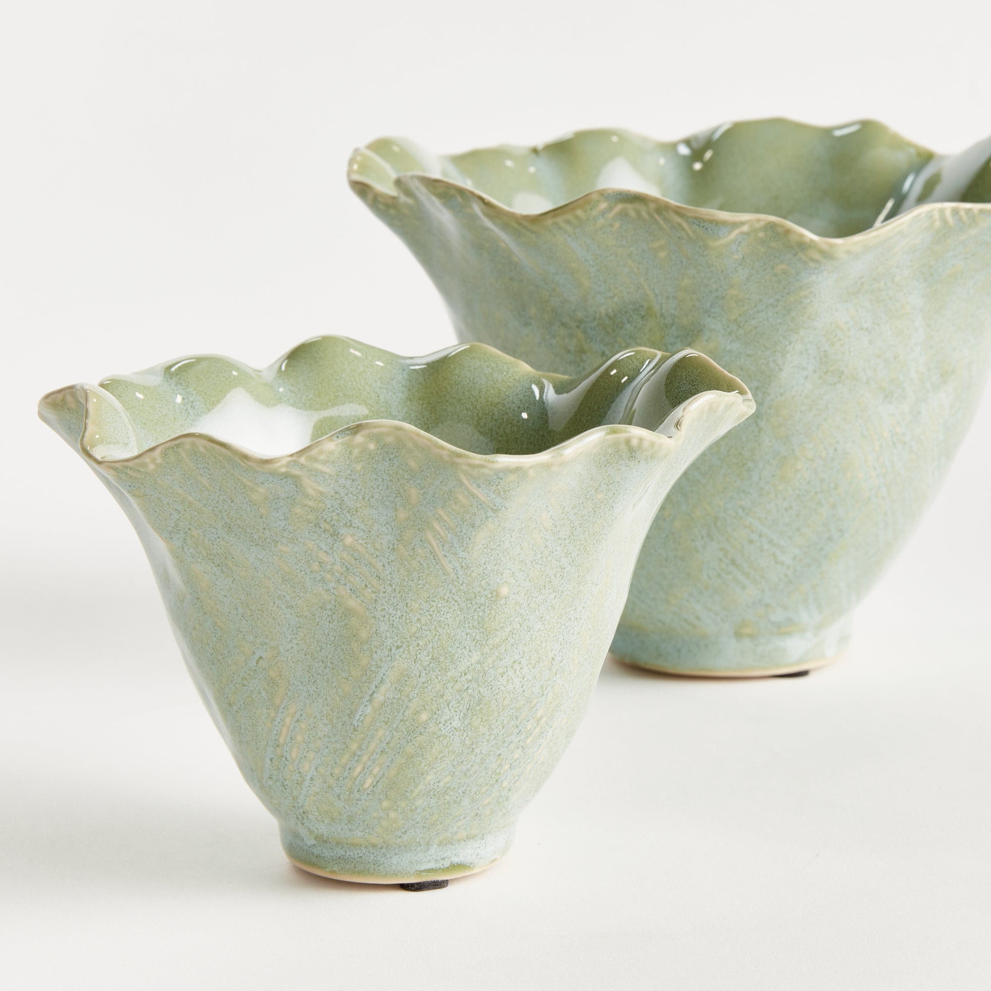 Thin, glossy & modern. A durable stoneware, made with an innovative slip cast process to be as elegantly thin as porcelain, this set of intricate pots is a true treasure. The inherently beautiful glaze varies from piece to piece, due to the organic nature of the forms. Fill with colorful orbs or display as is for a noteworthy statement piece.