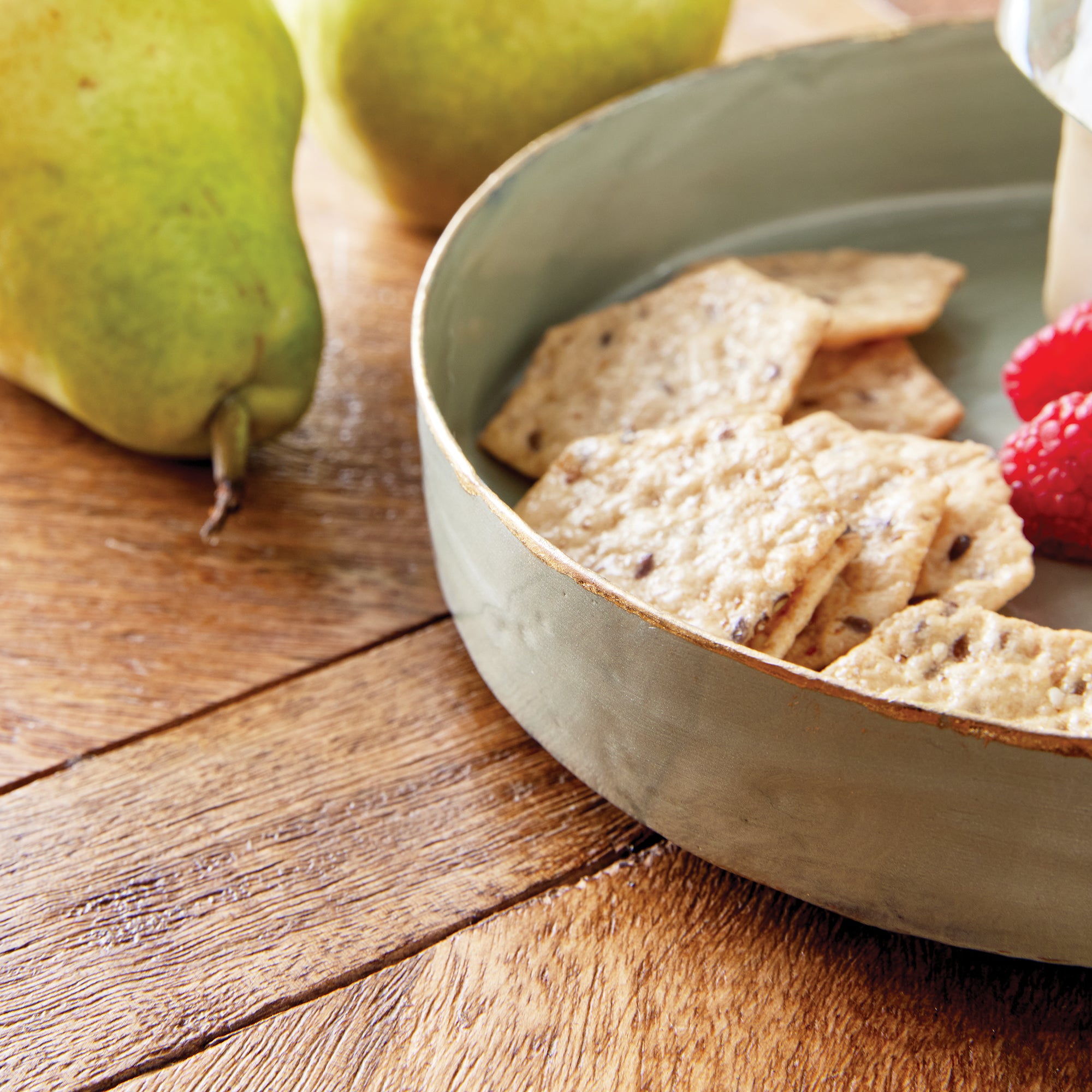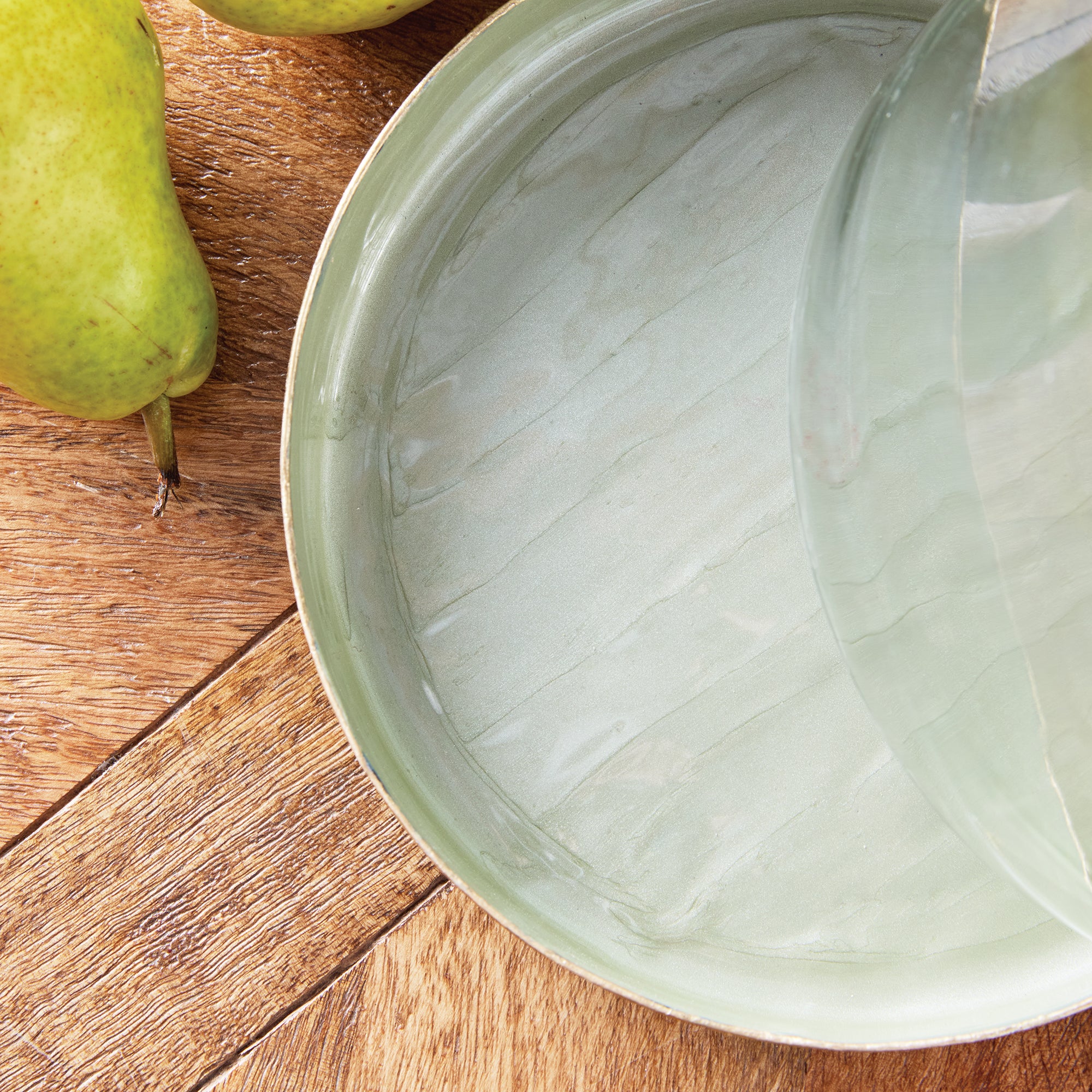 This charming tray and cloche set is made for the modern homemaker. The iron tray is finished in a muted green enamel with gold foil edging. Topped with a glass cloche just to keep things fresh.