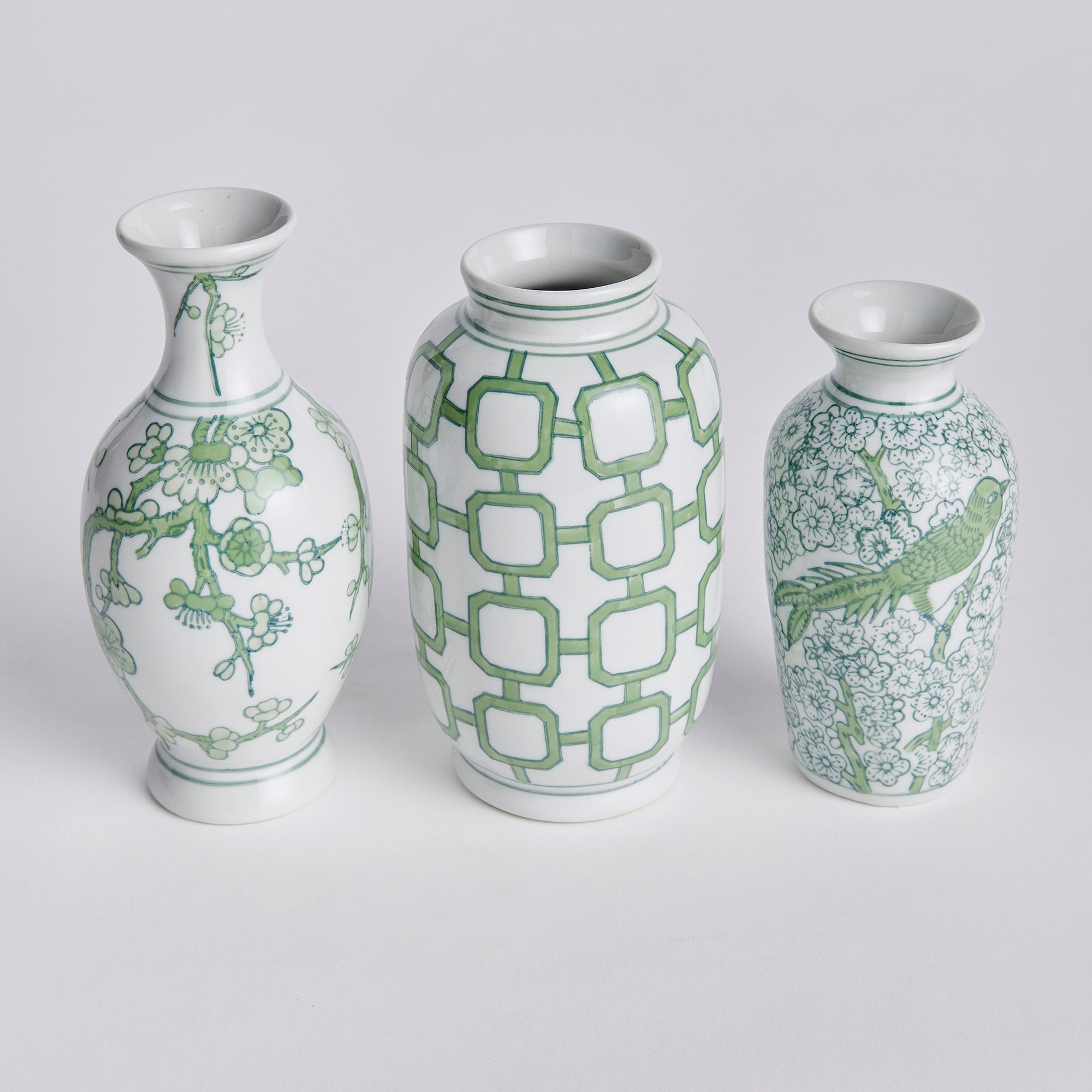 A classic chinoiserie in shades of green. How refreshing! The color green is known to have a harmonizing, balancing effect, so is an inspired design choice for the coordinating Imperial Bud Vases. A welcome addition, adding stability and calm to the well-appointed bookshelf, mantel or entry console.
