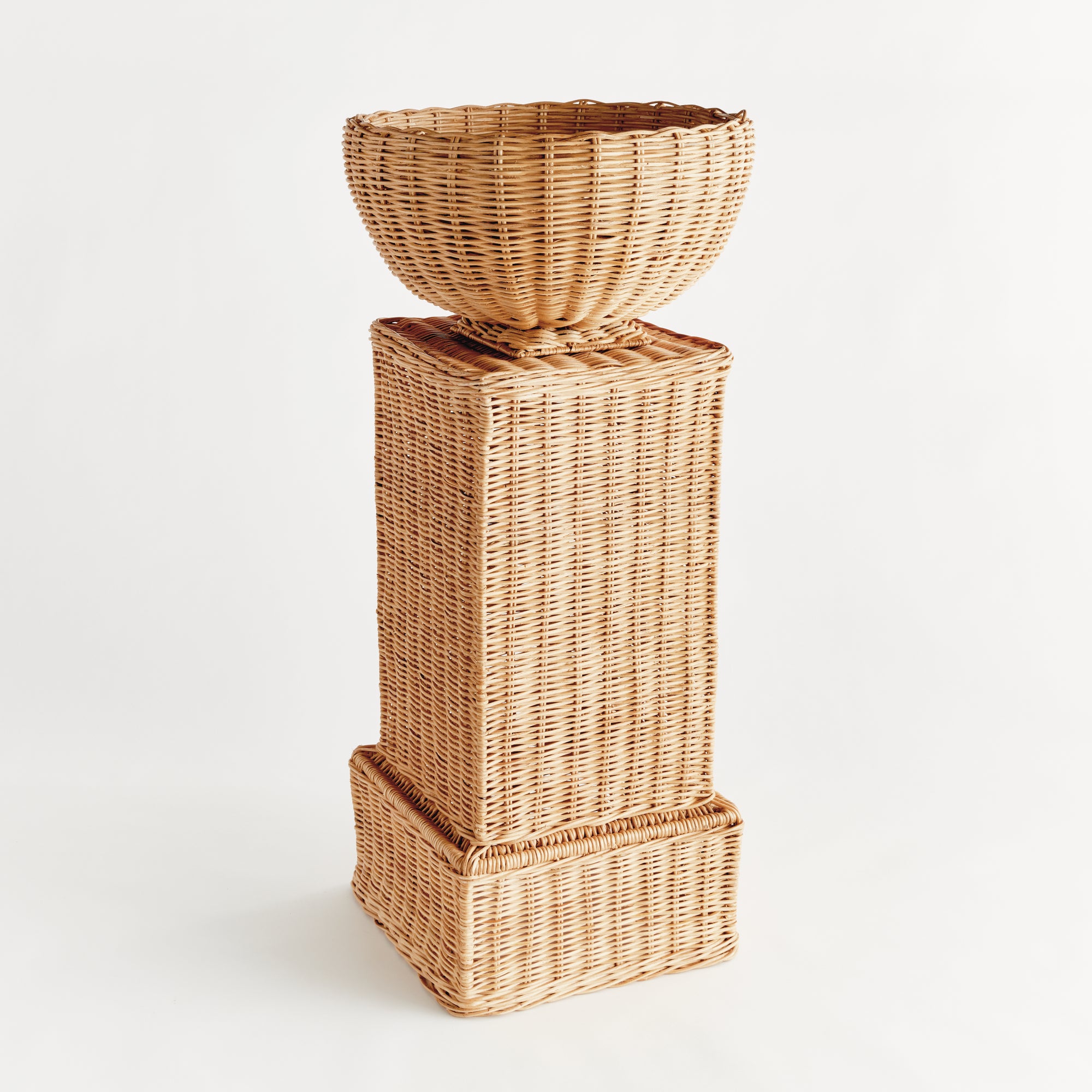 Double-walled and scaled to impress, this nearly 30-inch tall rattan woven pedestal is a real stunner. With beautiful varying natural tones in the rattan and reinforced by an iron framework, it is made to keep its original shape. An exclusive design you won't see anywhere else. Makes a beautiful entry way with a footed bowl or large objet on top... the possibilities are endless!