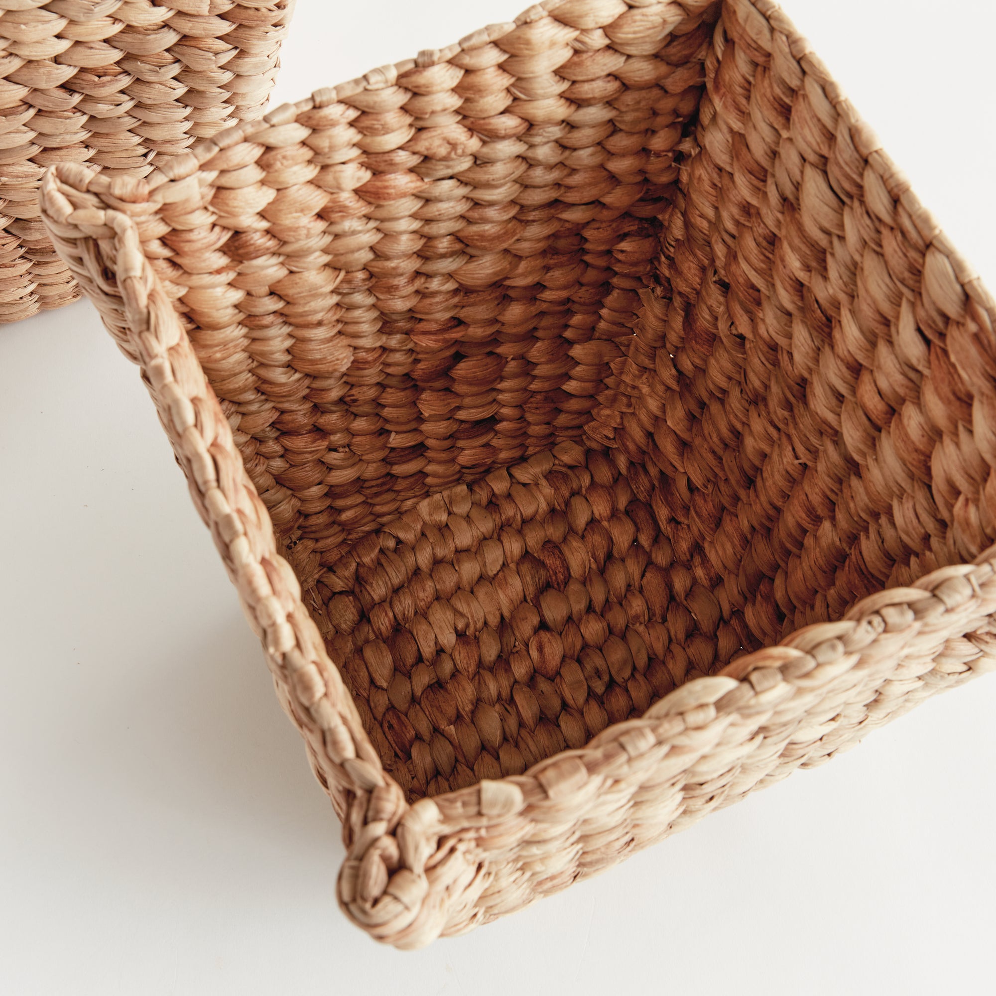 Simple, square tapered baskets made out of water hyacinth. What a refreshing take! This little set is a beautiful way to store your odds & ends.