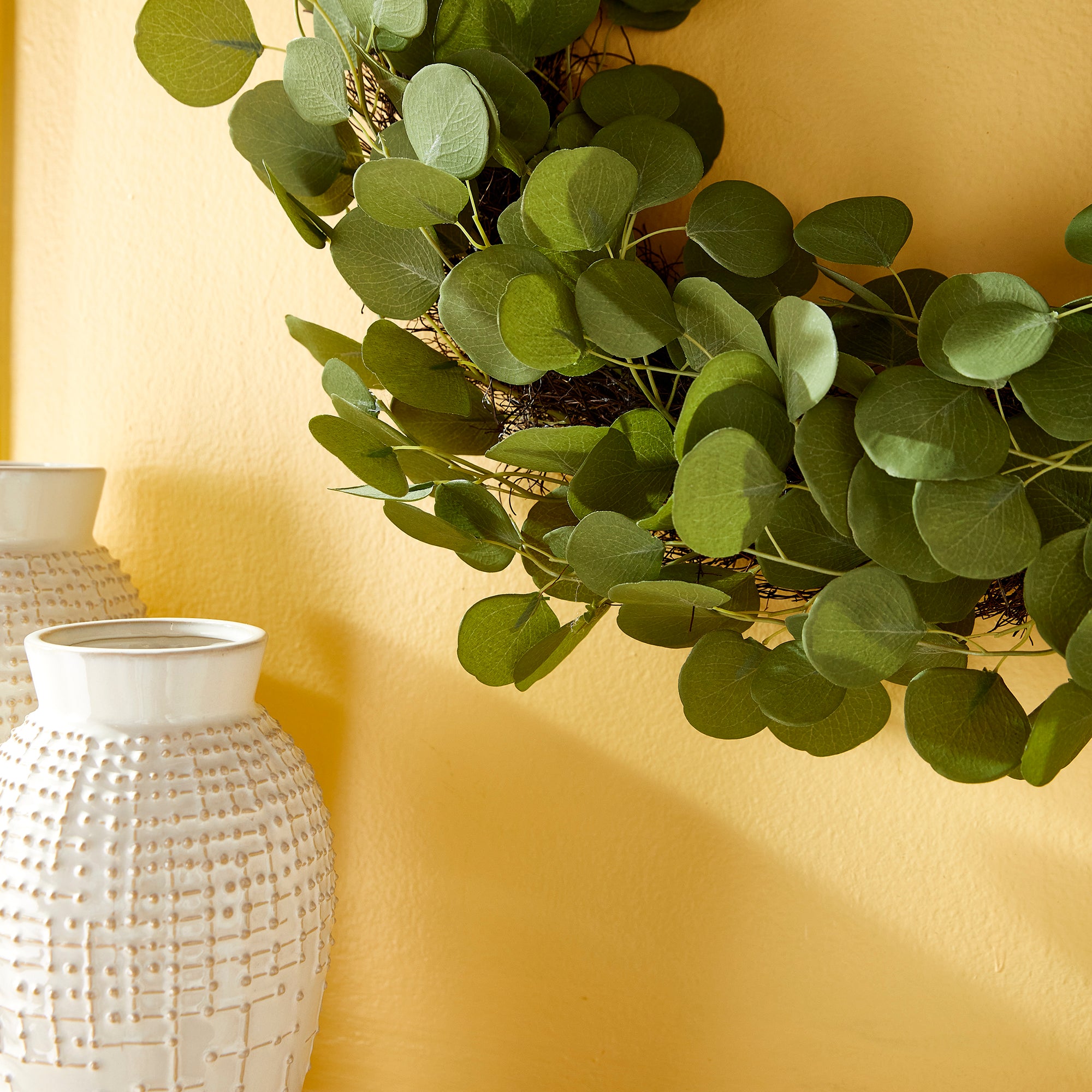 This silver dollar eucalyptus wreath is a must have accent for in-between seasons decorating. The distinctive green tones of the eucalyptus leaves add a light and fresh look to any color palette. Great for covered porch, or use as a unique, colorful centerpiece.