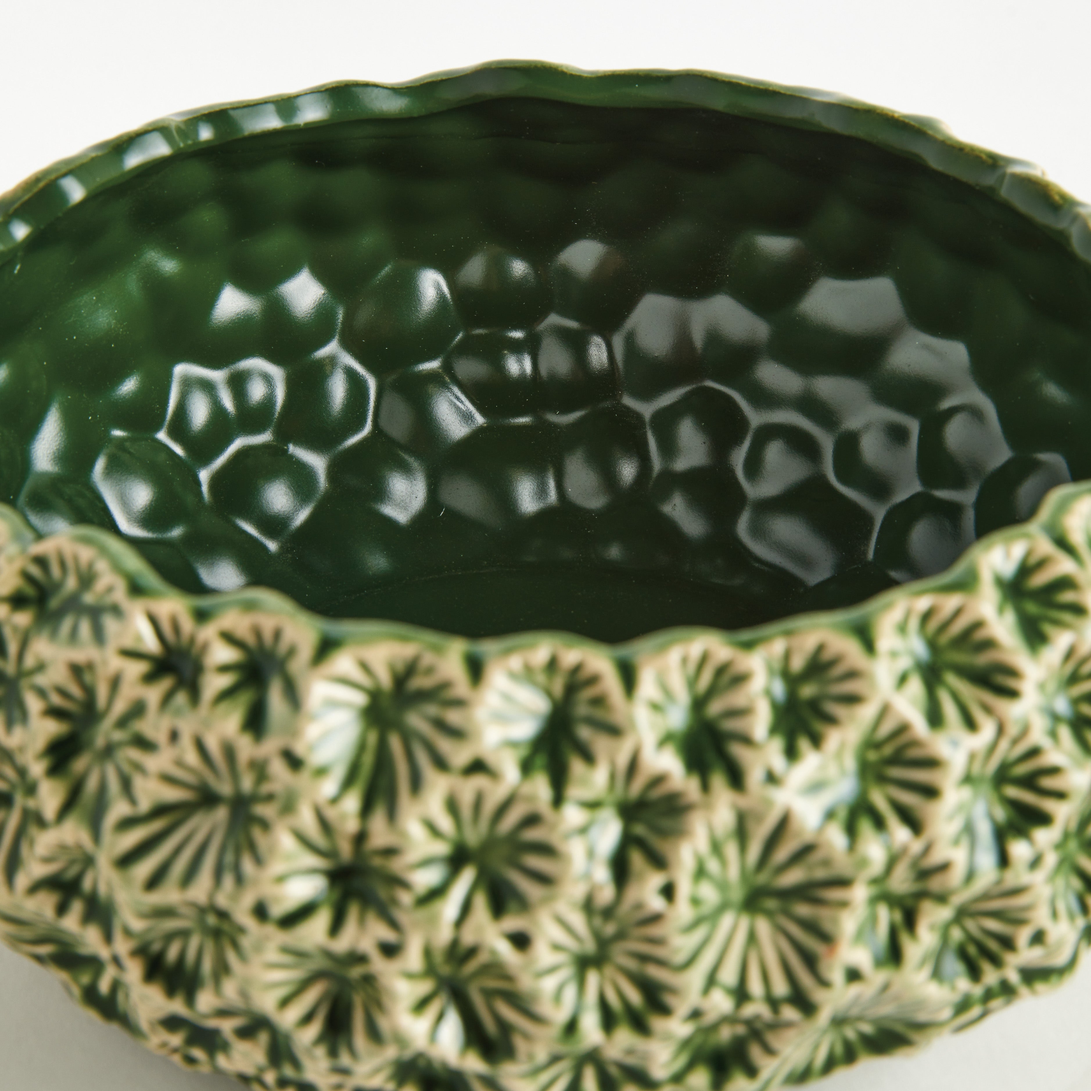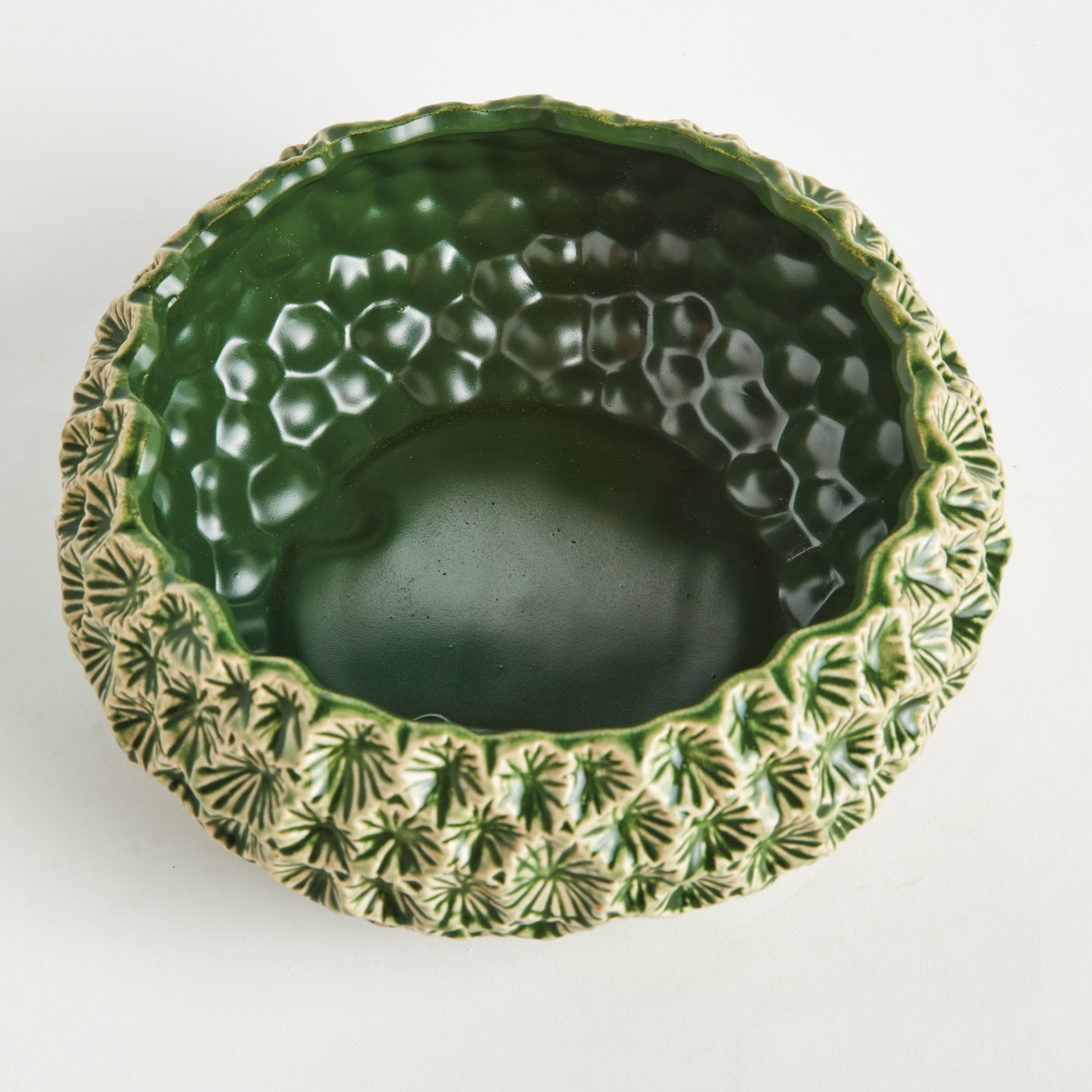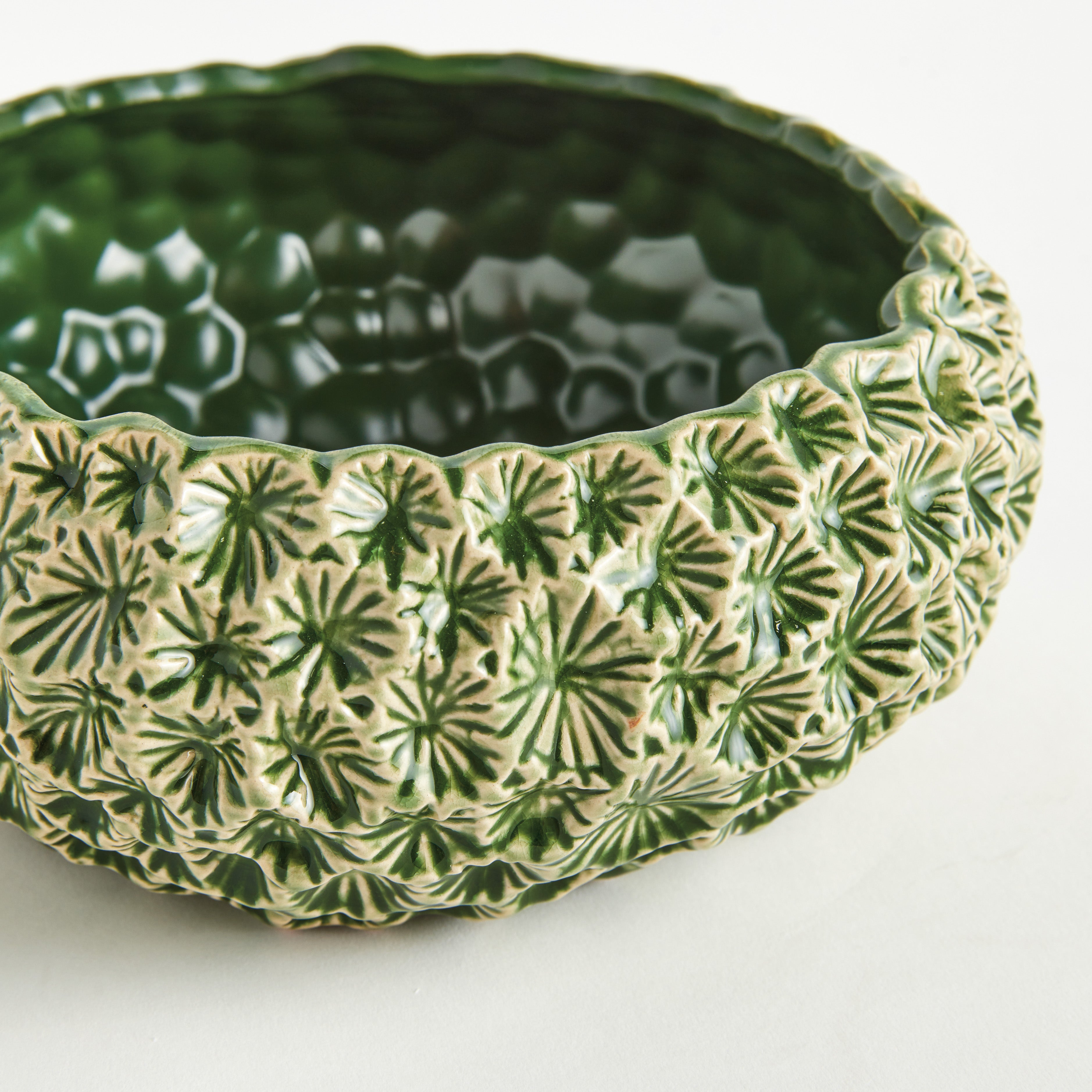 This artisan-made stoneware bowl is a real beauty. The delicate floral embossed pattern accentuates the reactive glaze. Truly a nature-inspired piece, and conversation starting accent for side table, kitchen counter or ottoman.