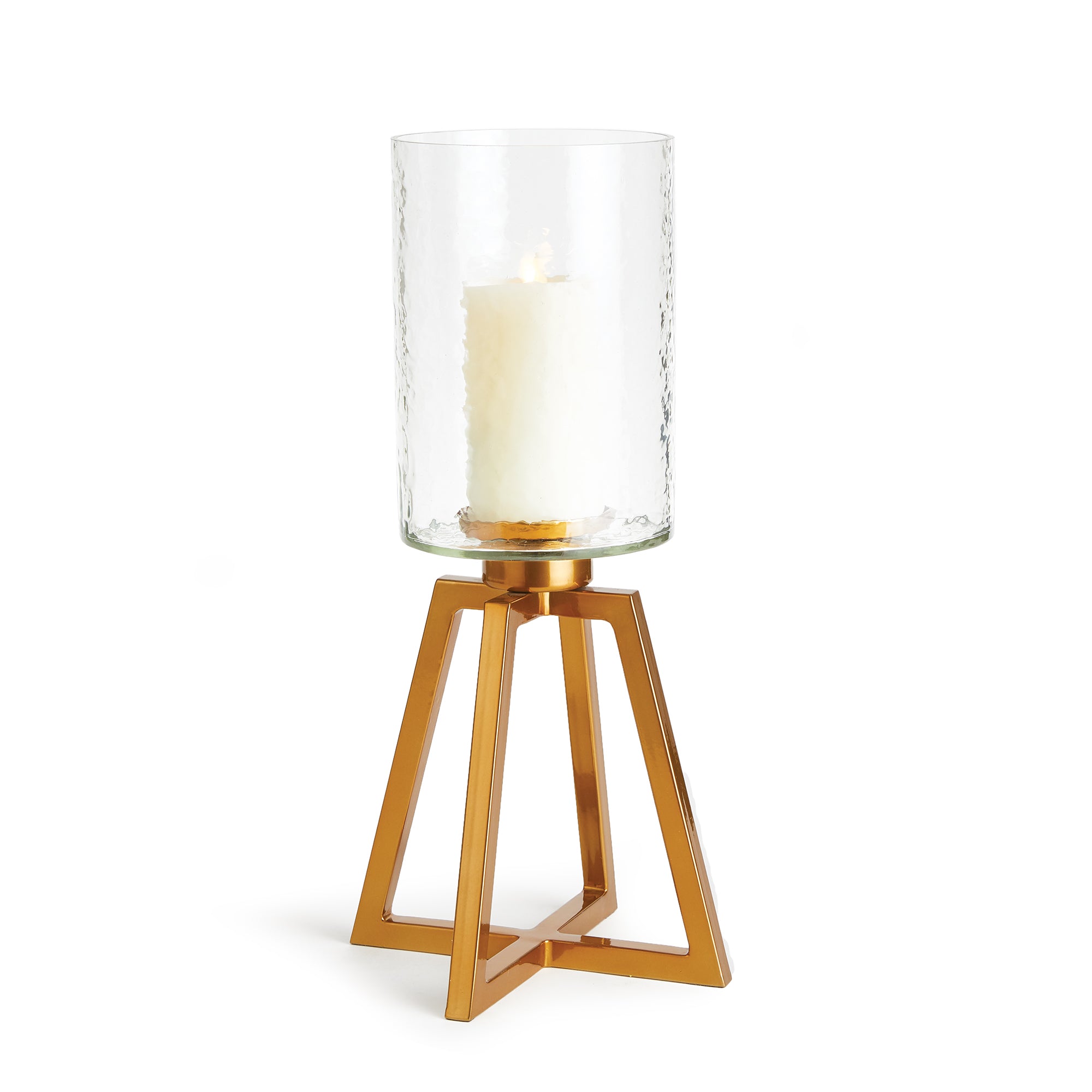 With a tall, tapered metal base and hammered glass hurricane, this piece is a minimalist design. A fitting accent for the industrial modern space.