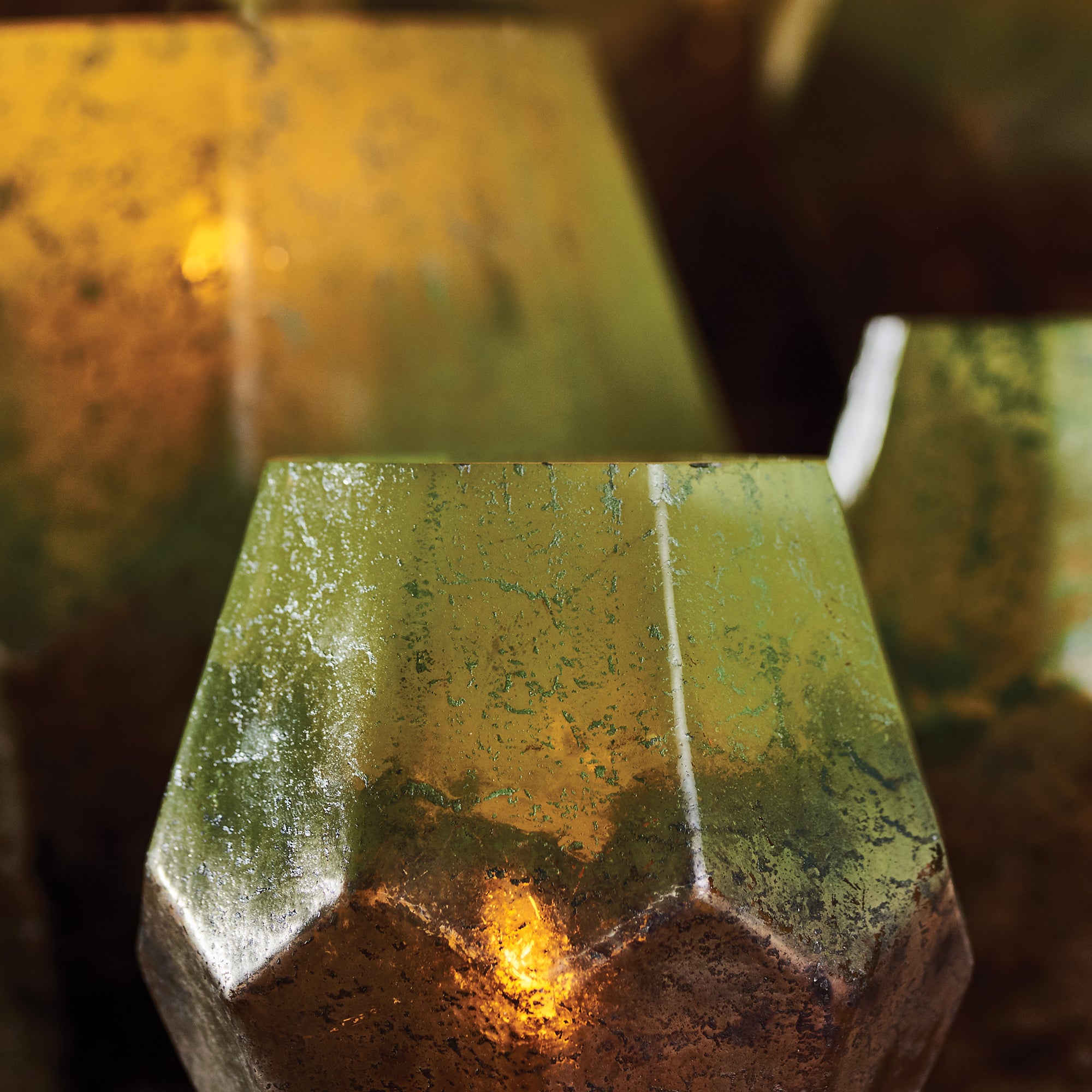 Shaped like a precious gem, but gritty and raw, they are as beautiful as they are complex. The warm glow of candlelight illuminates the mossy, metallic ombre finish.
