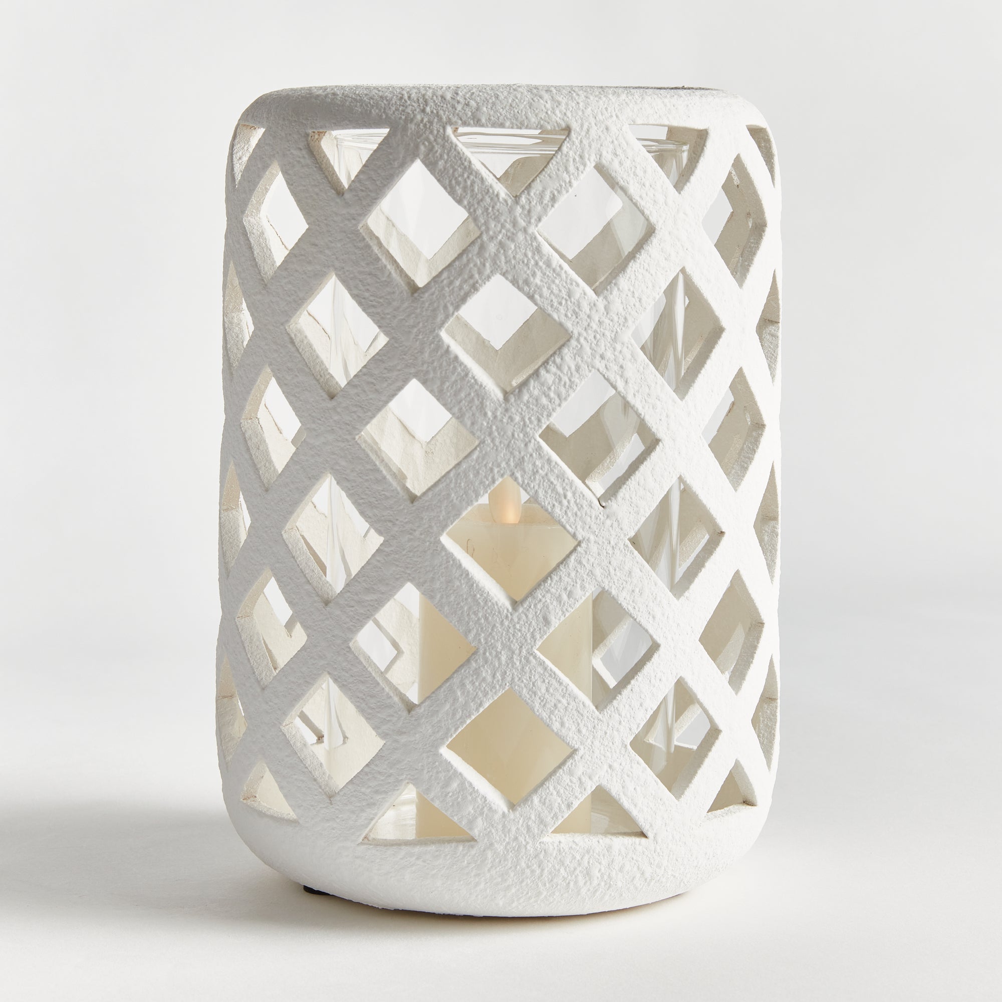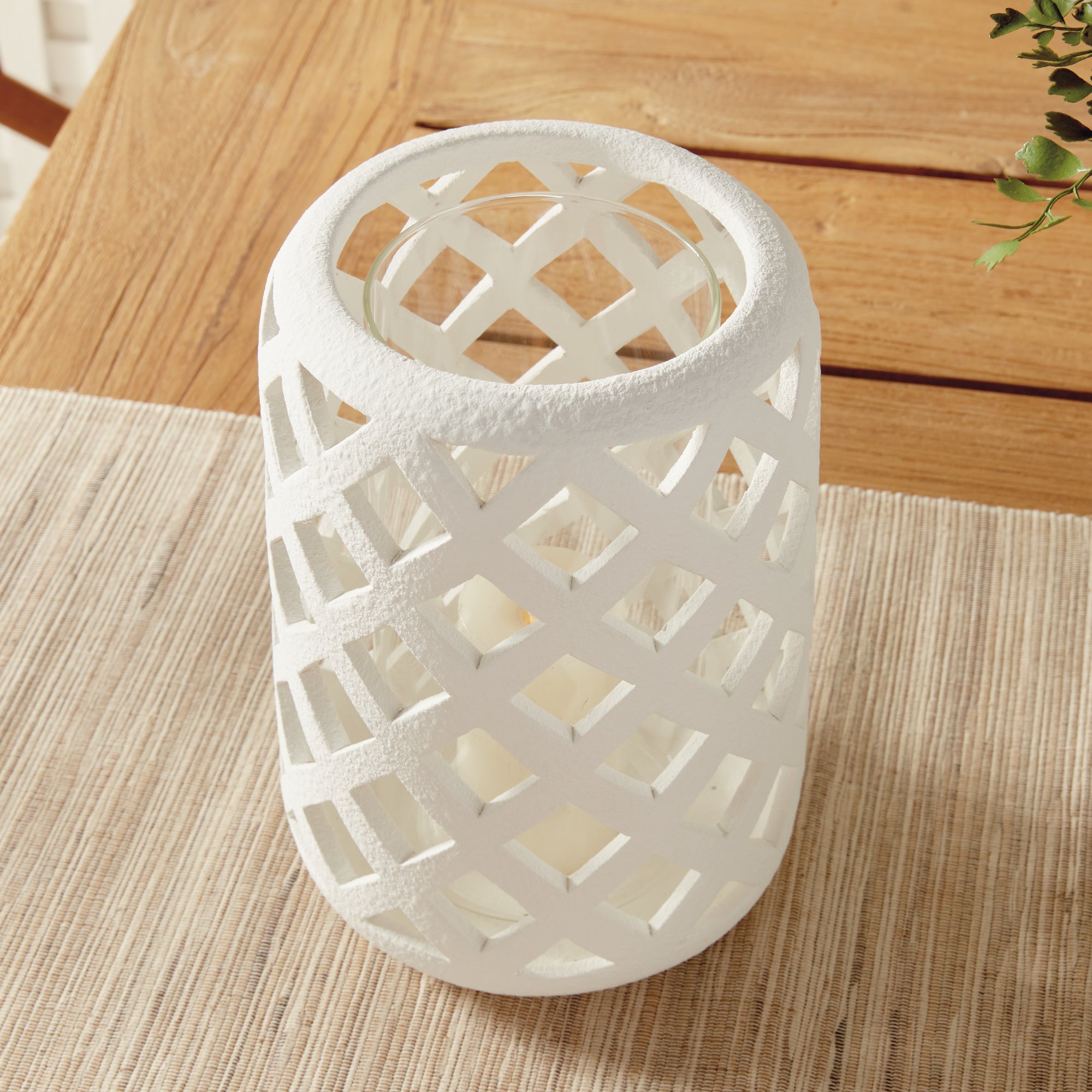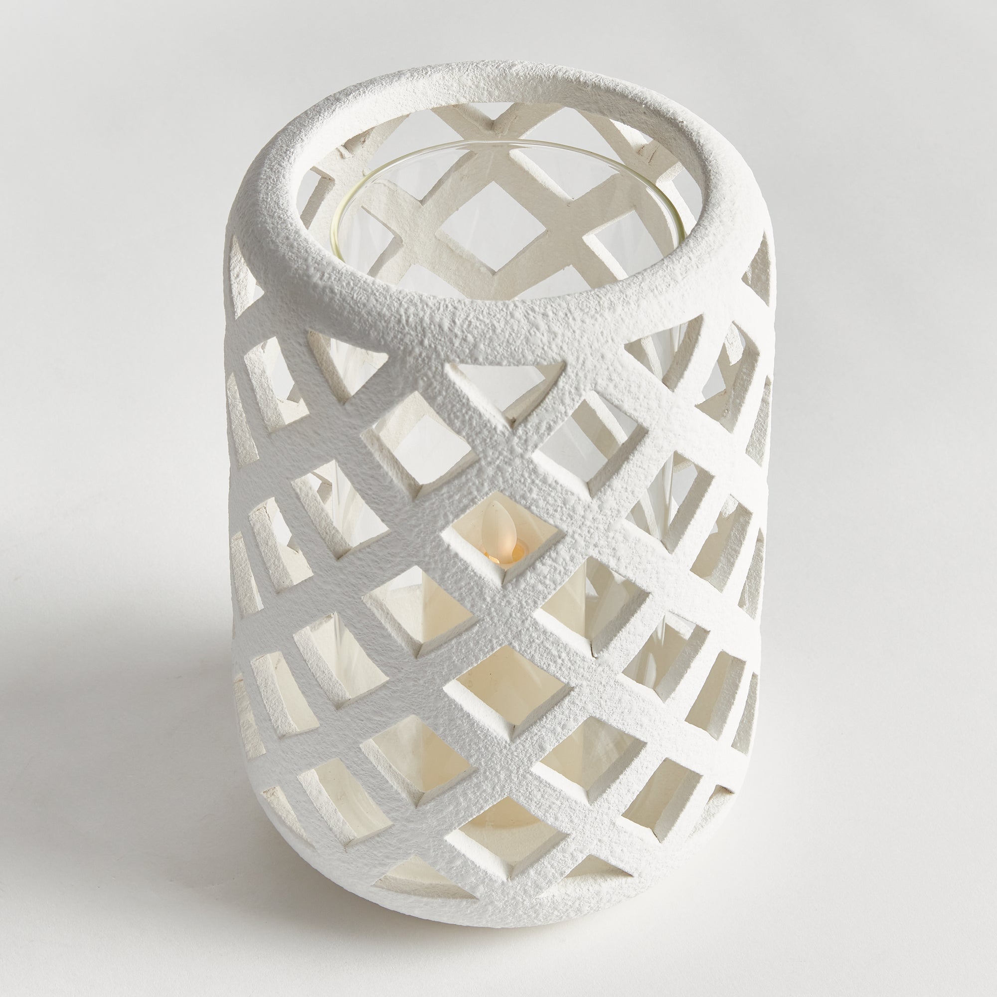 Expertly crafted from hand cut ceramic strips, and finished in a bright white glaze, this hurricane lets all the light shine through. Complete with a glass insert, it is a beautiful way to display a tea light or small pillar candle.