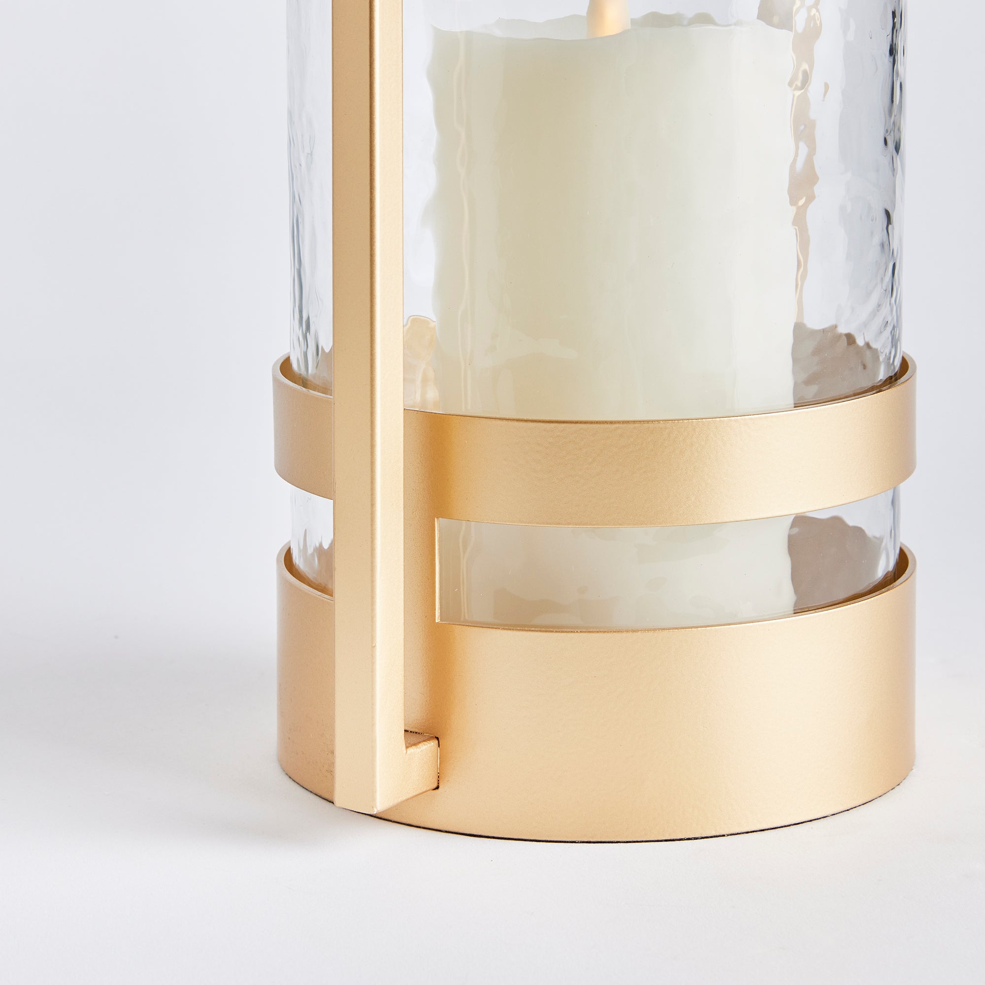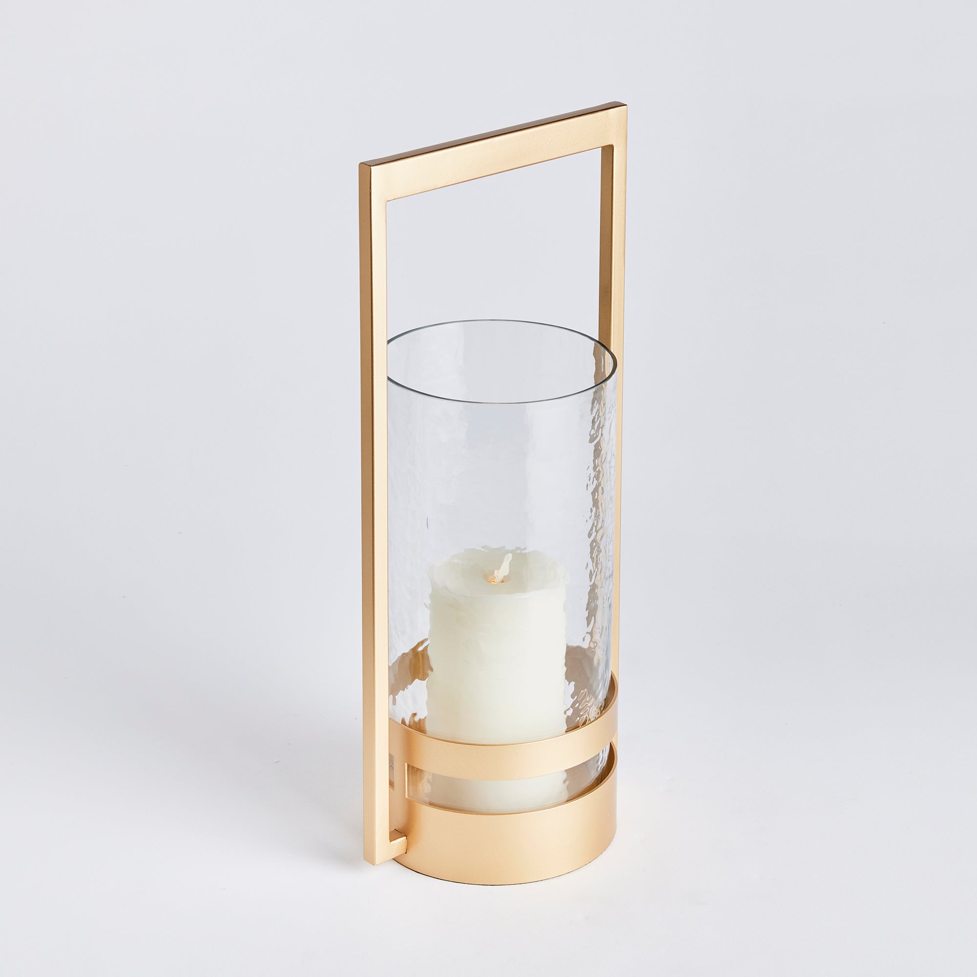 In a beautifully balanced mix of metal and glass this streamlined hurricane is designed to stand out. Finished in a warm gold and scaled to impress, it makes a great addition to the modern, open space.