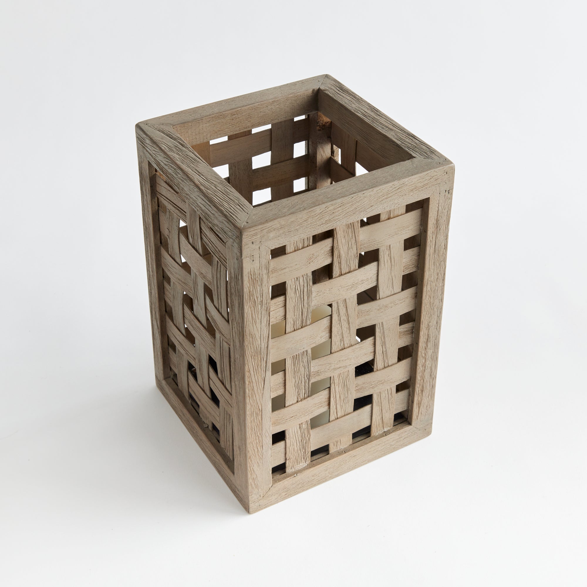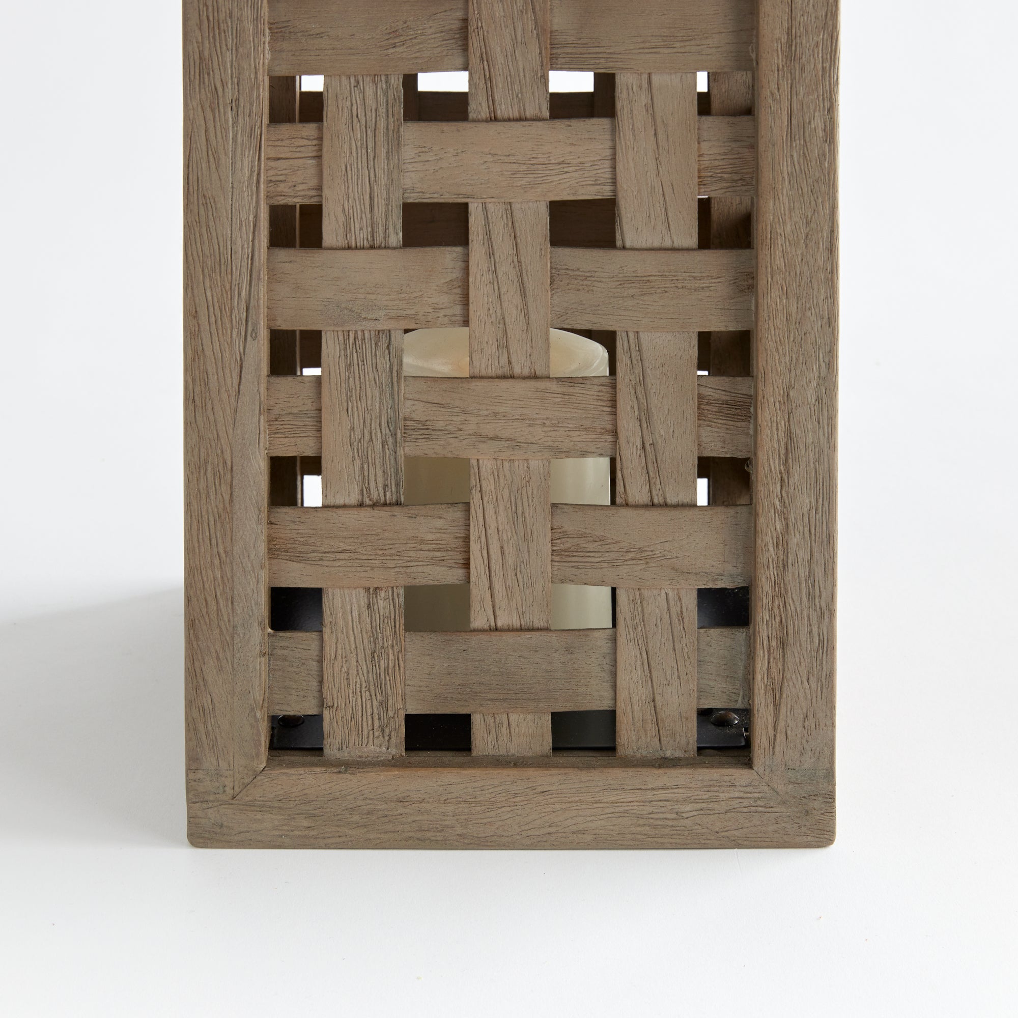 Expertly handwoven using wide gray washed teak wood panels in a check pattern. An exclusive design you won't see anywhere else, this hurricane makes an exquisite centerpiece for the dinner table, mantle or console.