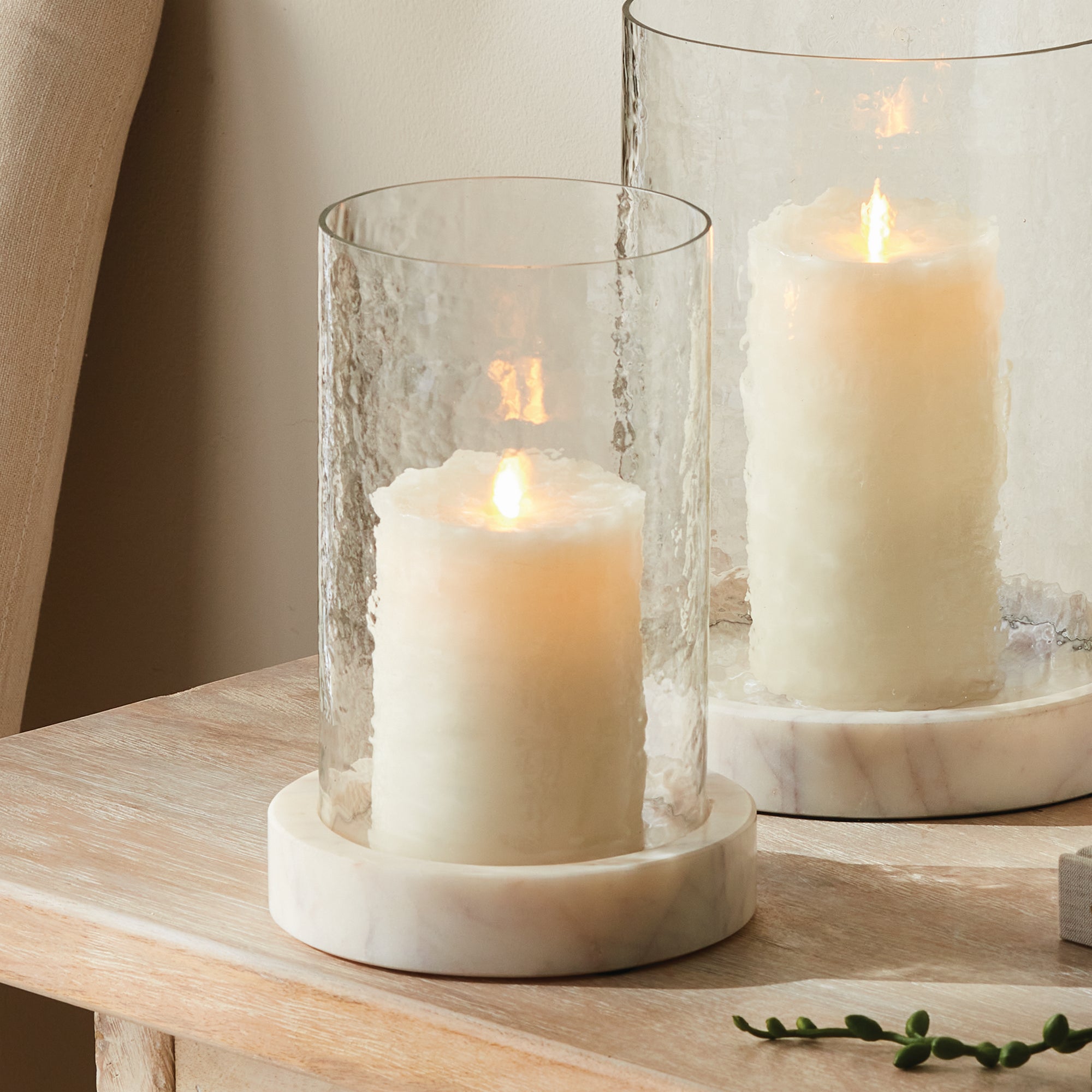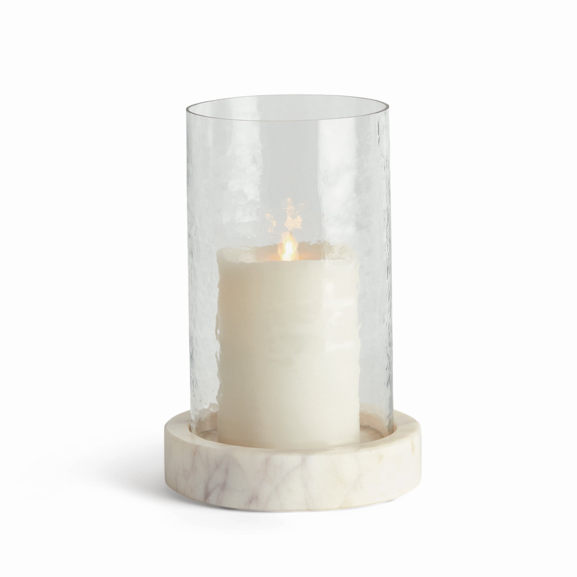 With a hammered glass vessel that sits inside a simply marble tray, this hurricane is decidedly modern. The hammered glass adds a bit of texture to the otherwise understated design. A beautiful addition to kitchen island, coffee table or ottoman.