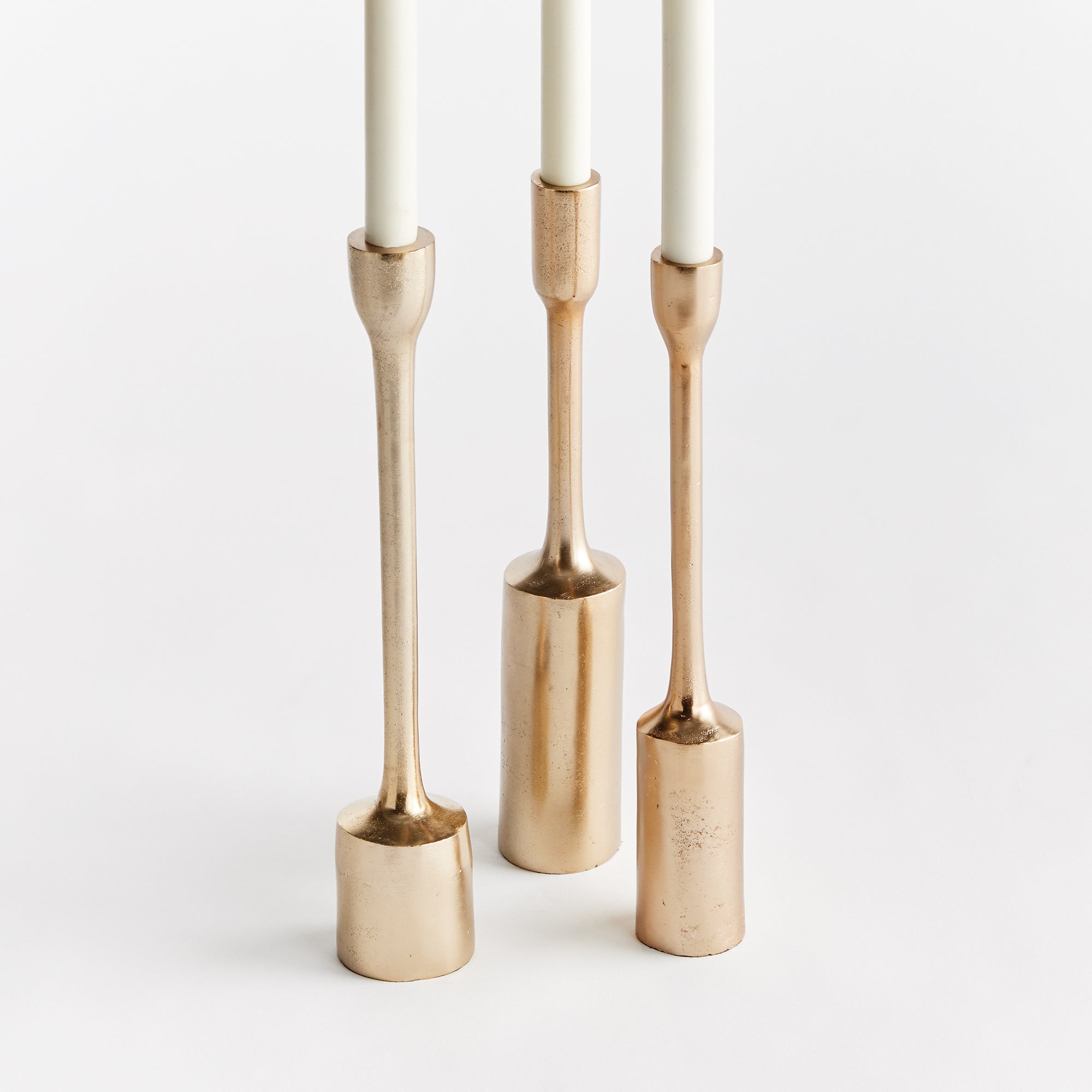 In a solid champagne gold, these aluminum candleholders are substantial pieces. Pair with glowing tapers and create a warm centerpiece.