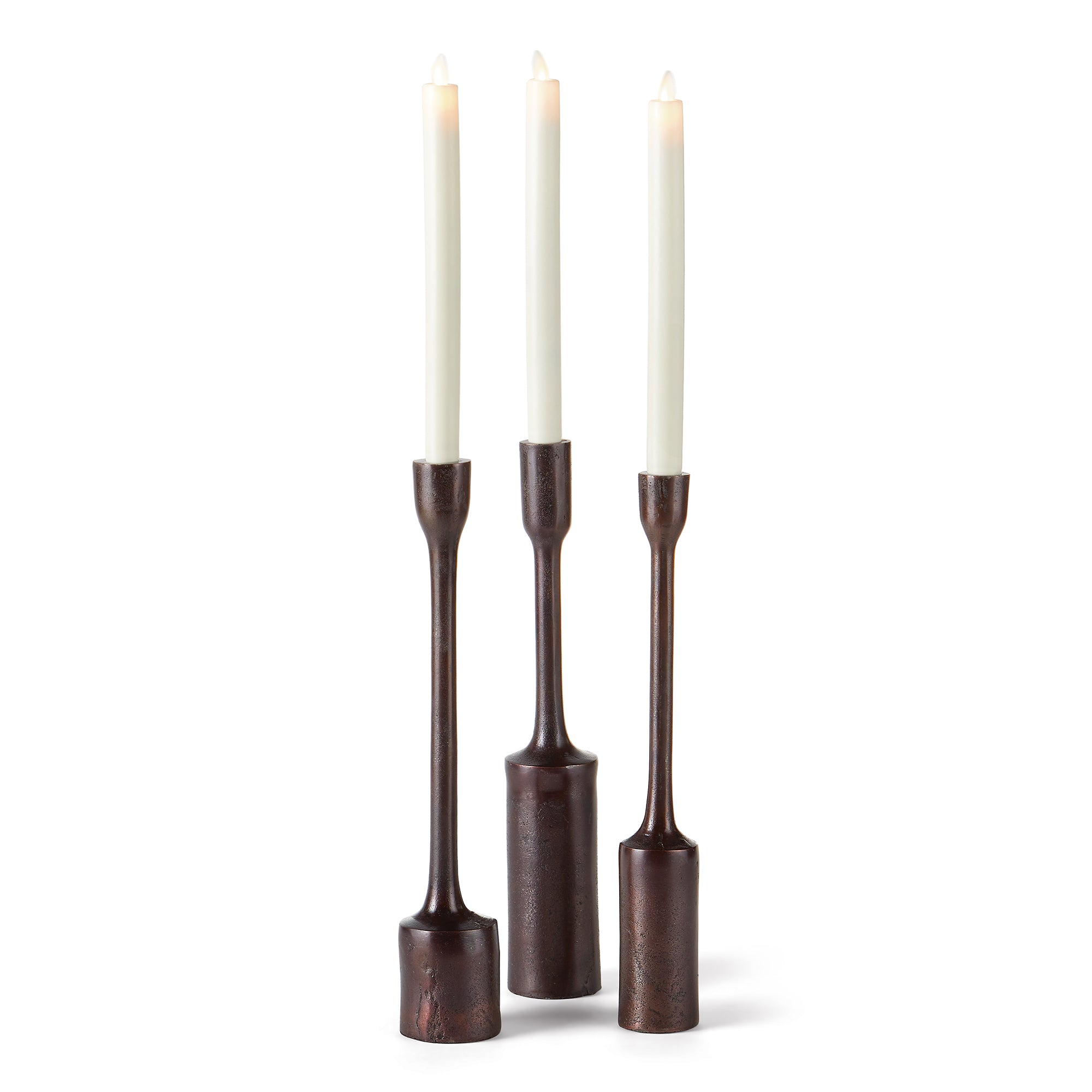In a solid antique brass with a dark rubbed bronze finish, these candleholders are substantial pieces. Pair with our LightLi tapers and create a glowing centerpiece. A dramatic accent for the modern home.