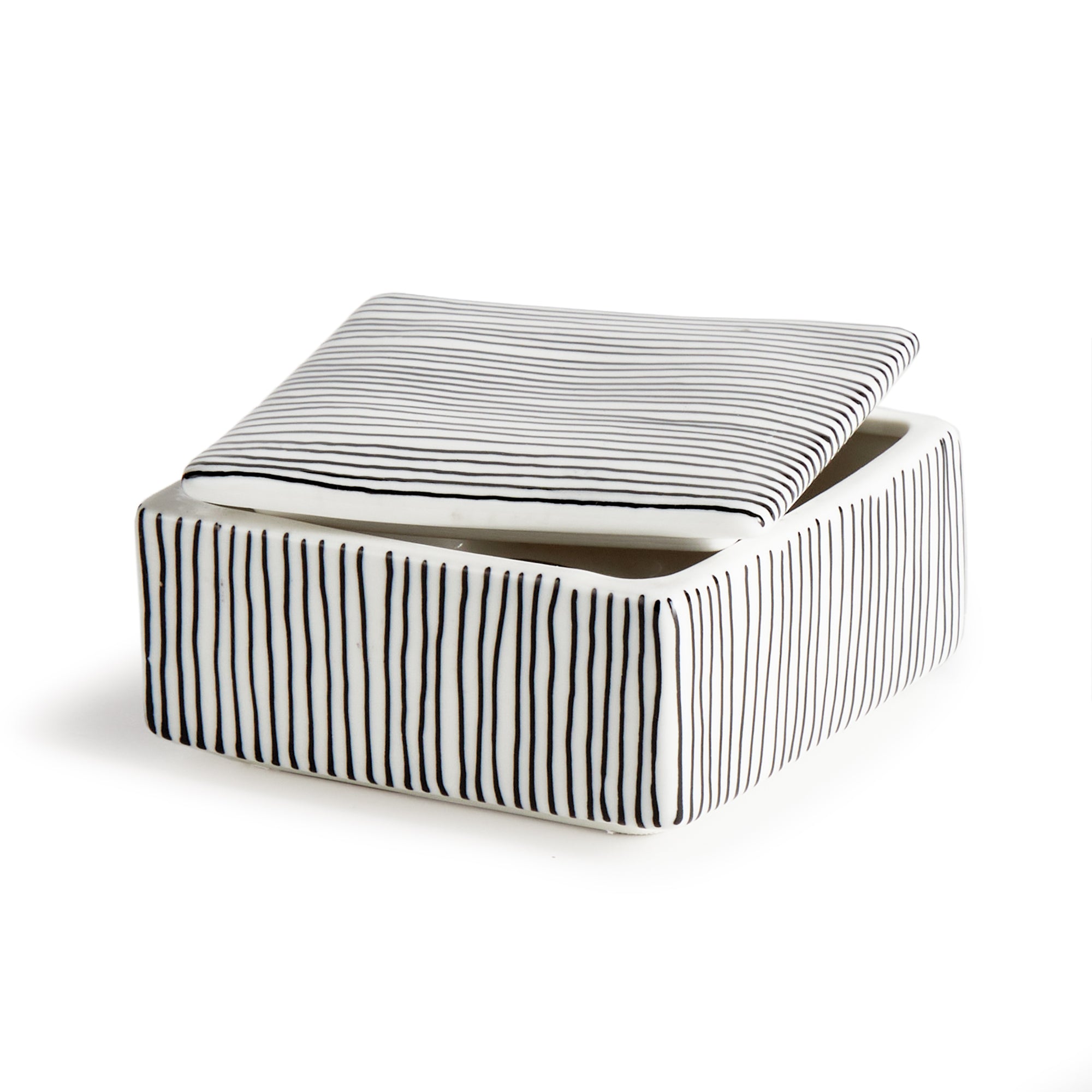 This delicate ceramic box is hand-stamped with a charmingly irregular linear pattern. The perfect place to put your jewelry, car keys or whatever needs to be tucked away.