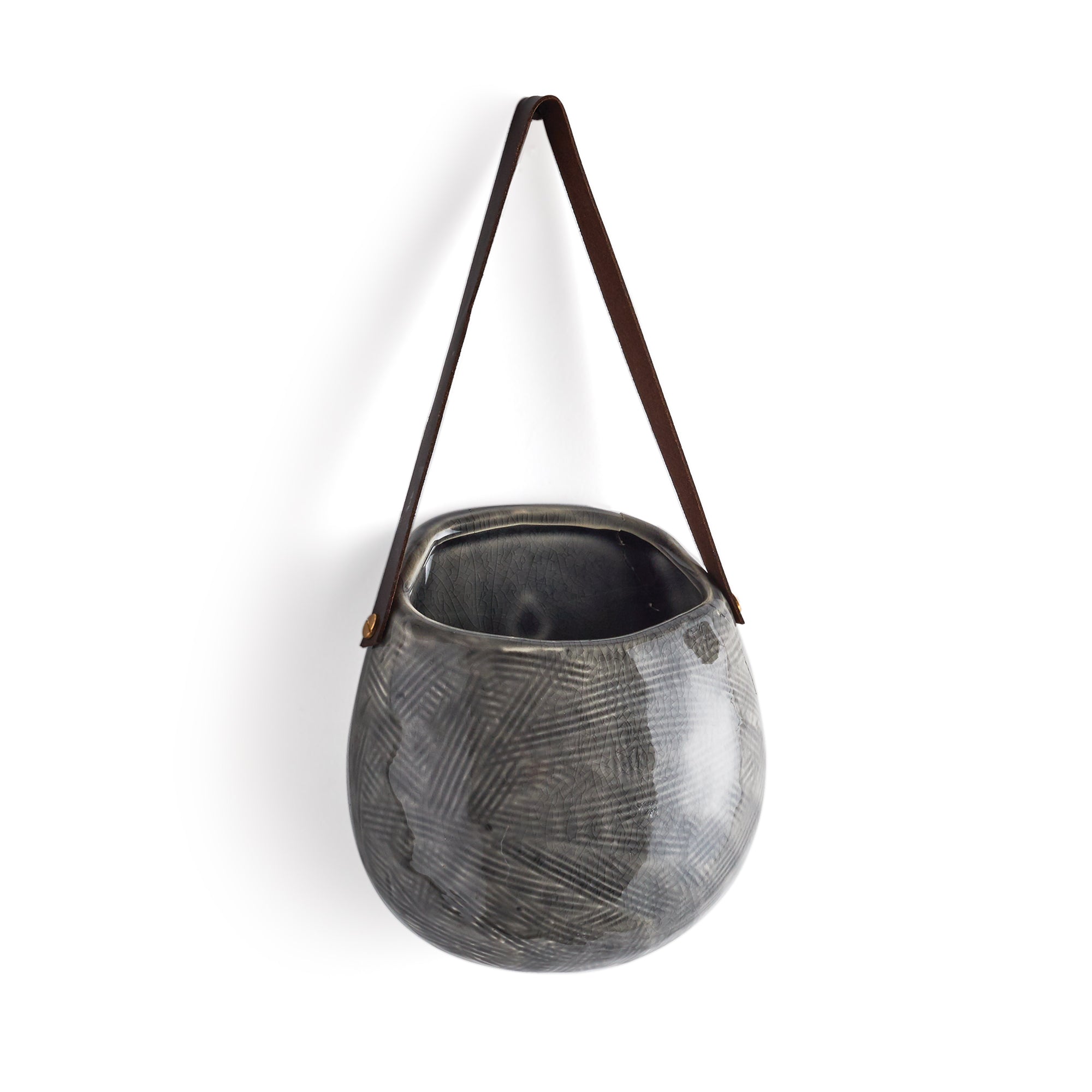 Perfect for the urban terrace, these colorful planters have a deep pocket and long leather strap. Ideal for featuring sumptuous orchid and a flowing tillandsia. Vertical gardening reimagined.