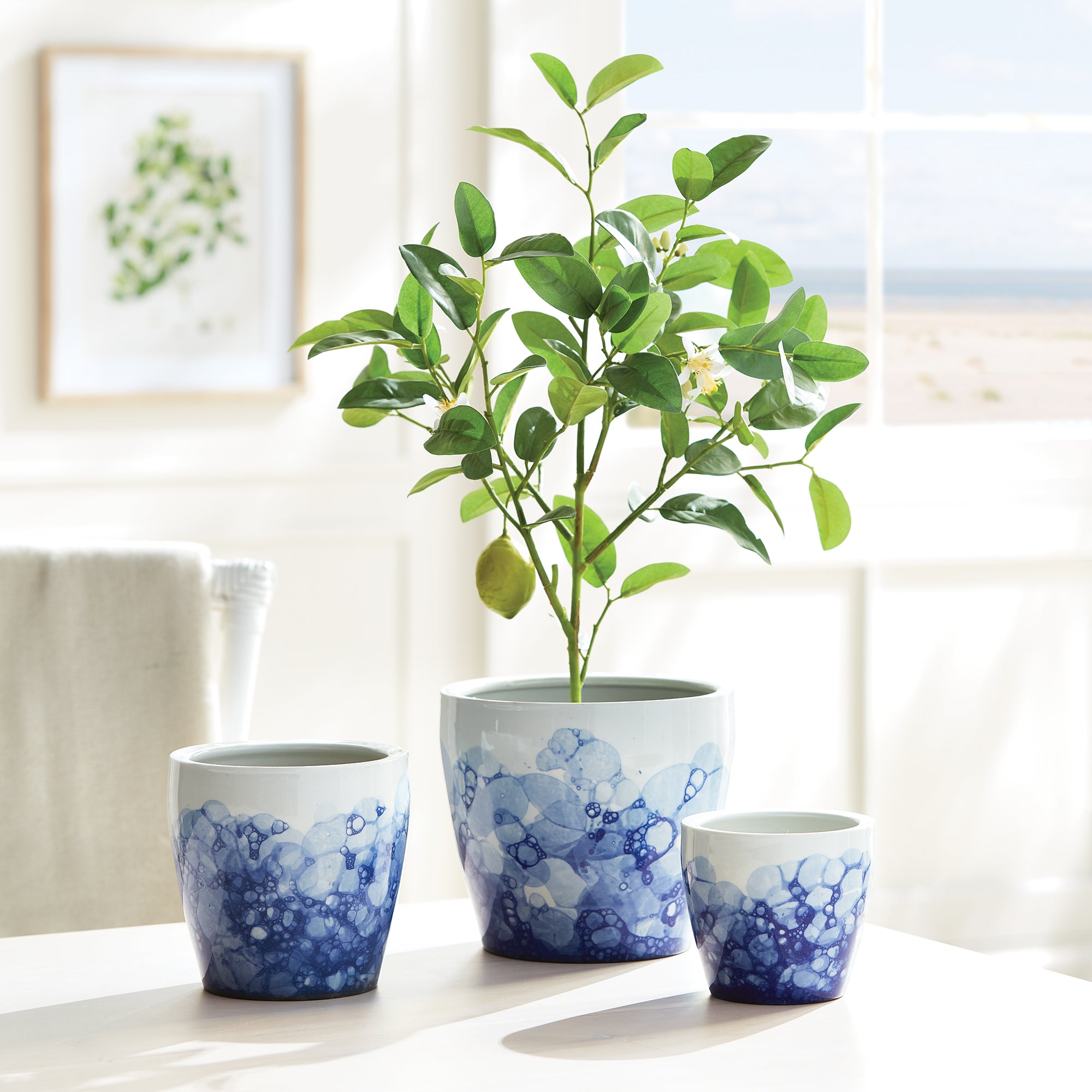 Artfully aqueous, this set of hand-painted pots capture the effervescent beauty of bubbly water. Expect variation within the sets as no two are exactly alike. A refreshing take on coastal décor, or any space needing a pop of blue.