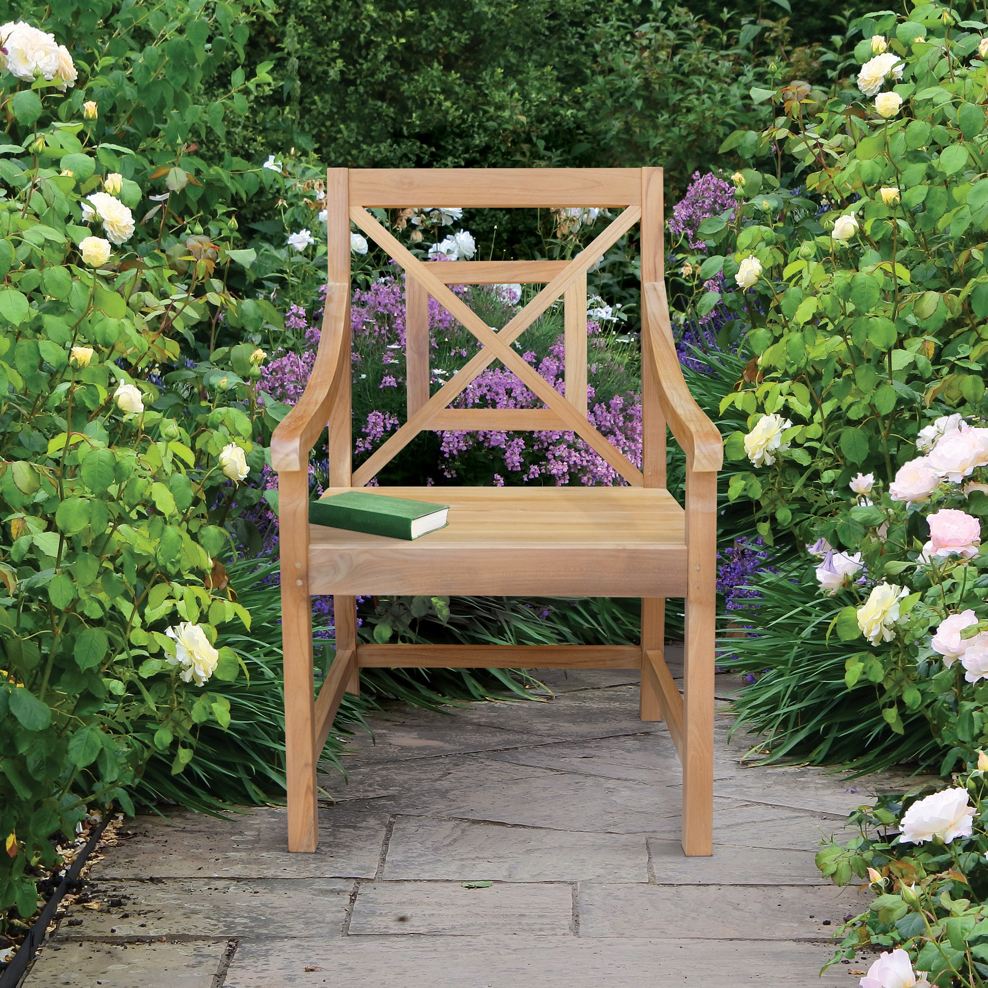 With a fretwork- inspired pattern, our exclusive Greenwich Garden Chair was designed to last. Made of solid teak, the finish develops a silvery patina over time. The slats of the seat are spaced apart for quick drying. A tranquil place to sit and enjoy the outdoors, wherever that may be!