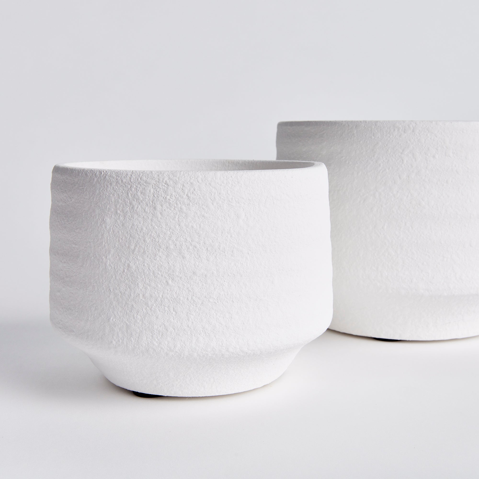 Simple in form with a modern aesthetic, these cachepots are the definition of less is more. Finished in a white matte glaze, they bring a calm, tranquil feel to any modern space.