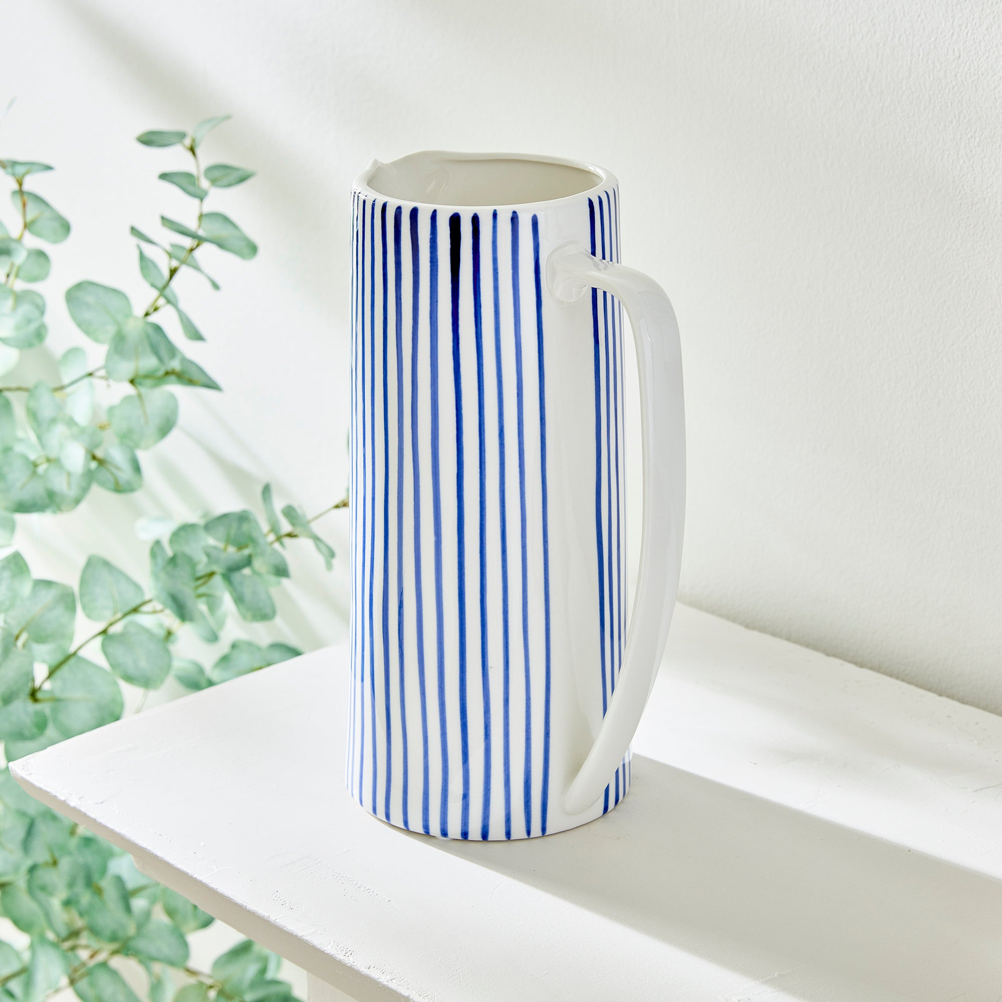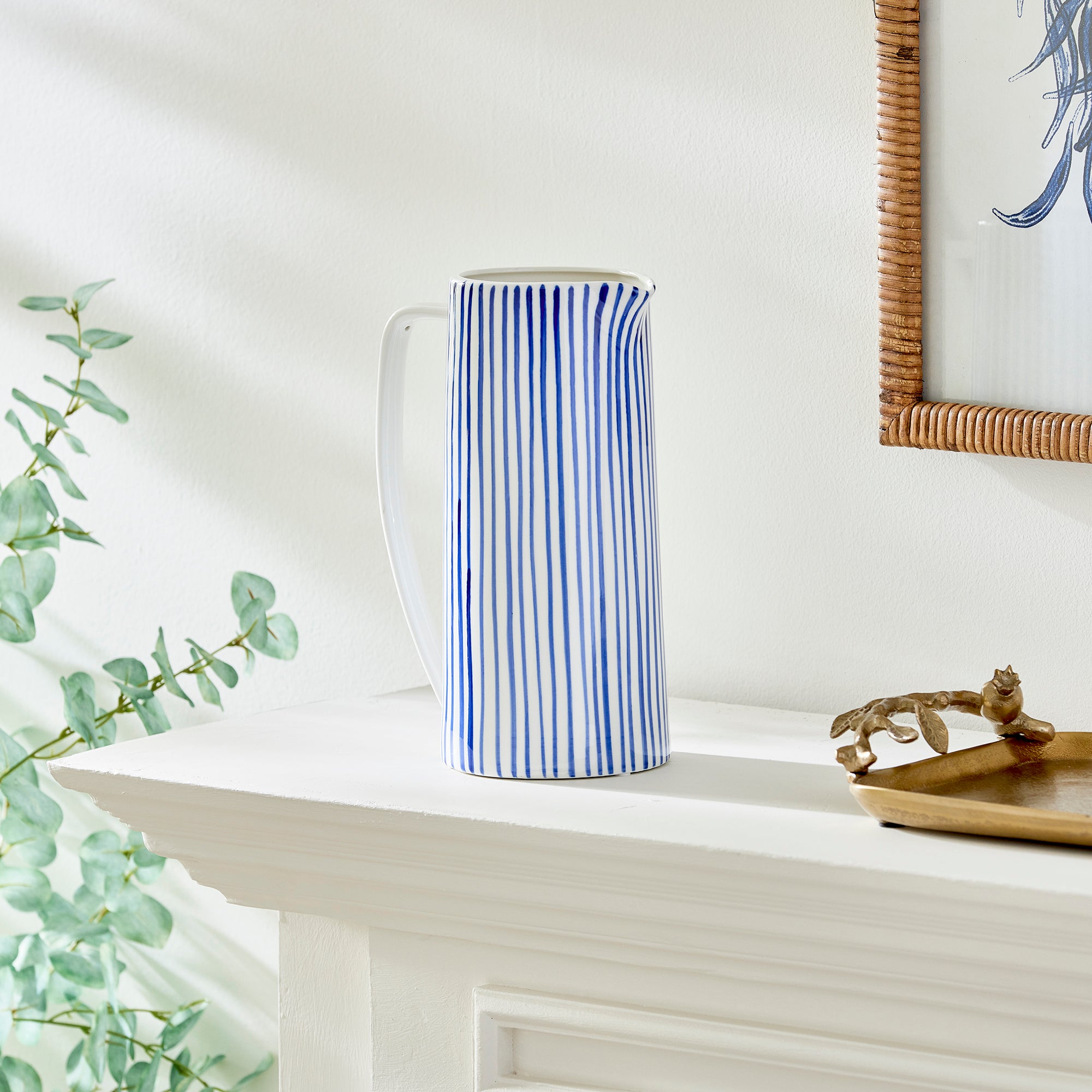 With a vertical hand painted linear pattern, this decorative pitcher adds a unique artisan's touch to kitchen or living space.