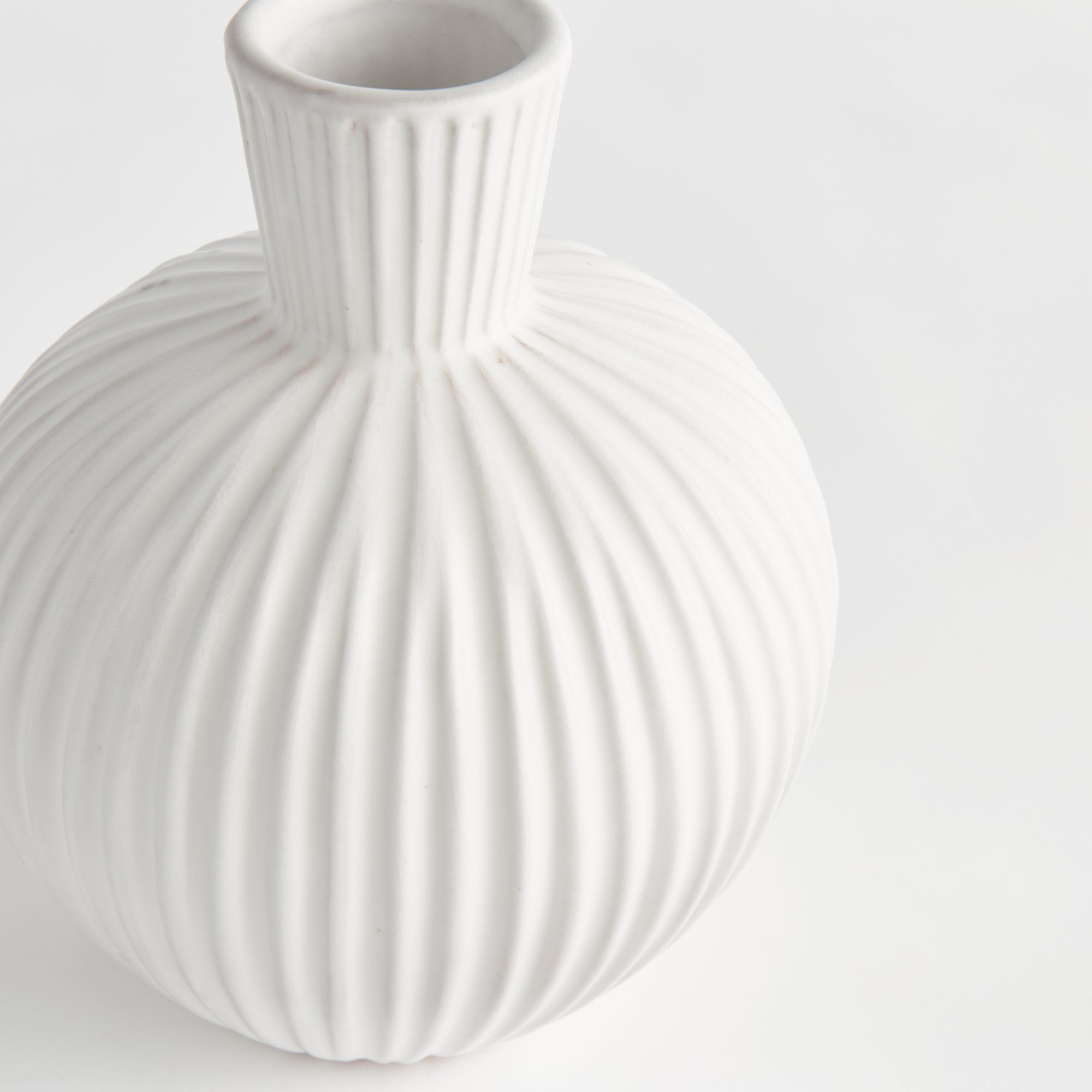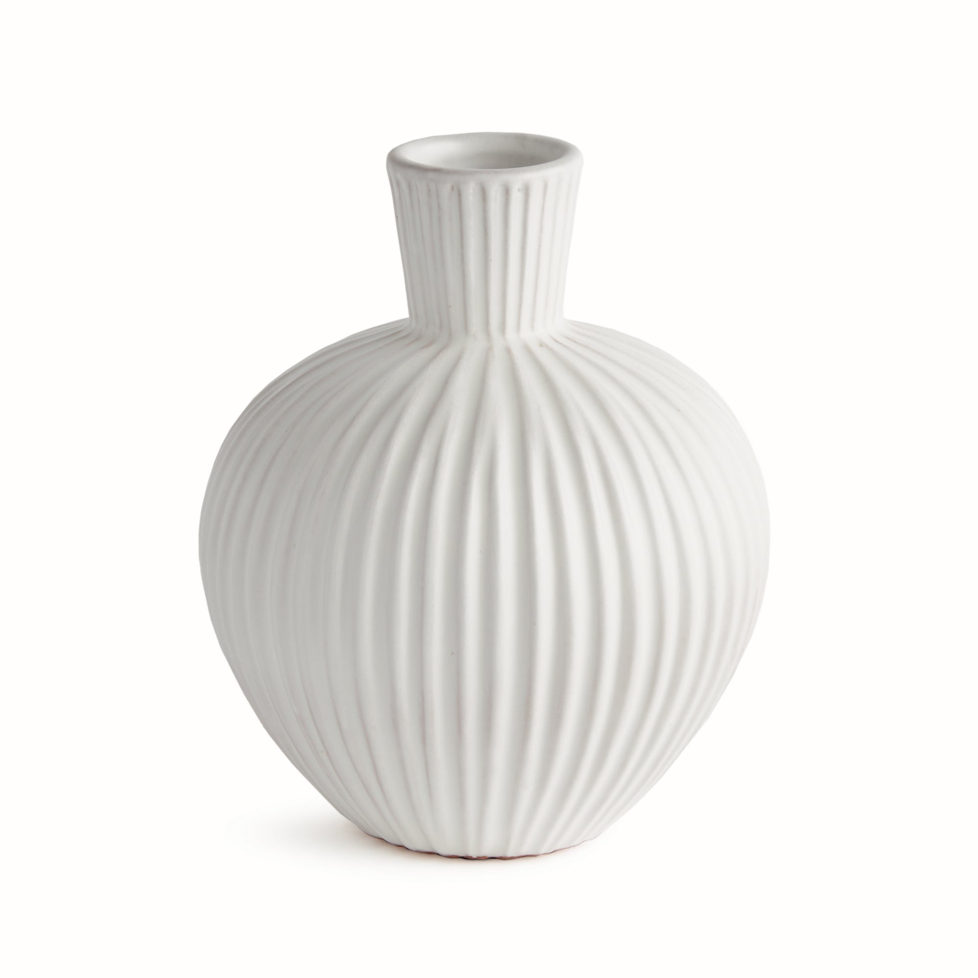 This bottle shaped, ribbed vase is a sweet little accent for bookshelf, desk or kitchen counter. Add a single faux stem for a pop of color.