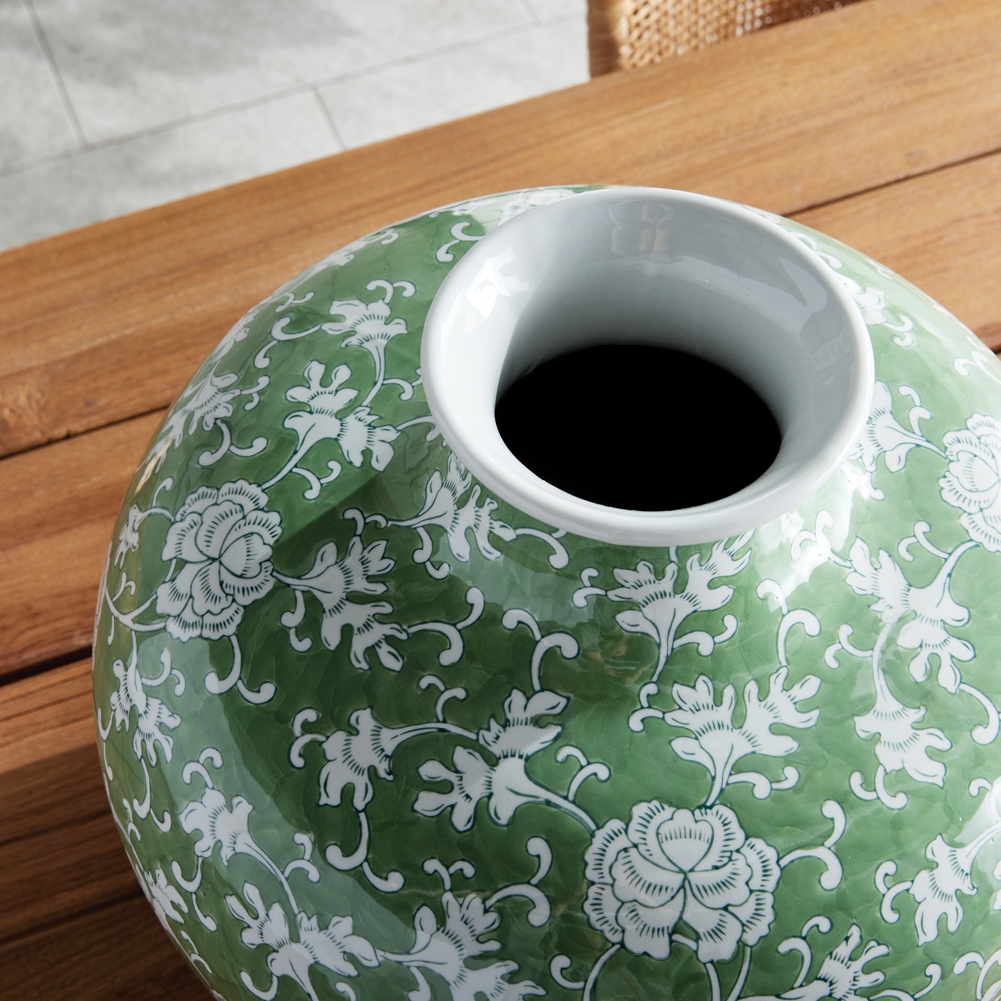 A classic chinoiserie vase in shades of green & white. How refreshing! The color green is known to have a harmonizing, balancing effect, and is an inspired design choice for this lidded jar. A welcome addition, adding stability and calm to the well-appointed bookshelf, mantel or entry console.