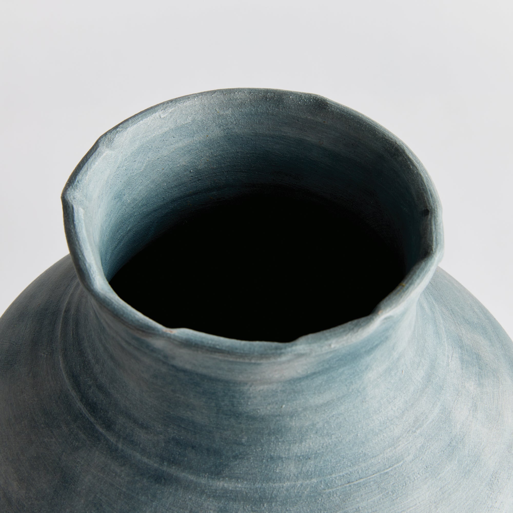 Hand thrown and perfectly imperfect, this terracotta vase brings the character. With subtle horizontal ribbing that shows through the gray-blue uneven matte glaze, It makes a lovely accent tucked in a bookshelf, or featured on a mantle or console.