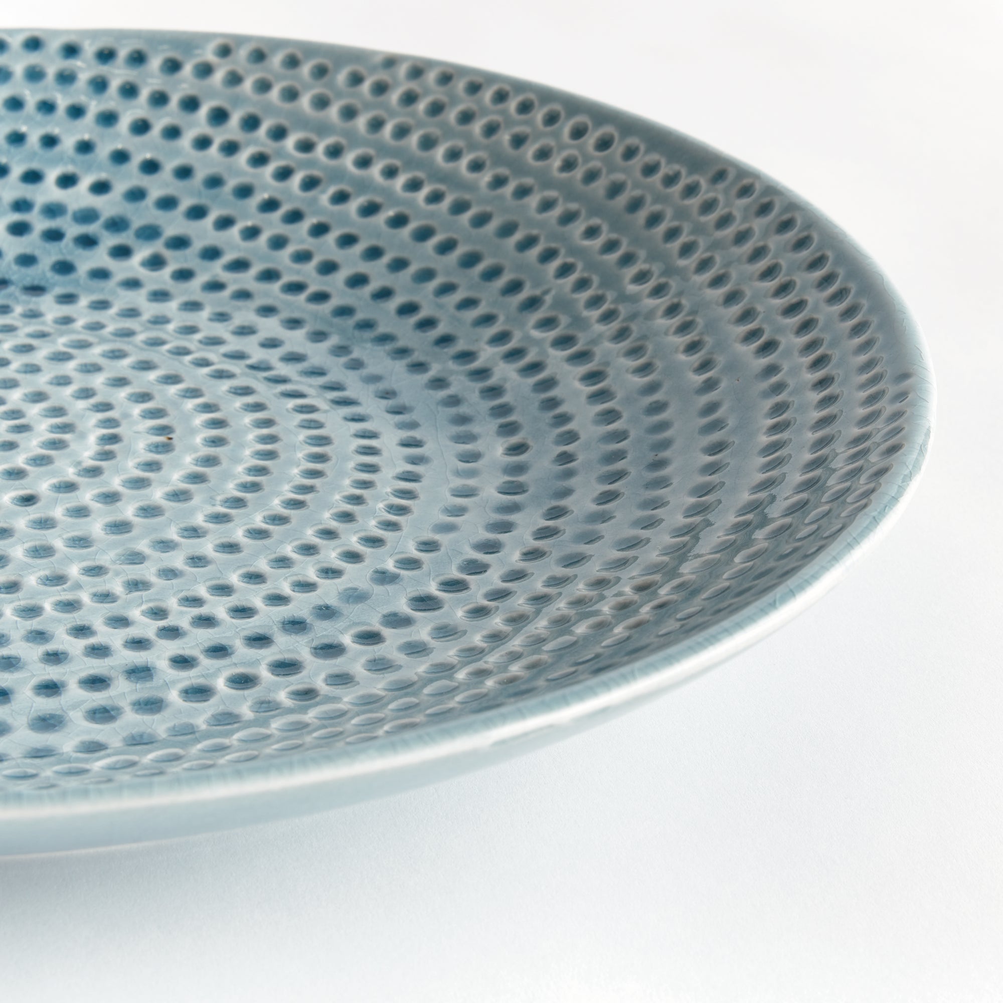 This decorative ceramic plate with a dynamic reactive glaze features a highly textured organic dot pattern that is intentionally off-center. A modern, sophisticated accent that adds a pop of subtle blue. Place on kitchen counter, or tucked into a bookshelf for added interest.