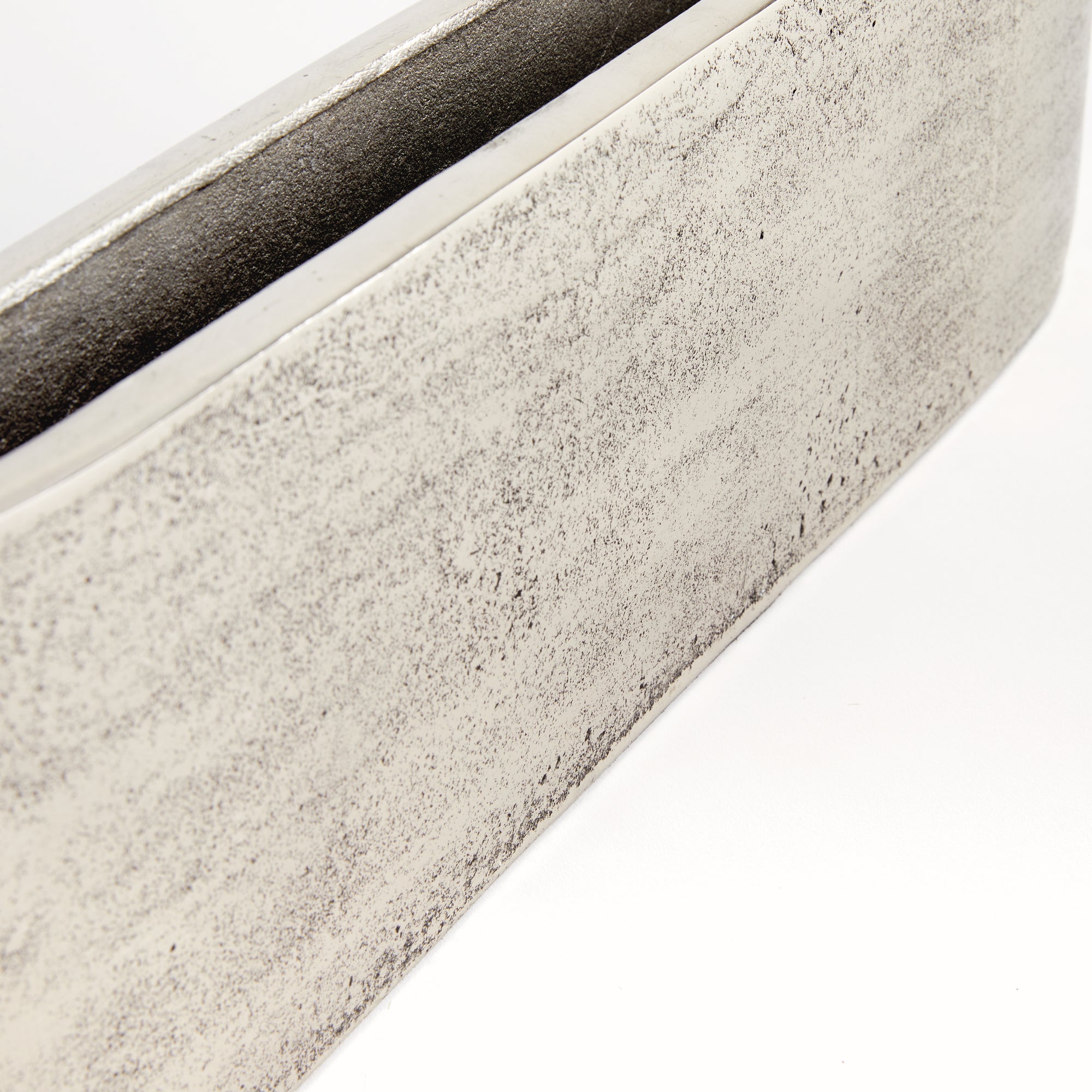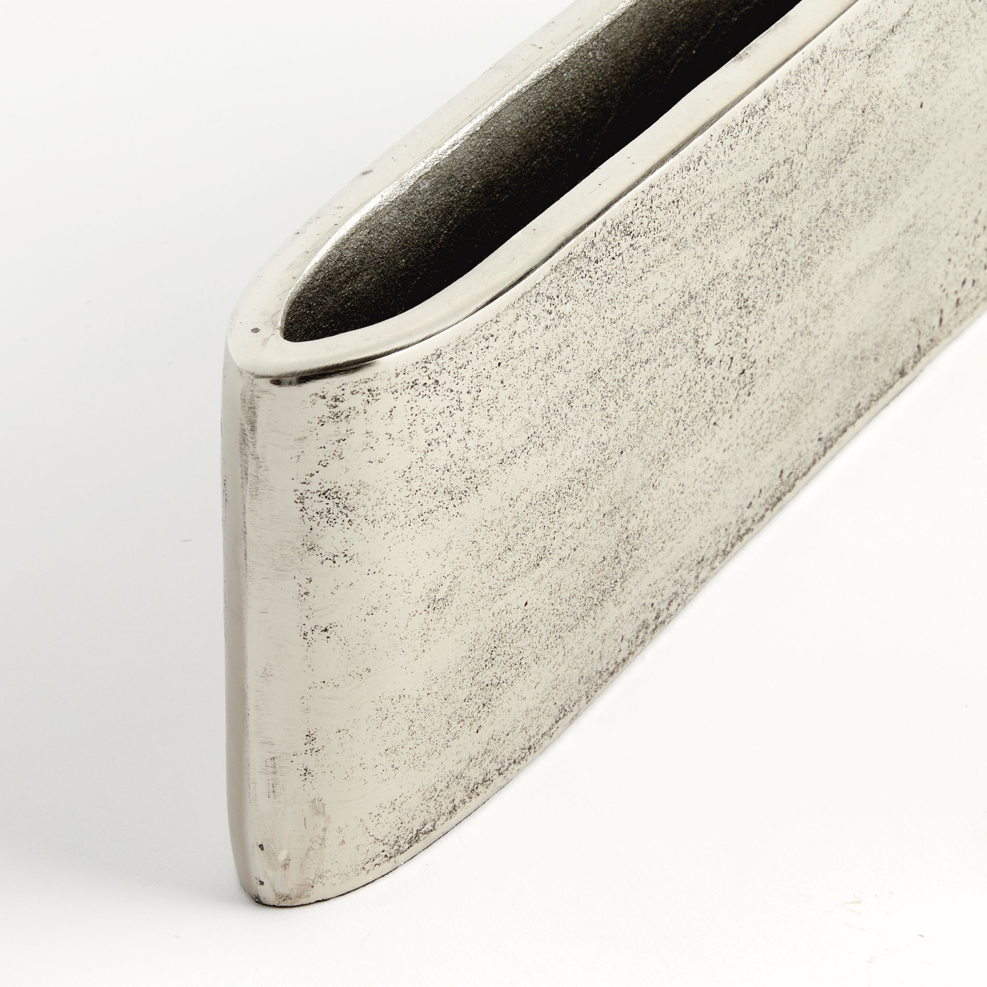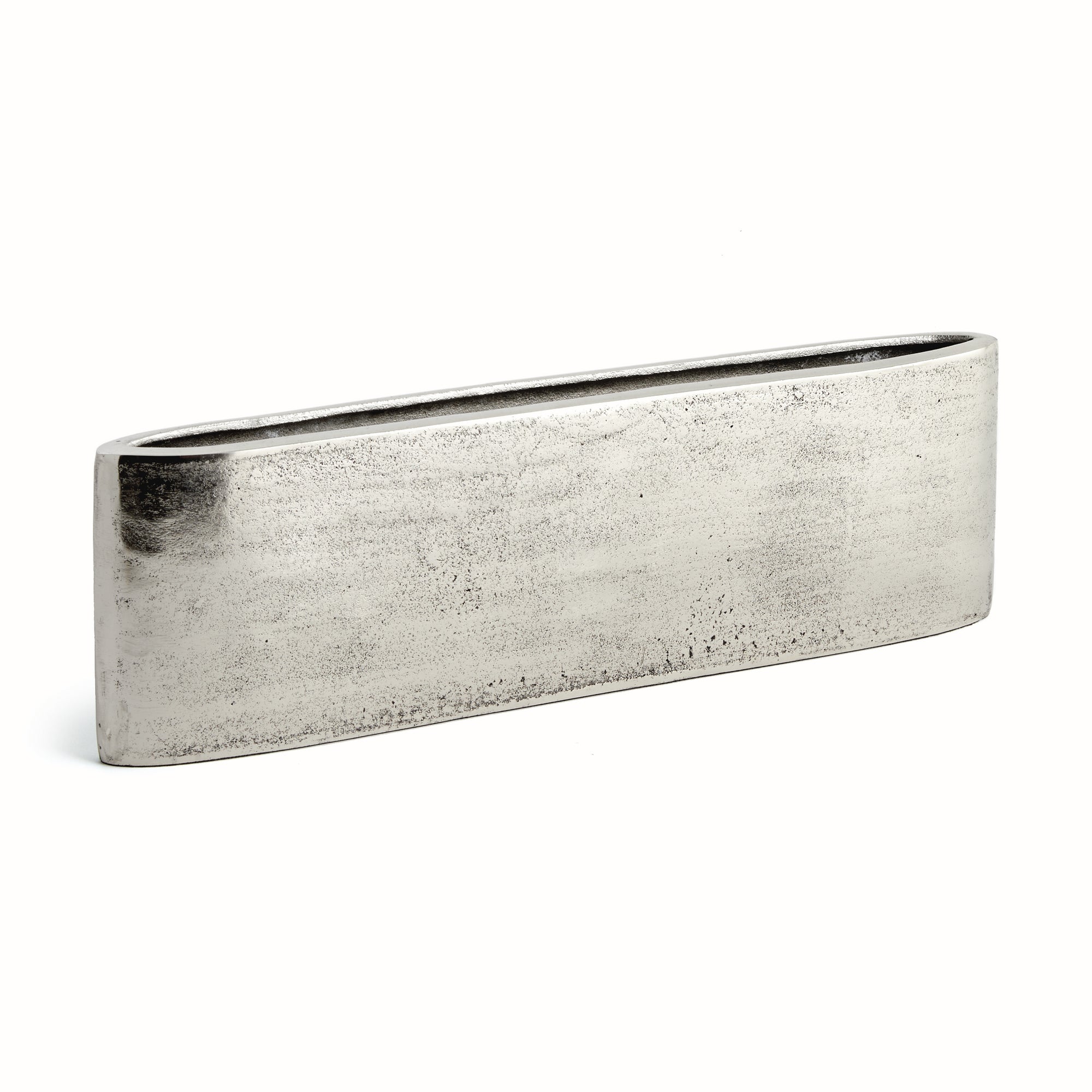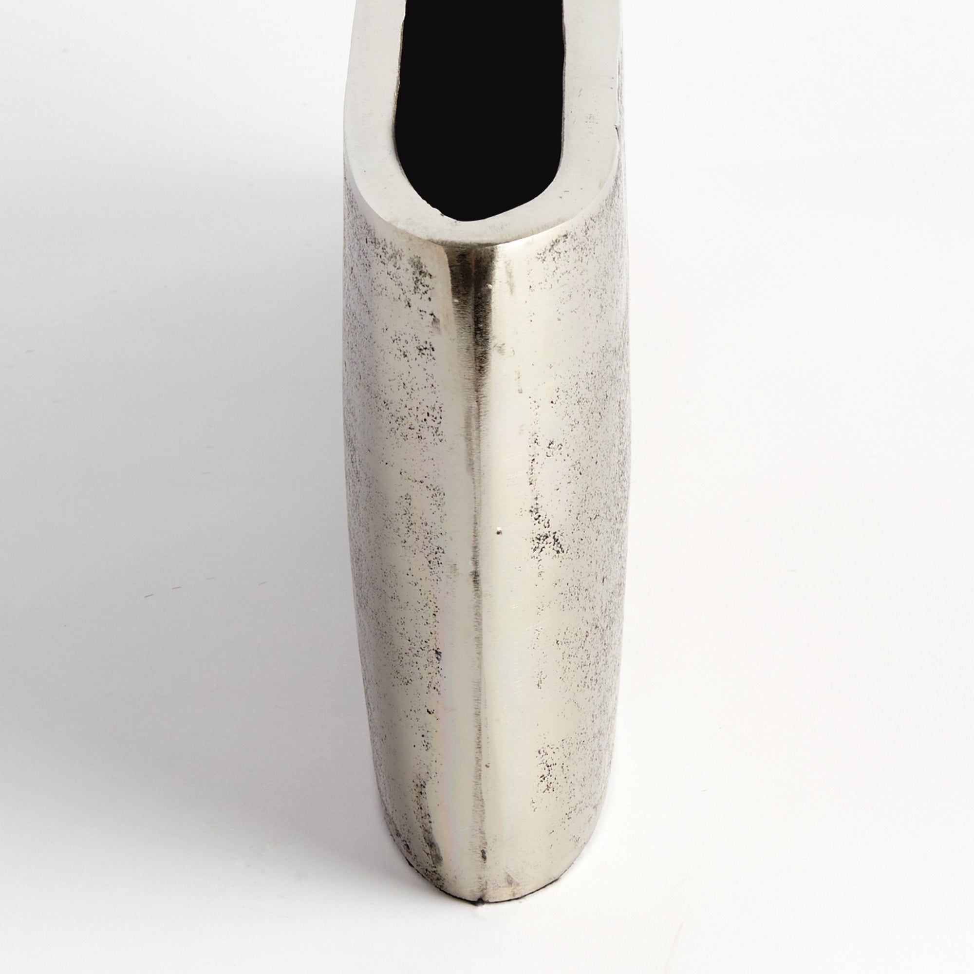 With an unexpectedly long and narrow shape, this abstract metal vase is made for the contemporary space. Well-scaled, with an organic rim, it makes an intriguing centerpiece for fresh blooms. Perfect for a dramatic tablescape, the possibilities are endless!