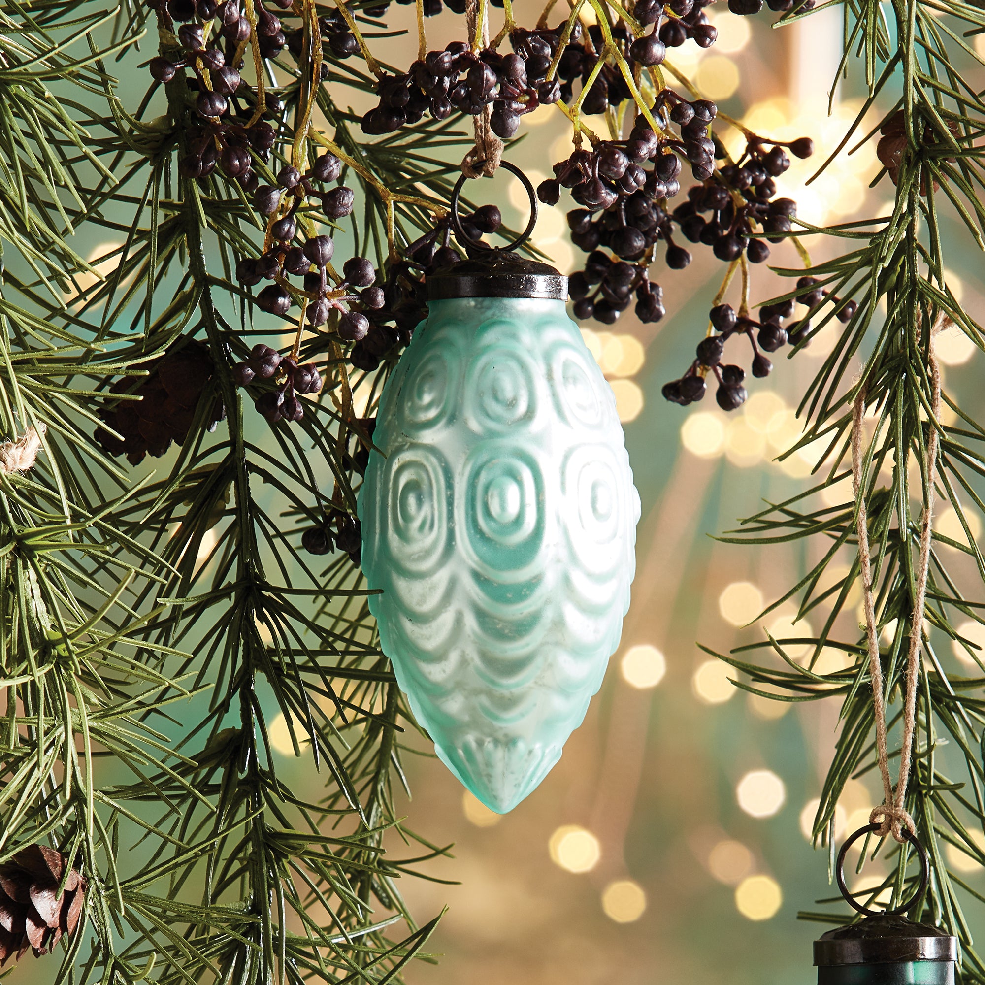 In a cool celadon and matte finish, this traditional ornament has earned a spot on the tree. The rusted metal accent & jute tie give it a casual look.