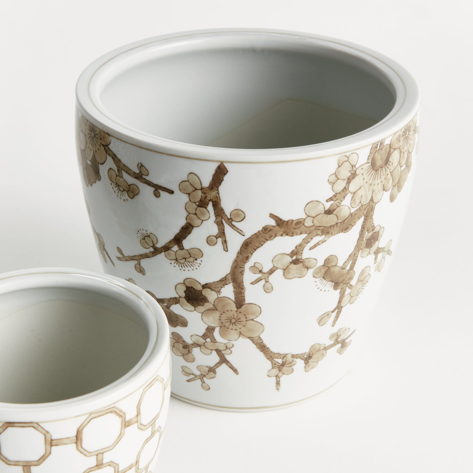 Classic chinoiserie-inspired coordinating patterns in taupe and white. In design, taupe is often associated with muted, sophisticated qualities. It evokes balance and timelessness. A tone that plays well in any palette, and is an inspired design choice for this set of 3 flower pots. A beautiful complement to your favorite greenery, herbs or florals.