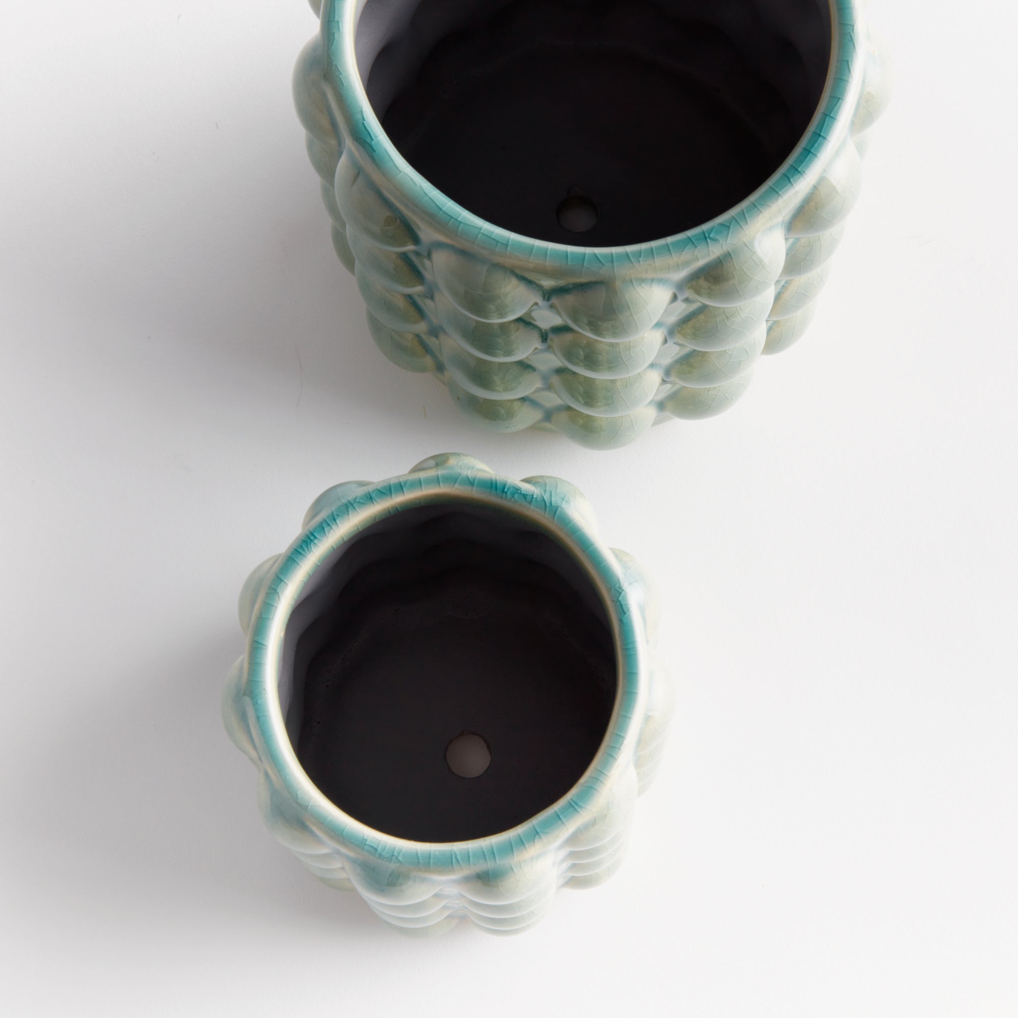 This whimsical set of pots features tight rows of repeating 'bubbles' and is finished with a shiny, reactive glaze. A playful yet contemporary way to display your favorite herbs, flora or fauna.