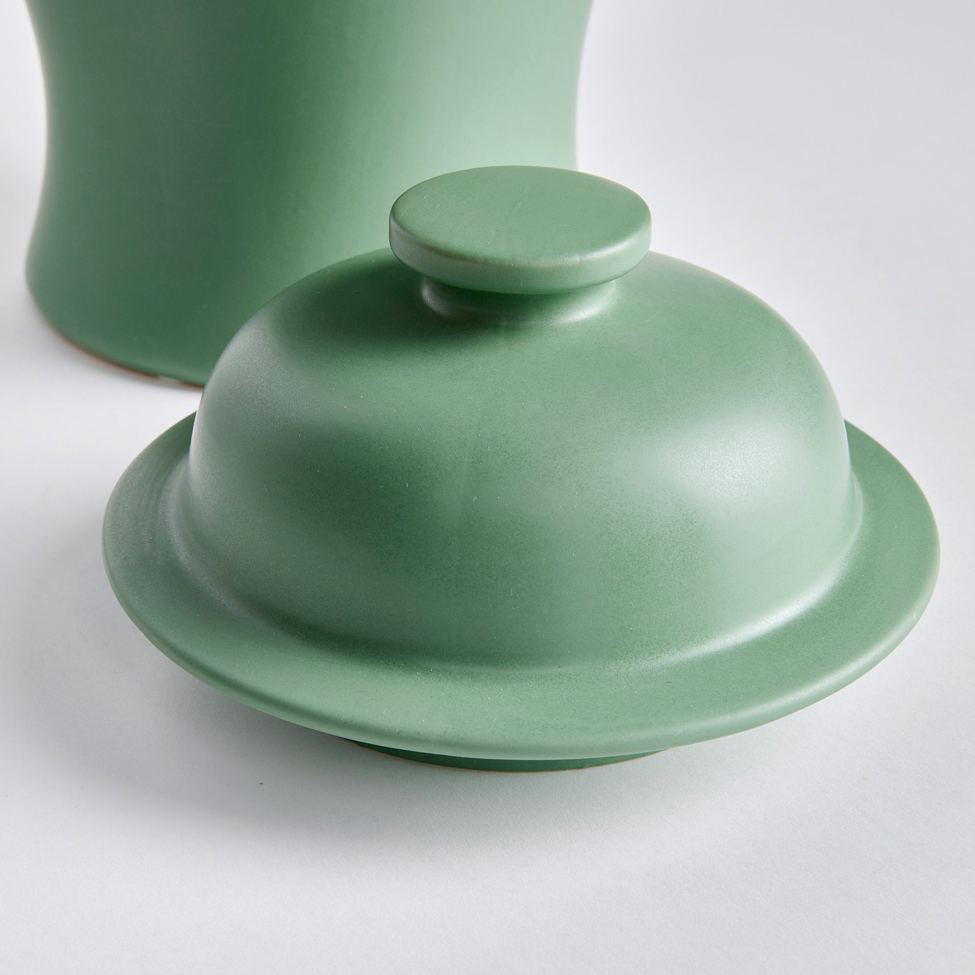 In an unexpected matte finish for traditional ginger jars, this is a modern take on a classic. The soft green tone adds balance and calm. Mix in among your patterned pieces in bookshelf or on a credenza for a dynamic look.