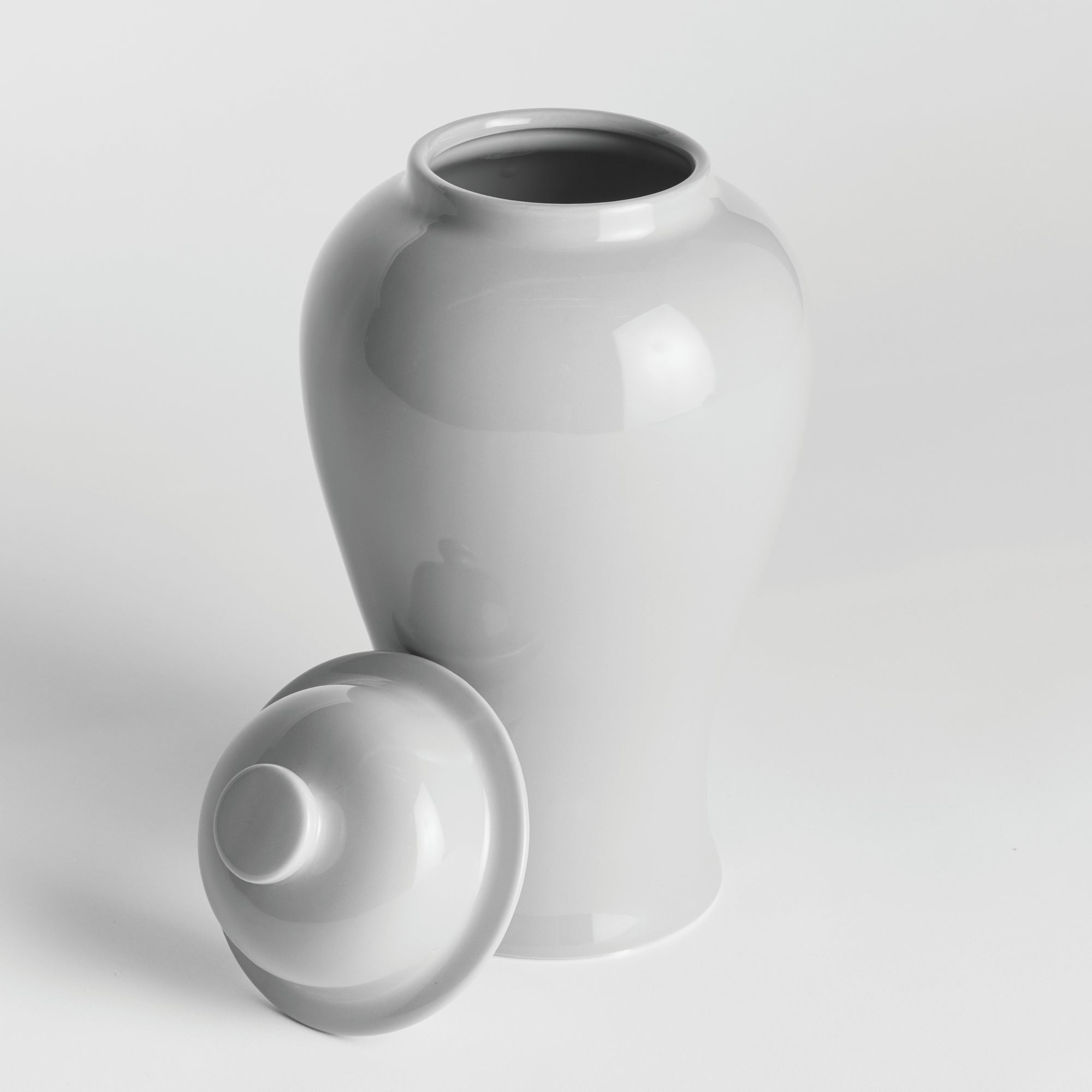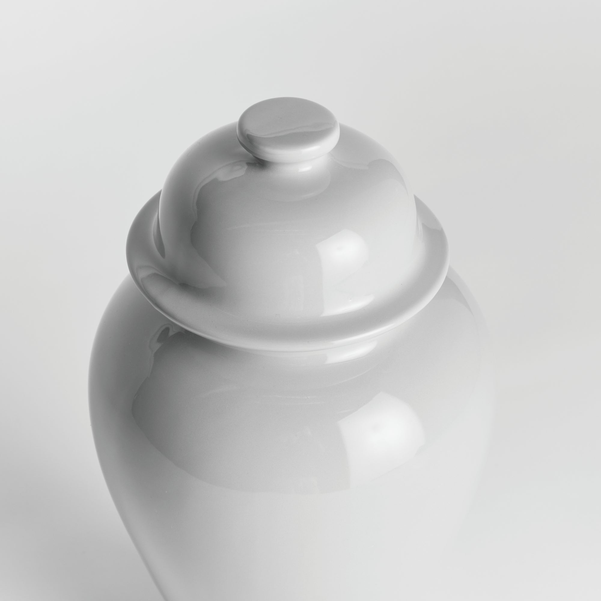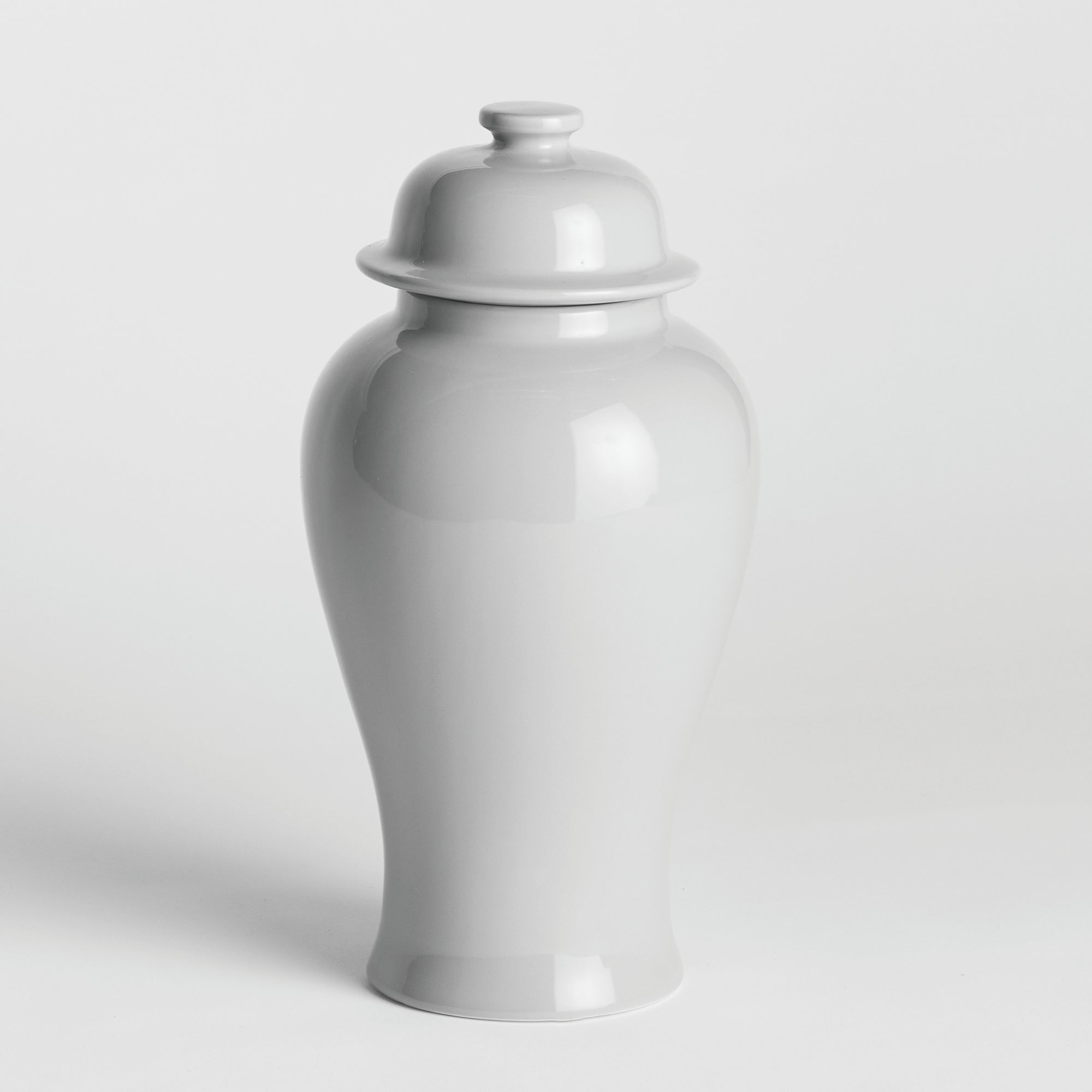 In an unexpected mini size for traditional ginger jars, this is a modern take on a classic. The bright white high gloss glaze creates a more high end feel. Mix in among your patterned pieces in bookshelf or on a credenza for a dynamic look.