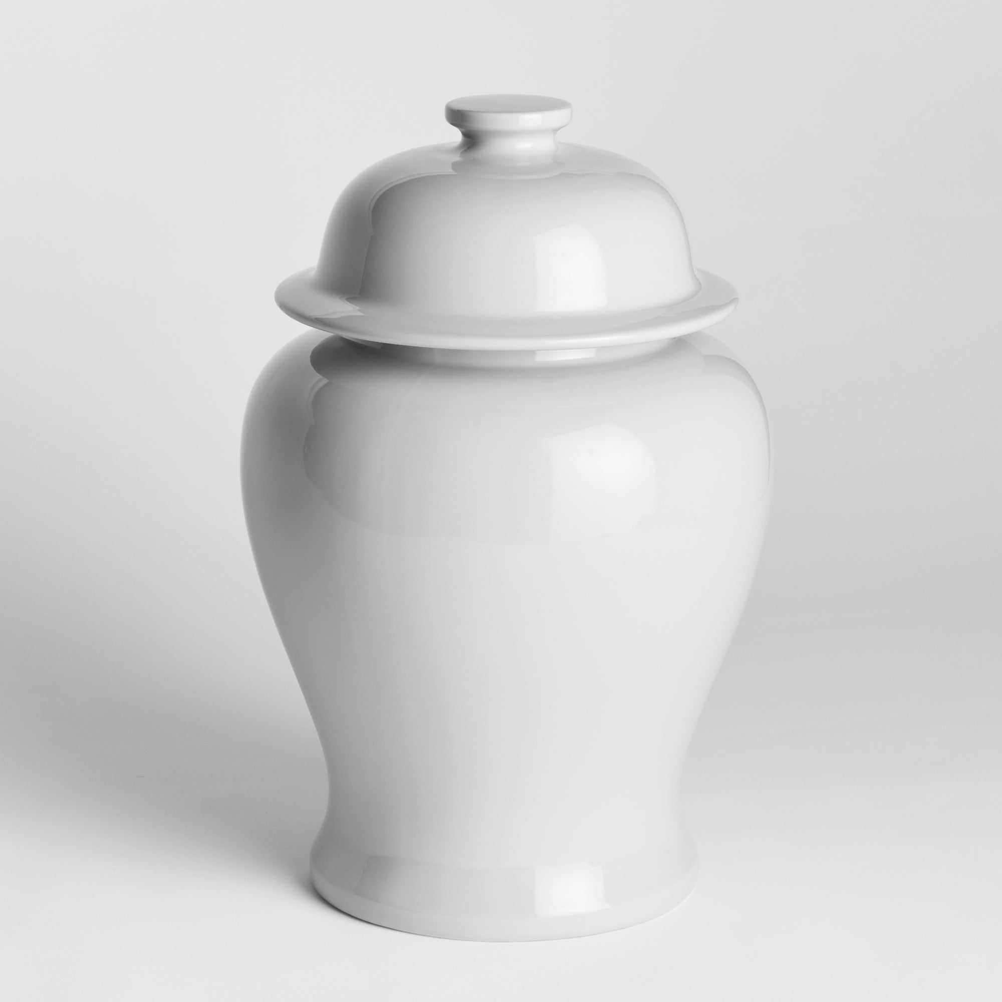 In an unexpected smaller size for traditional ginger jars, this is a modern take on a classic. The bright white high gloss glaze creates a more high end feel. Mix in among your patterned pieces in bookshelf or on a credenza for a dynamic look.