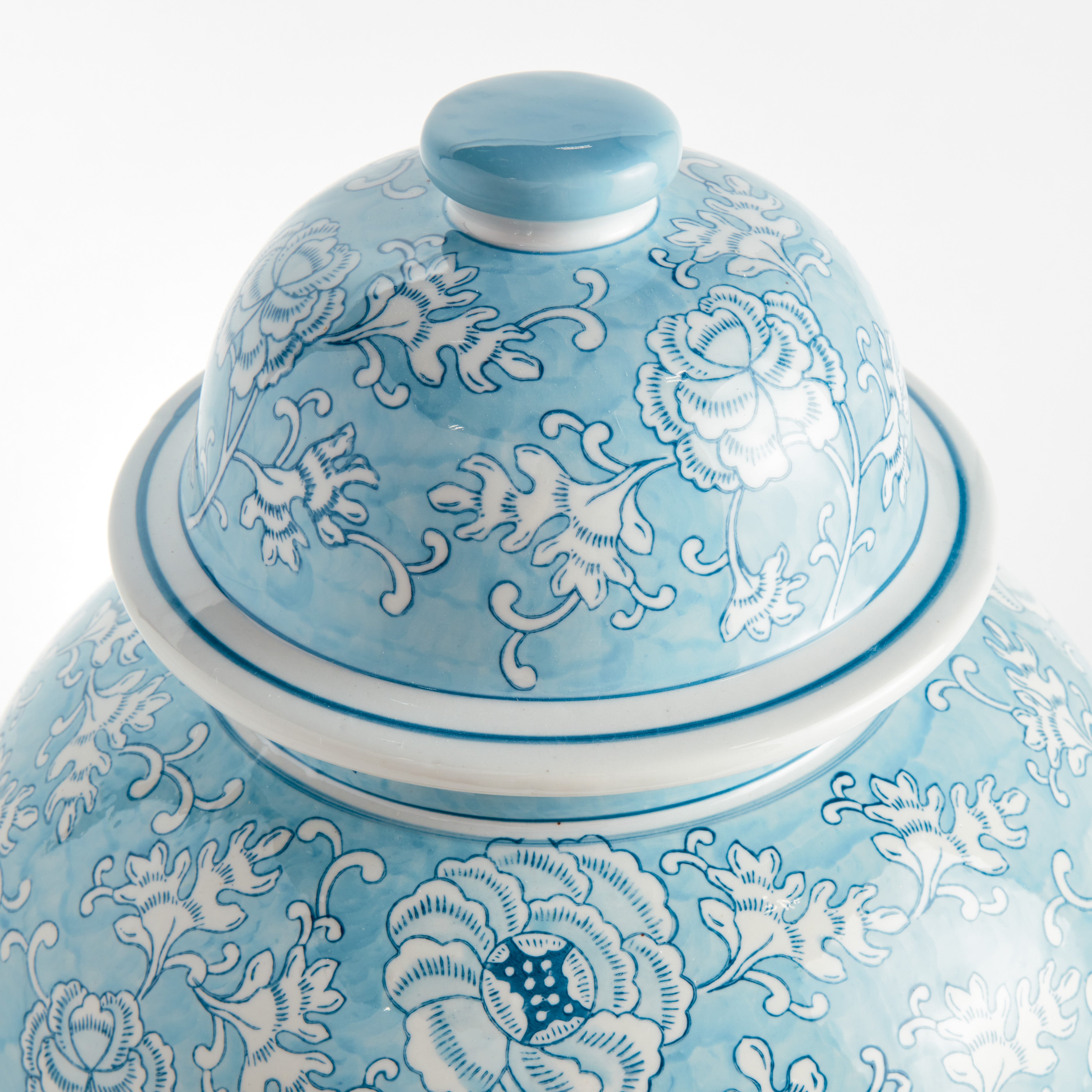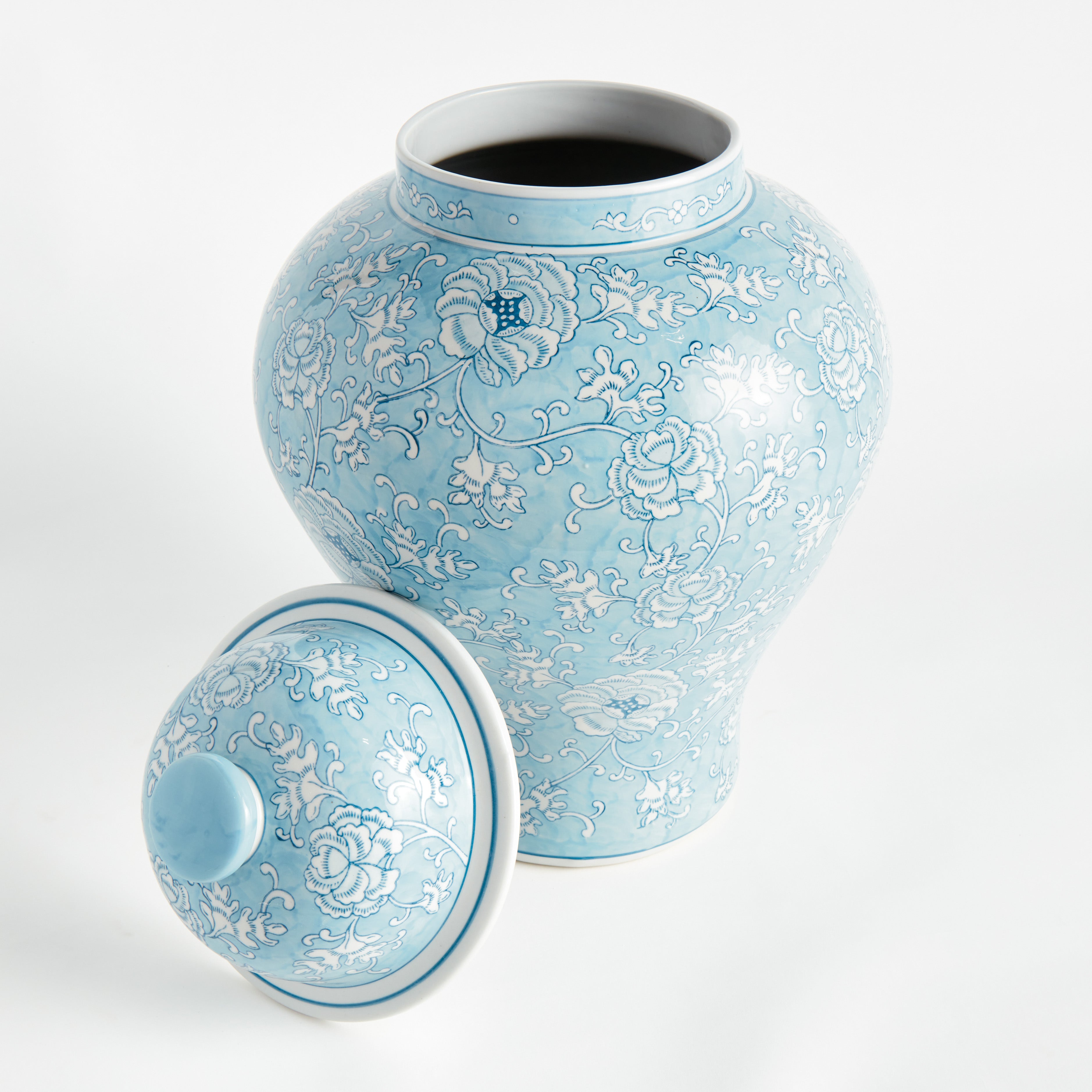 Our signature chinoiserie in an ethereal soft blue. A light, airy tone taking a cue from an on-trend, fashion forward color palette. This porcelain is painted by hand and hand-stamped, and the result is exquisite. Fill with some faux floral stems, or display as is for a distinctive, feminine look.