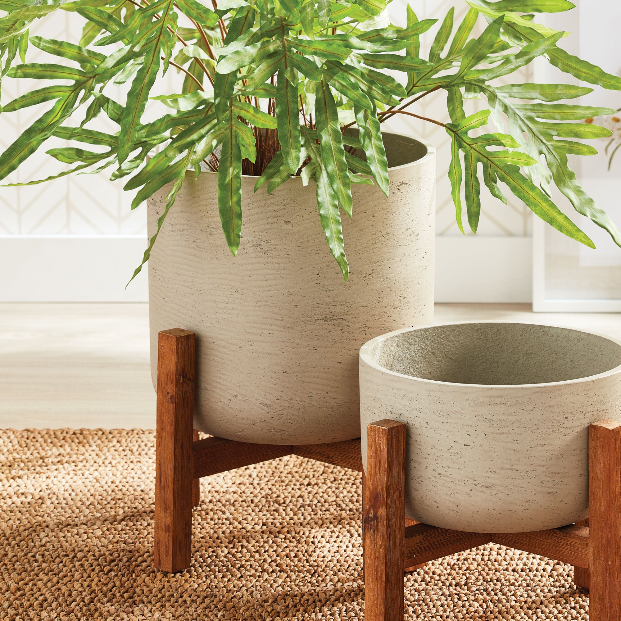Made of a lightweight concrete and supported by simple acacia wood stands, these large scale pots are designed for the modern industrial space.