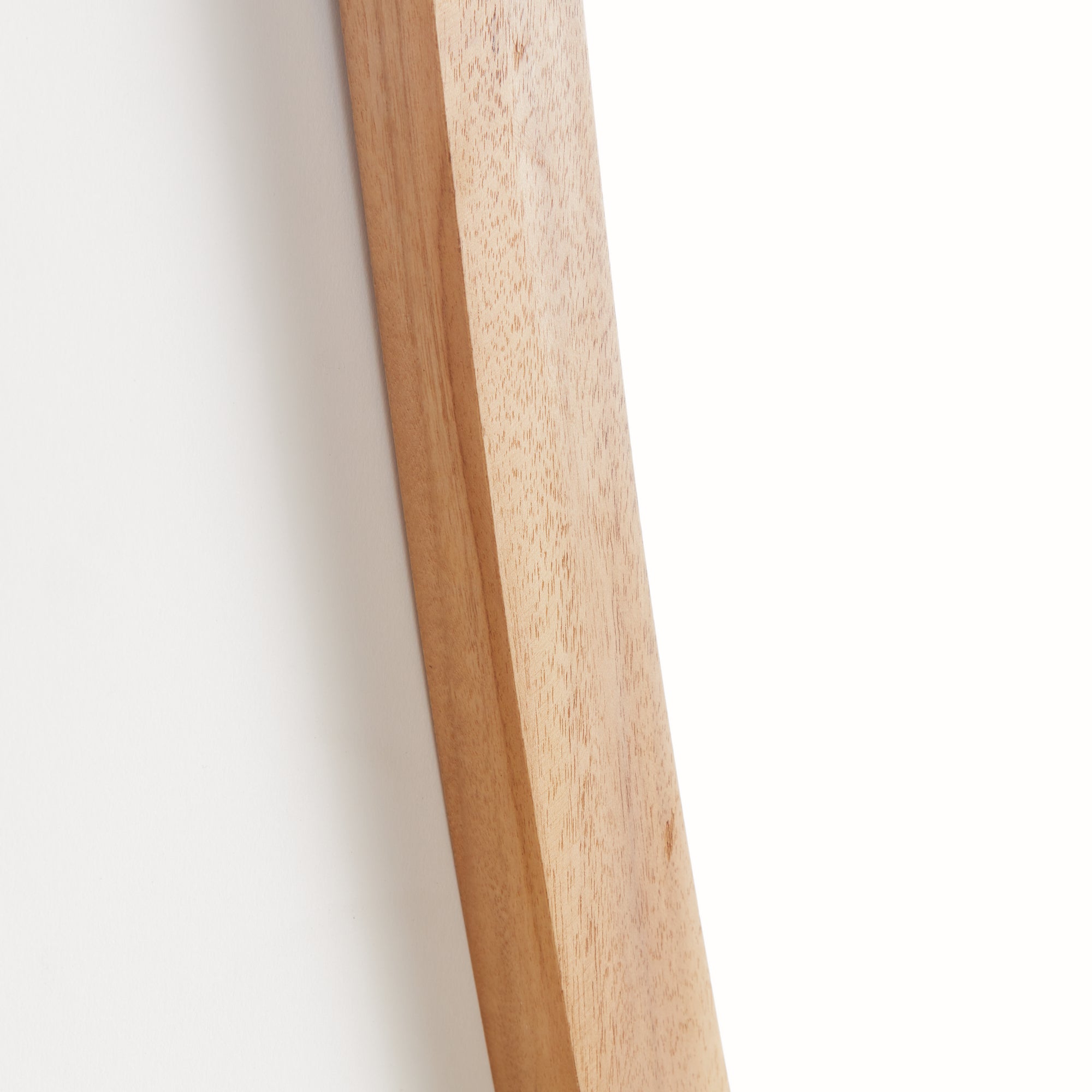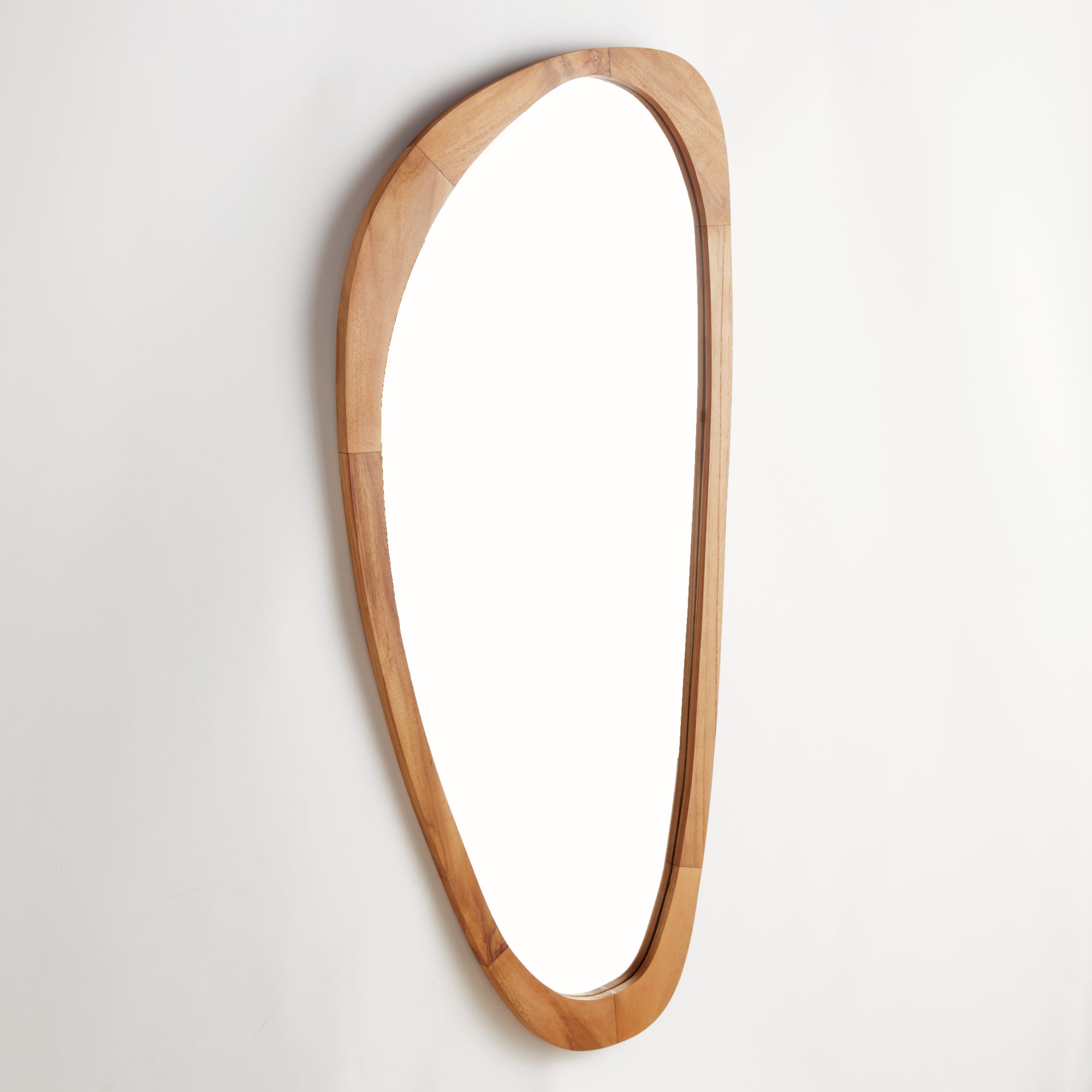 This well scaled mirror is framed with a teak wood. A beautiful grain with a smooth, honed finish. With it's unique elongated shape, it is a contemporary casual accent made for powder room, entry hallway or study. Designed with a keyhole for hanging.