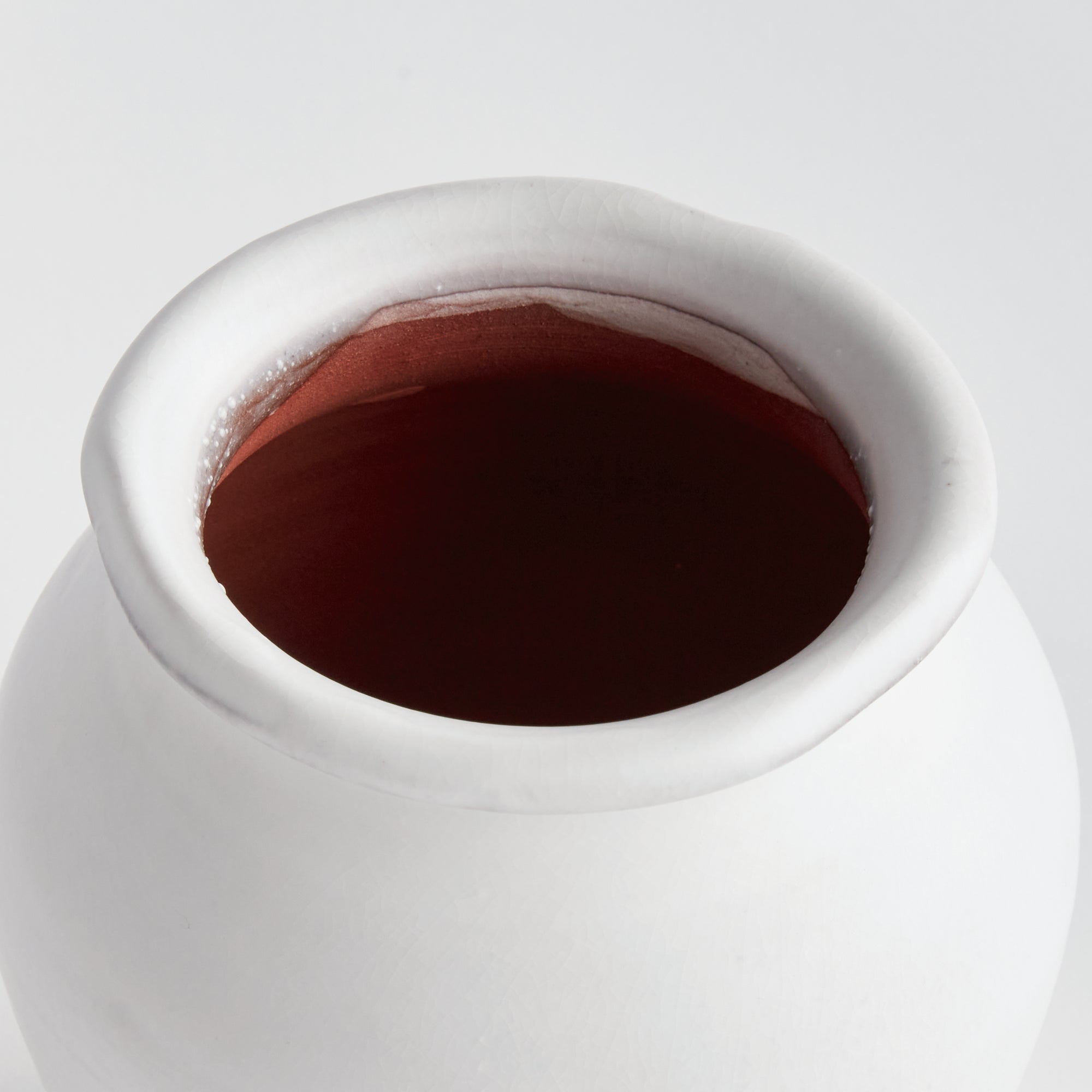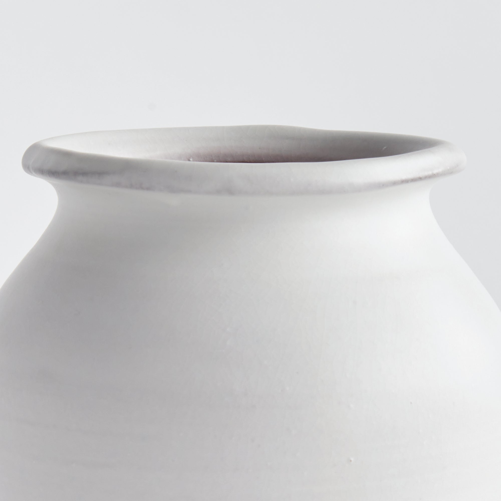 This hand-thrown terracotta drum vase is finished with a warm white glaze and has visible throw lines which only add to its character. Well-scaled for a stunning tabletop moment, add some colorful faux stems or simply beautiful displayed as is.