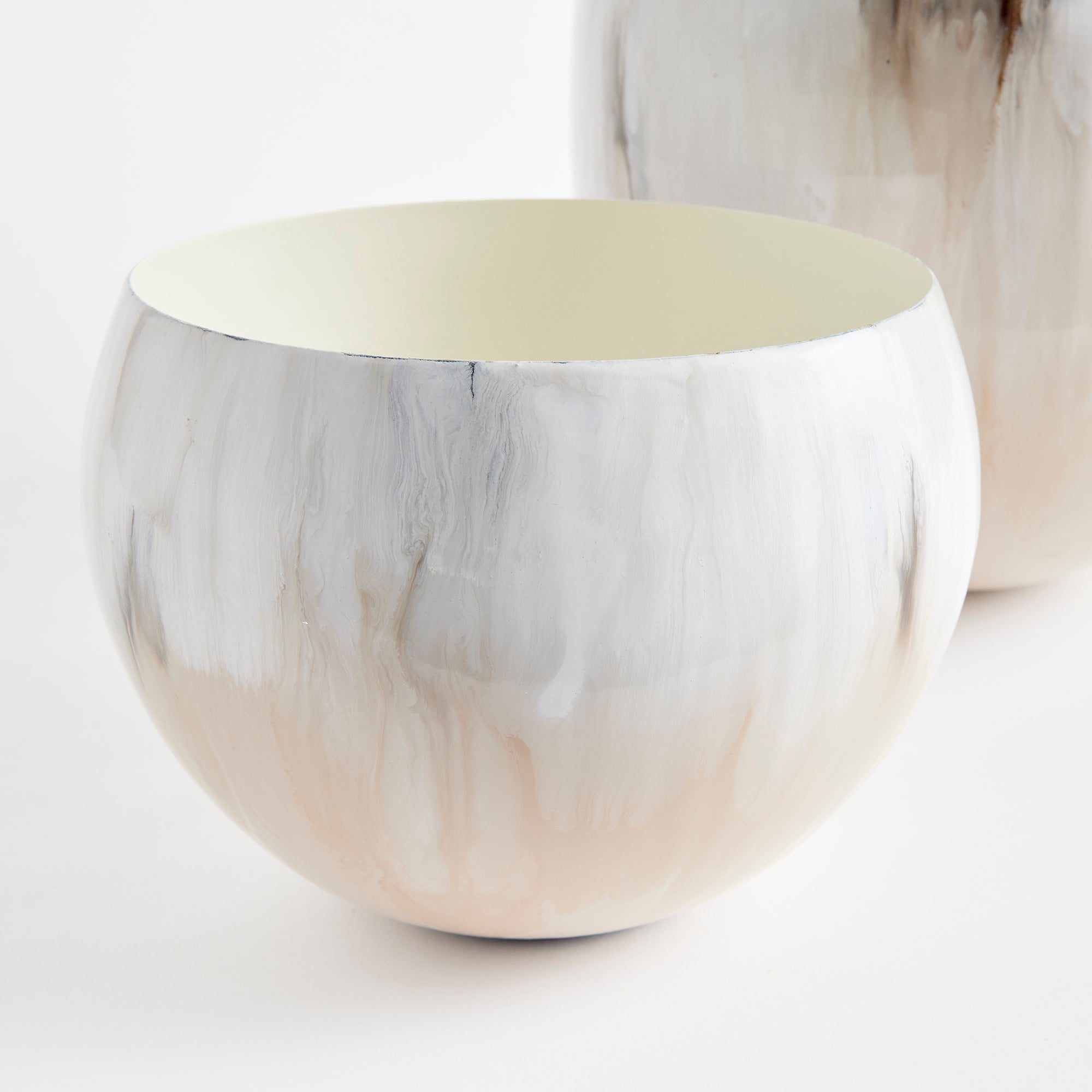 In a clever use of enameled iron, these lightweight cachepots are painted by hand. With a creamy mocha palette inspired by a latte, with layers of milky froth and coffee tones swirling, it is modern artistry defined.