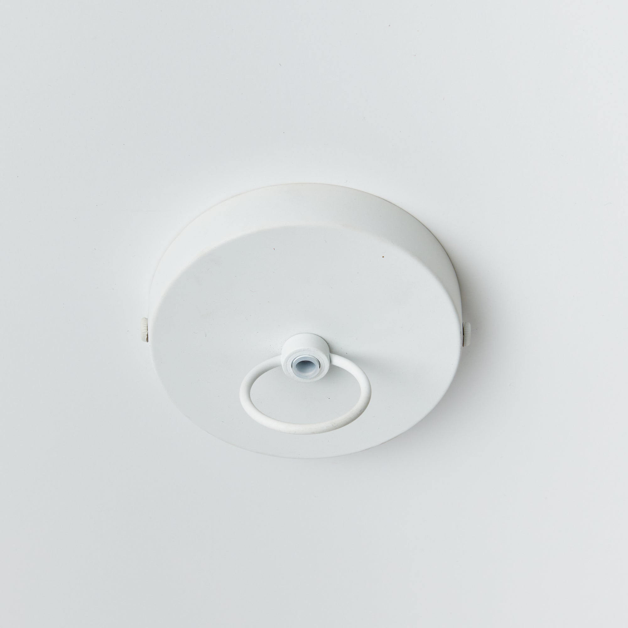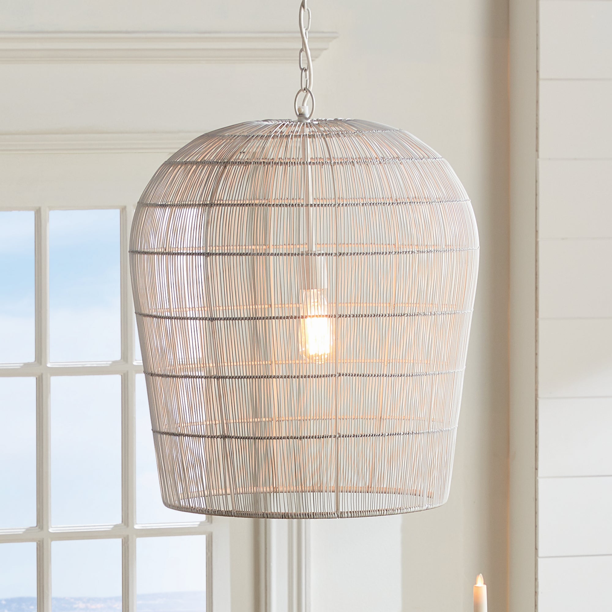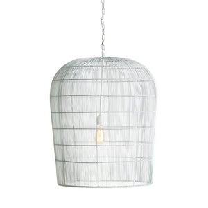Delicate white matte metal strands are tightly woven around a solid iron frame in grand scale. The open spaces create a symphony of light. Perfect for kitchen island or foyer.