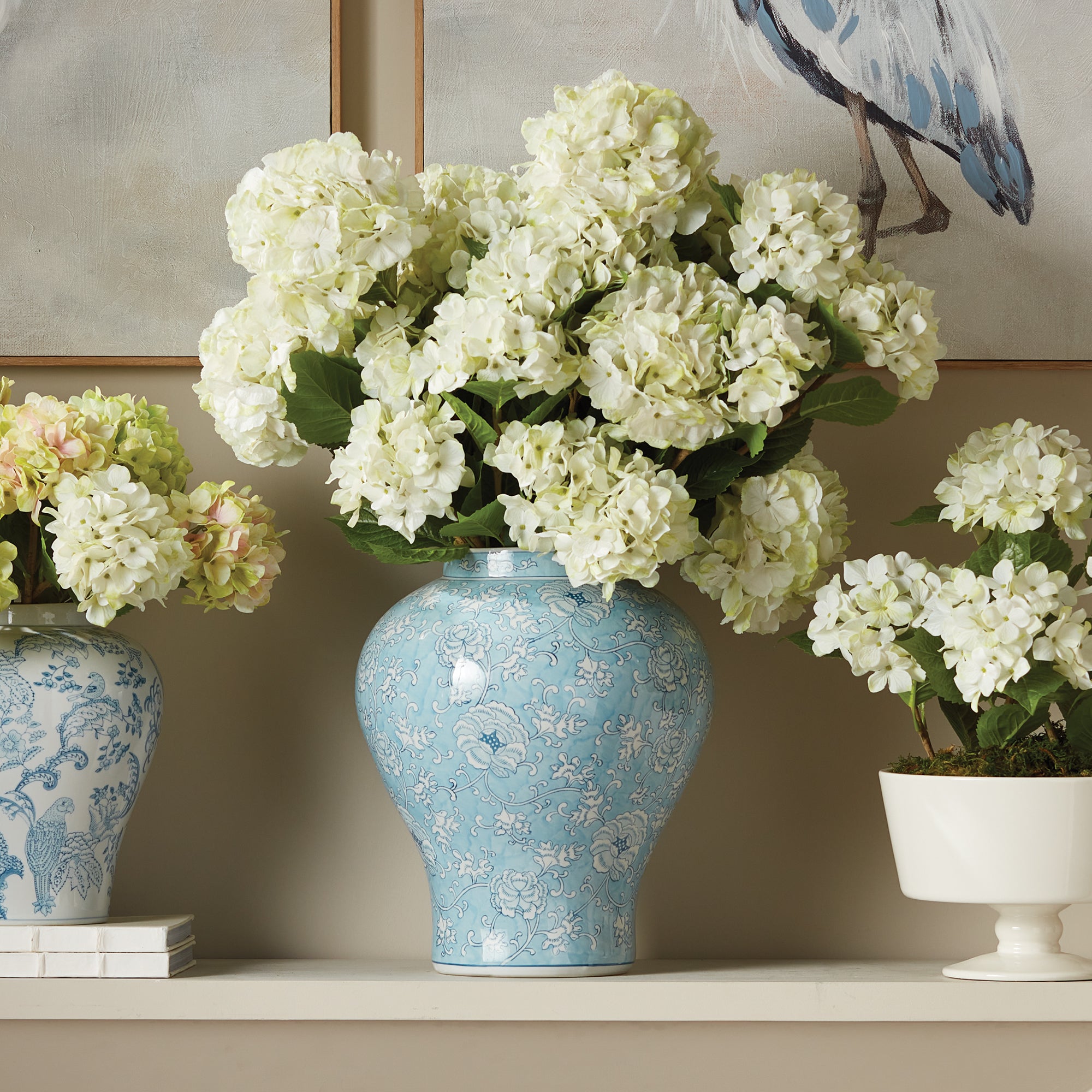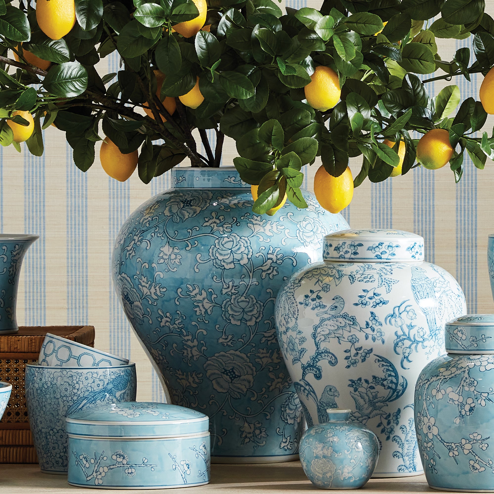 Our signature chinoiserie in an ethereal soft blue. A light, airy tone taking a cue from an on-trend, fashion forward color palette. This porcelain is painted by hand and hand-stamped, and the result is exquisite. Fill with some faux floral stems, or display as is for a distinctive, feminine look.