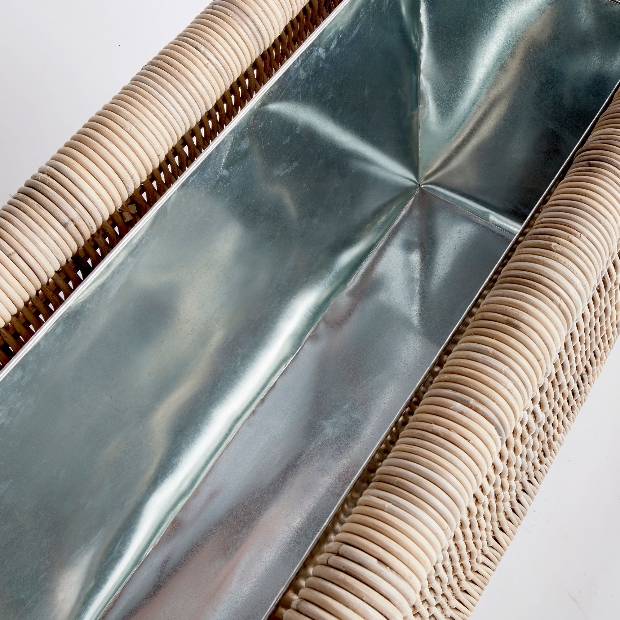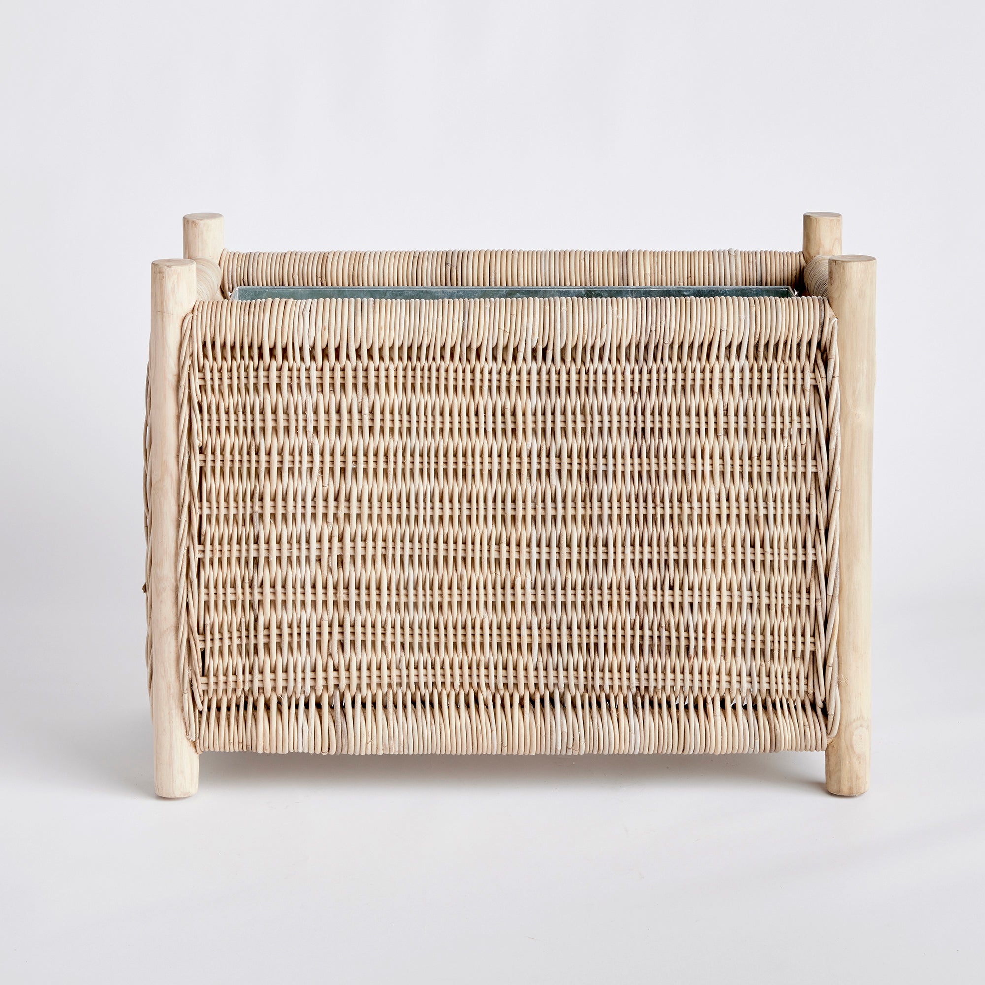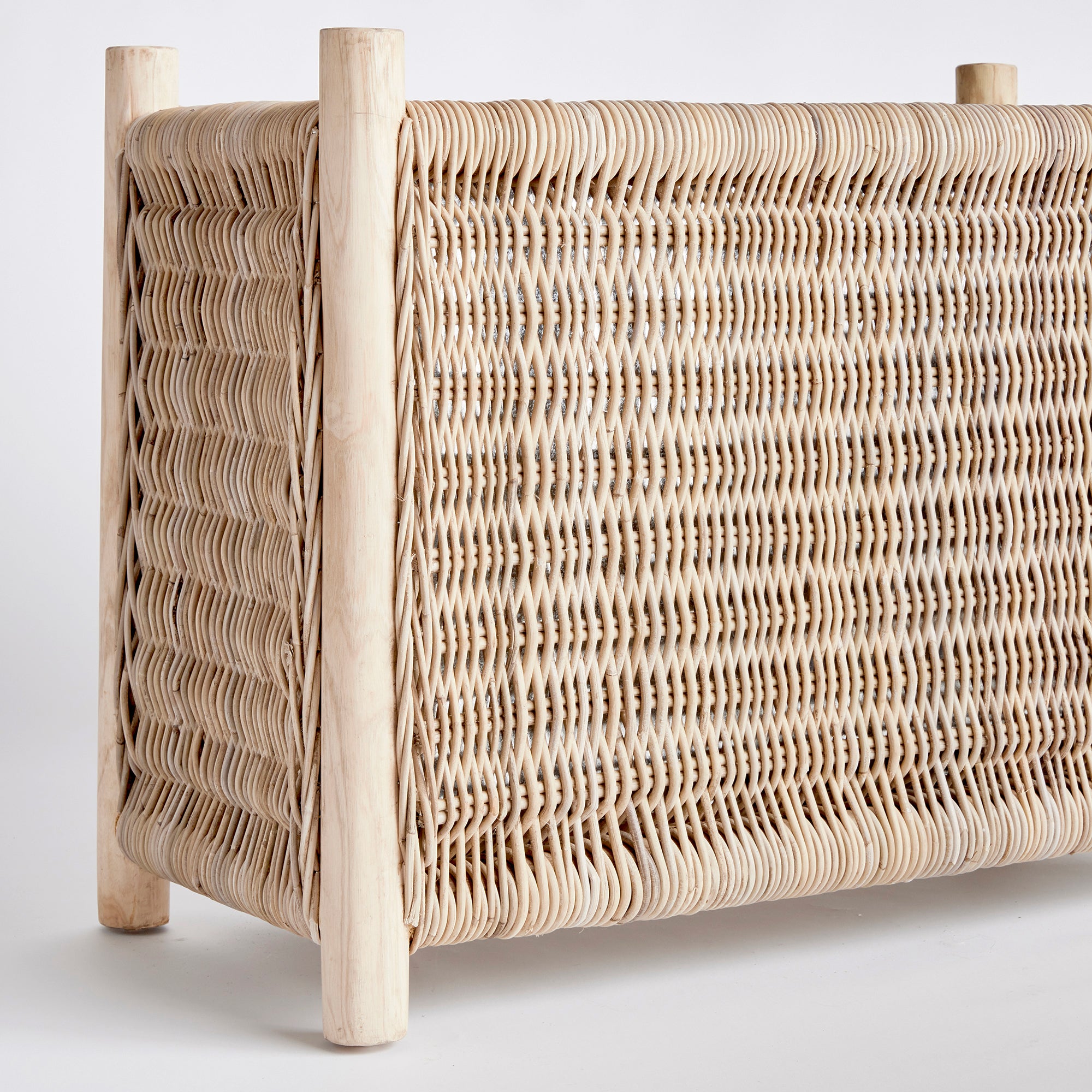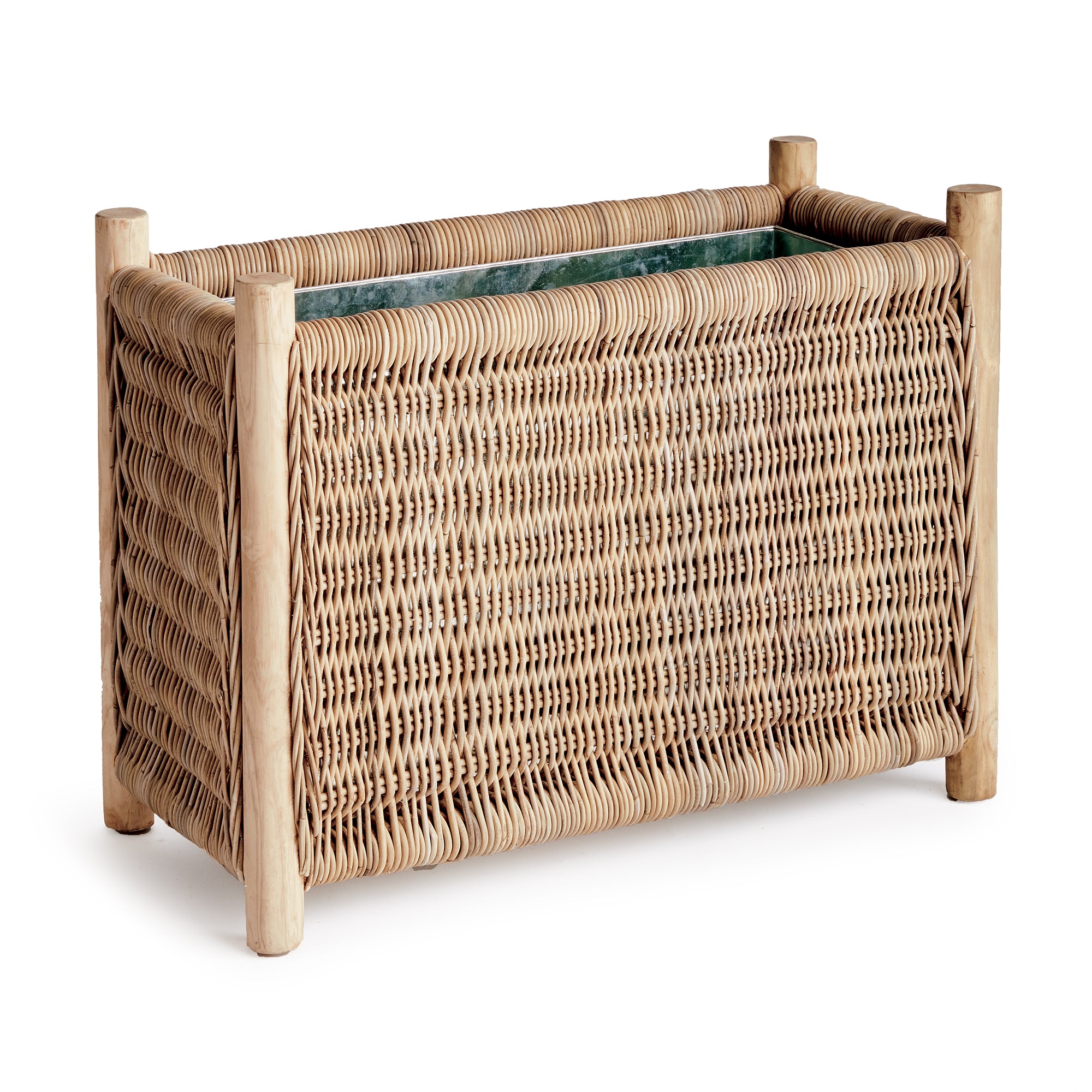 This well-constructed rectangular planter has all the bells & whistles. A removable zinc galvanized liner, teak legs, organic all-natural materials, it is quite the statement piece. With a slender profile, works well on a narrow porch or entryway.