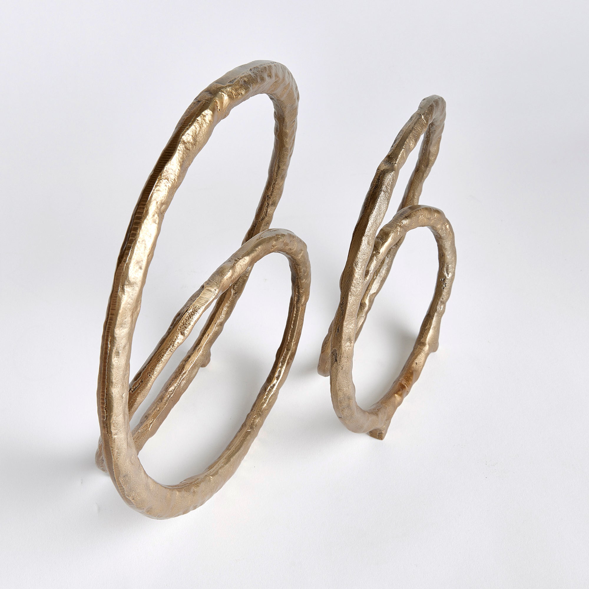 In an antique gold finish, this set of two coordinating sculptures are a fresh look. Made of cast aluminum, they are a sturdy design with a contemporary influence. Place within a bookshelf, console or on the mantel.