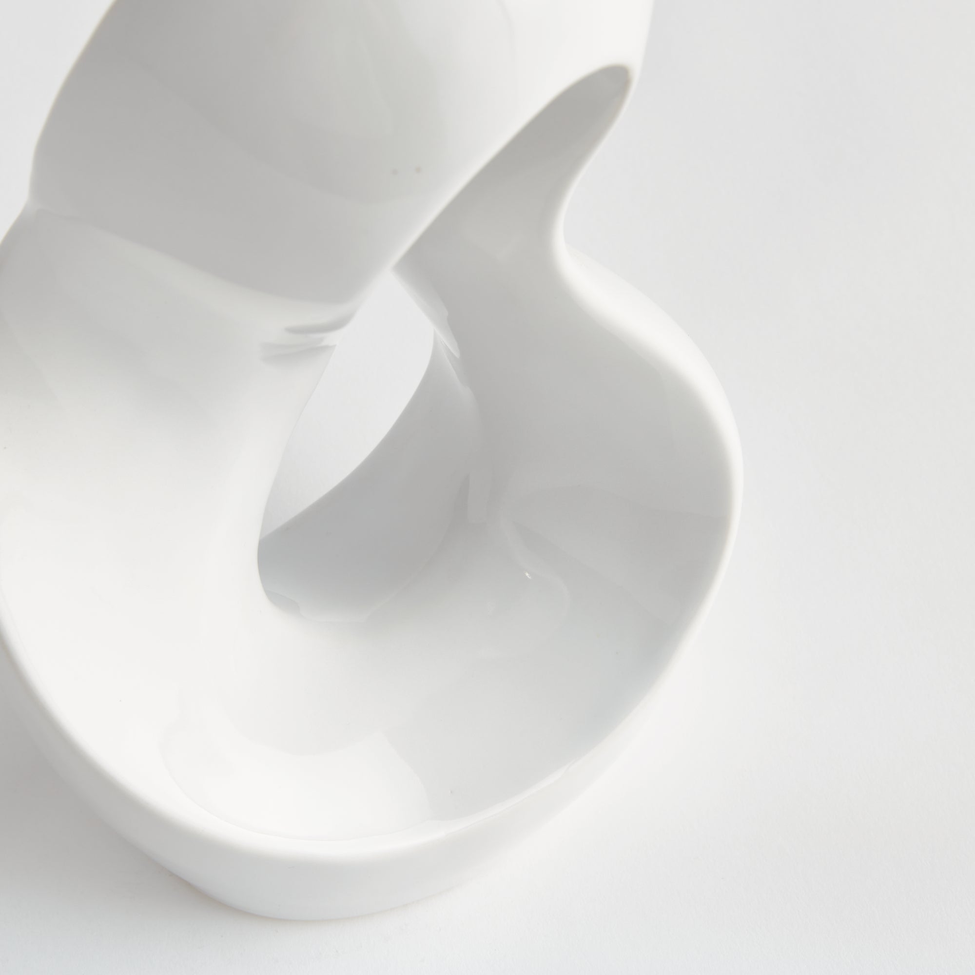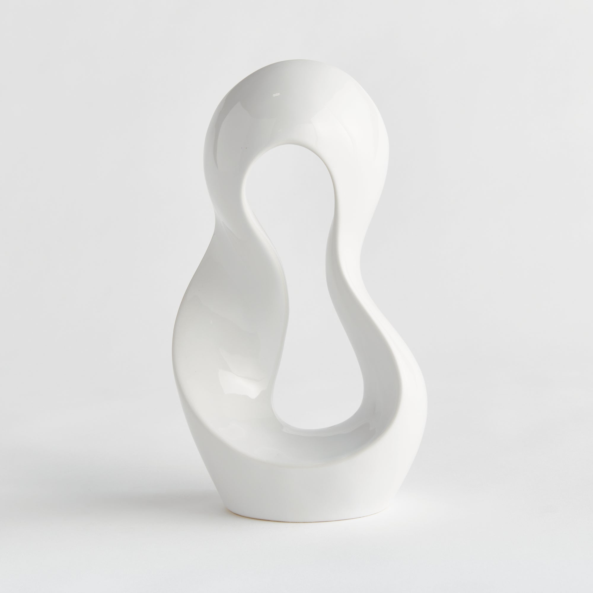 This well-scaled clay sculpture is an abstract, curvy composition finished in a shiny white glaze. A simple, yet sophisticated work of art for ottoman, desktop or bookshelf.