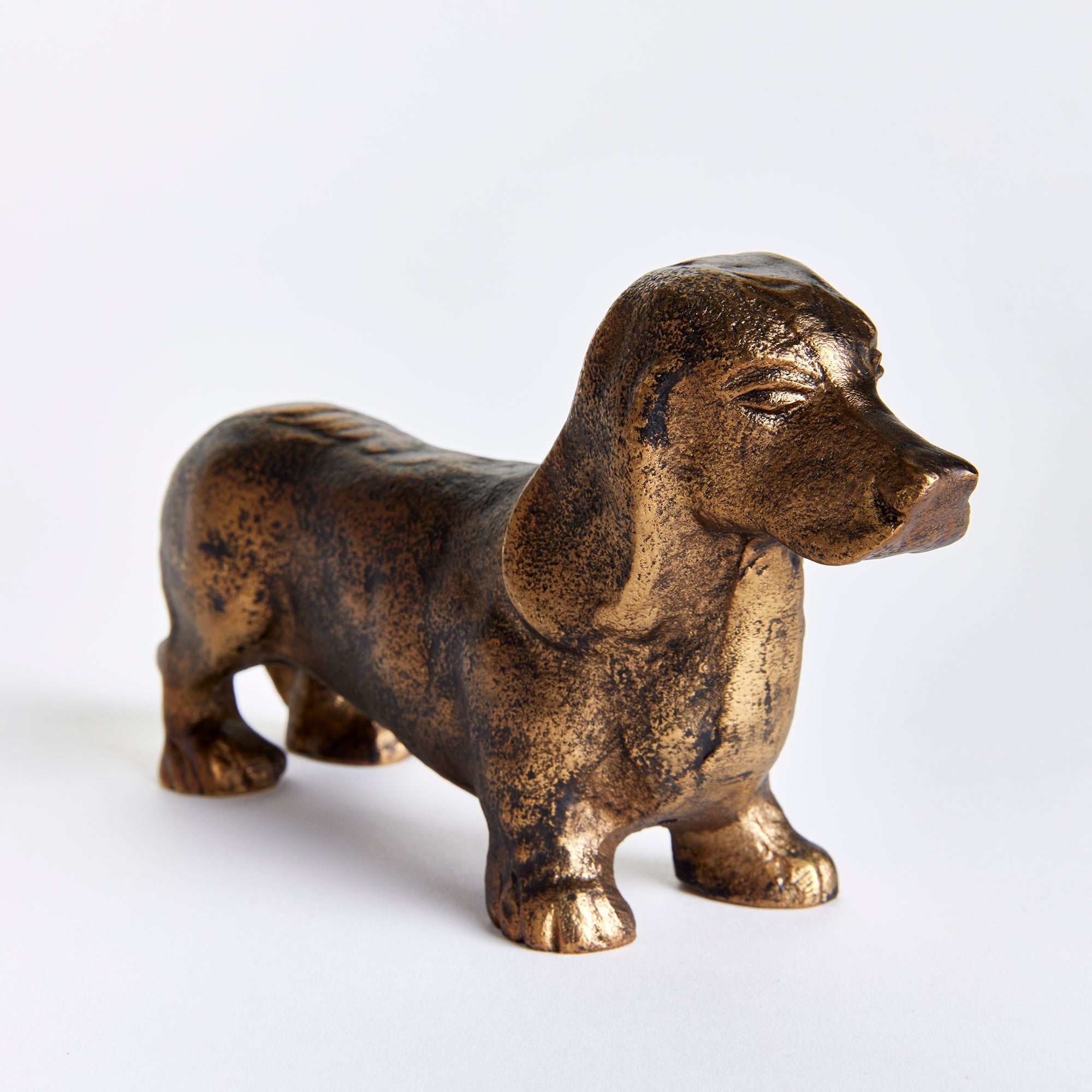 Made of a heavy cast aluminum, this regal dachshund sculpture is worthy of a prime bookshelf spot. With realistic signature features, a darling addition to side table or ottoman, as well.