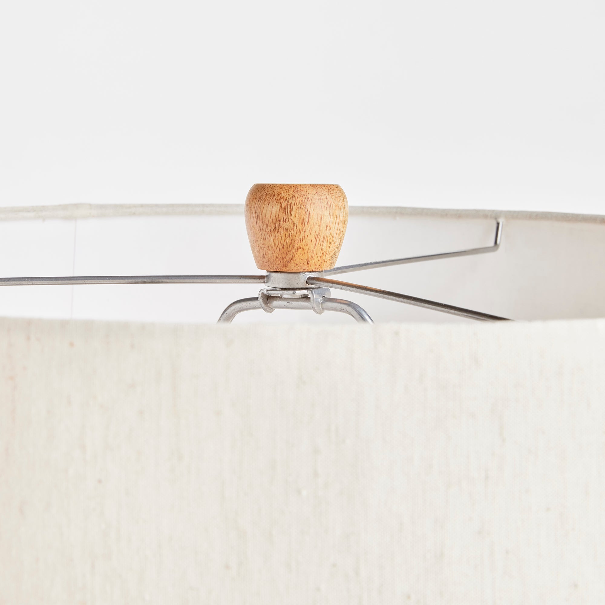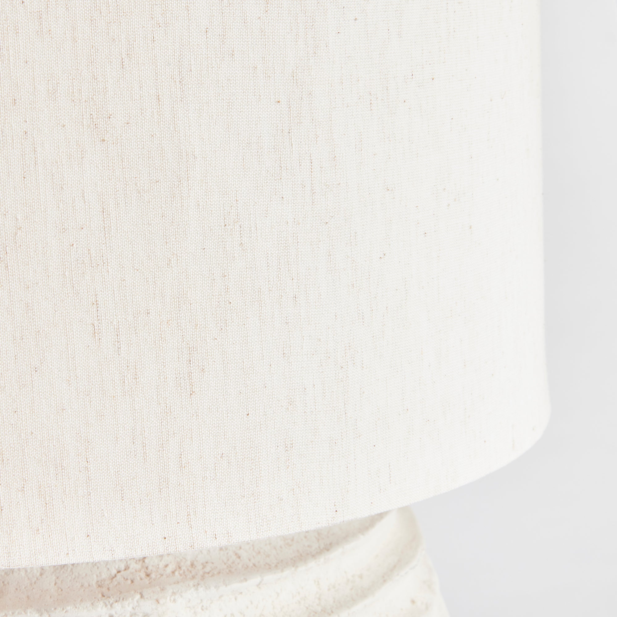 A ceramic base designed with handmade horizontal ribbing, this lamp is made with an artisan feel. Topped off with a linen shade, it is a casual accent for the home or office.