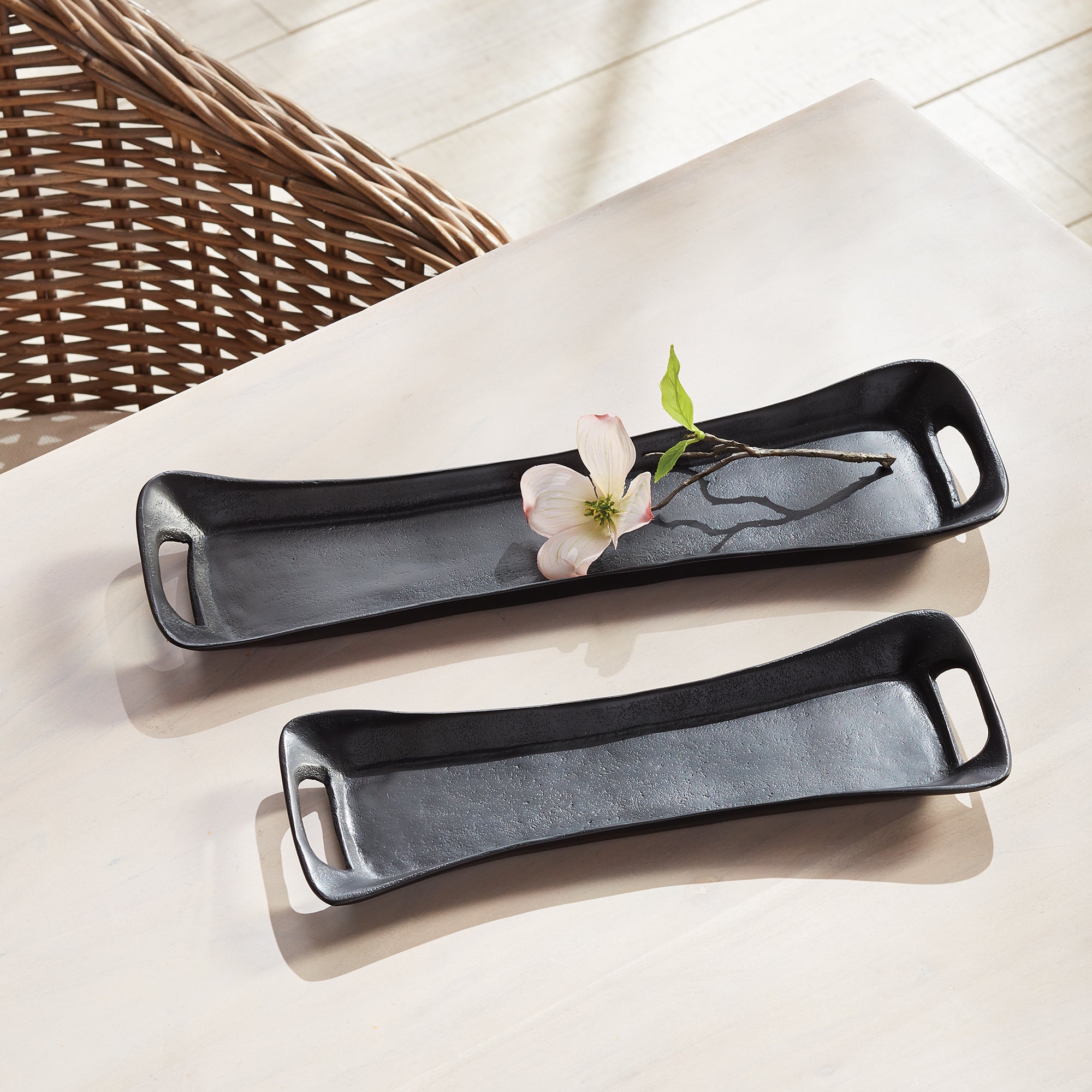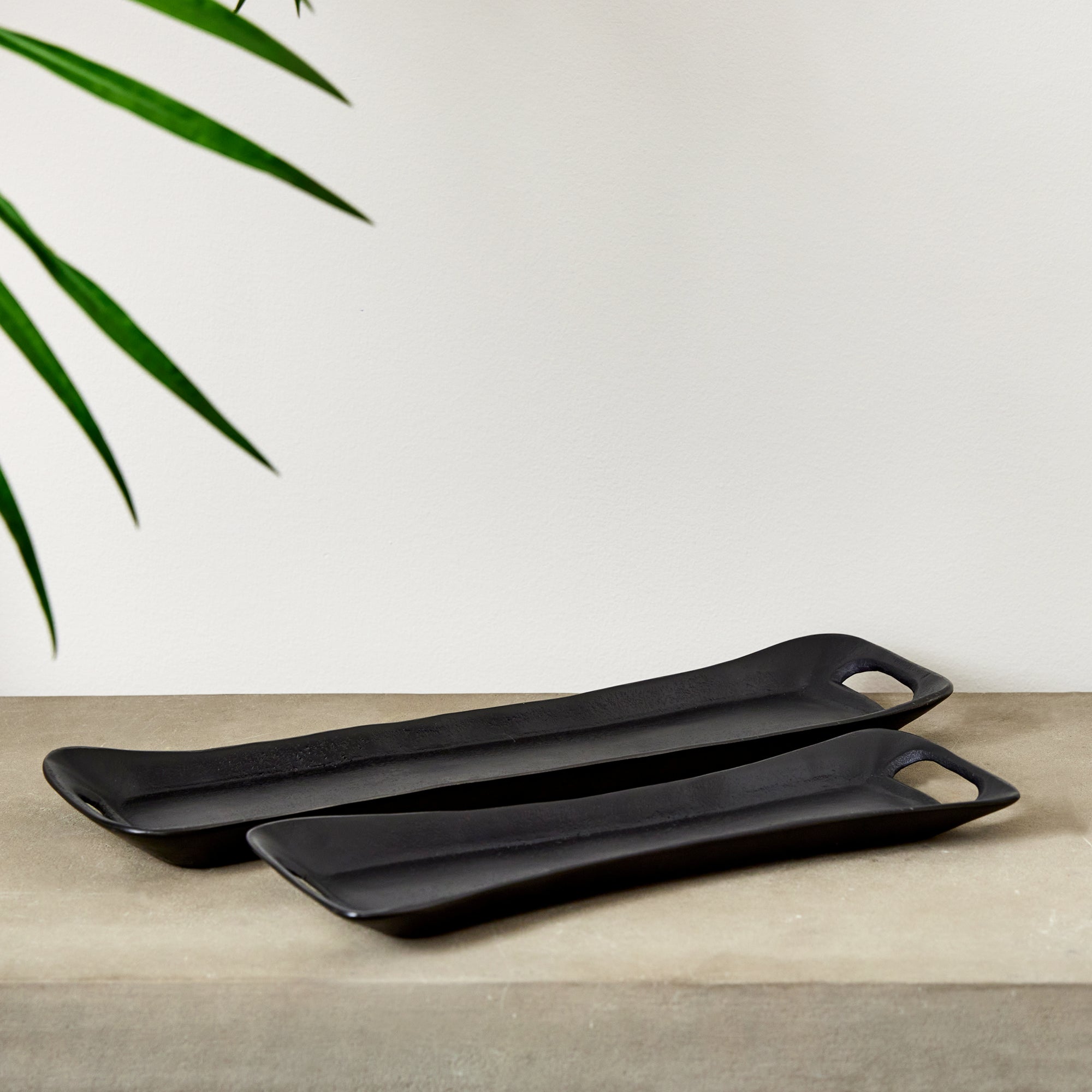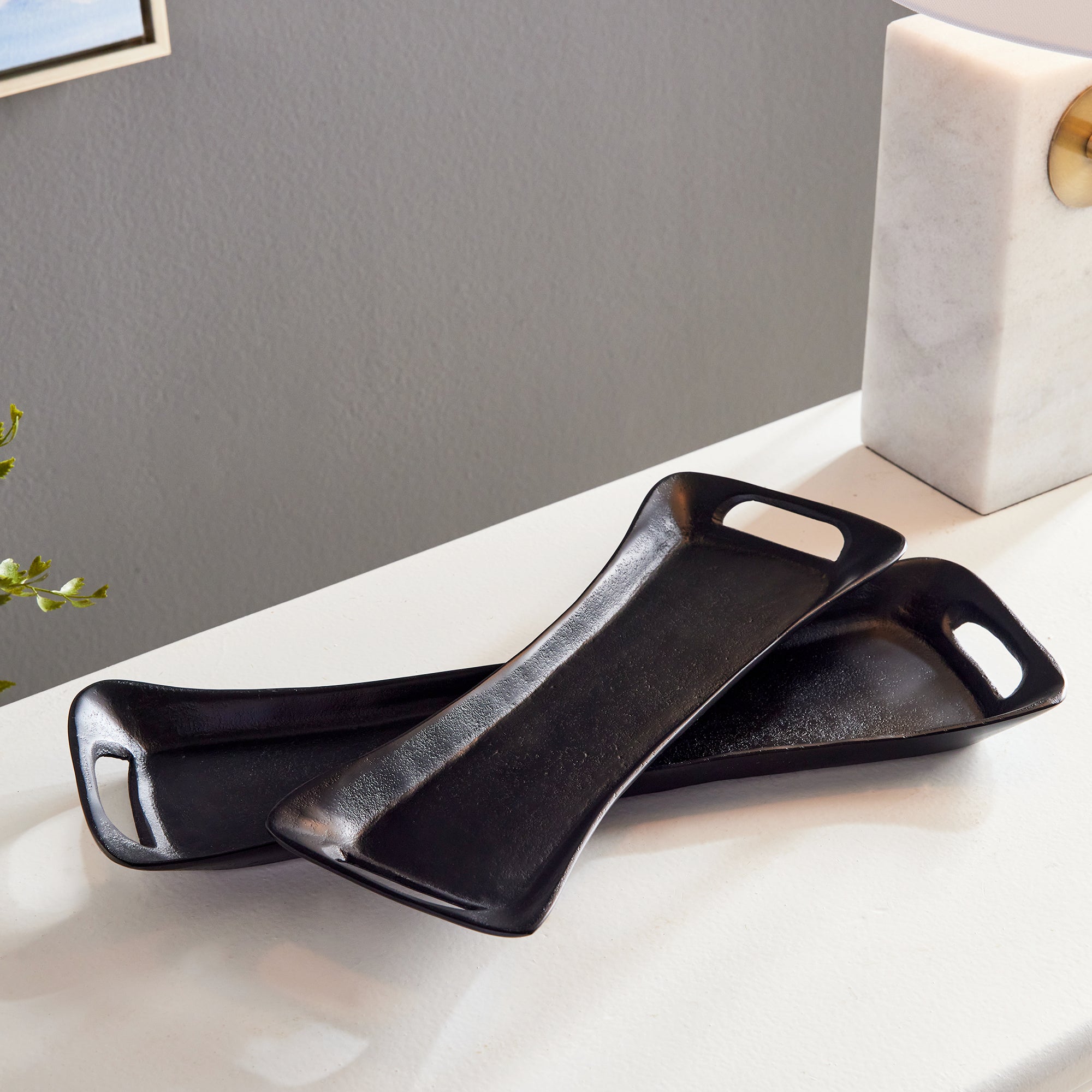 A modern form and exaggerated shape makes this set of trays unique. Line them with a collection of candles, or accessorize with whatever fits your style for a contemporary touch.