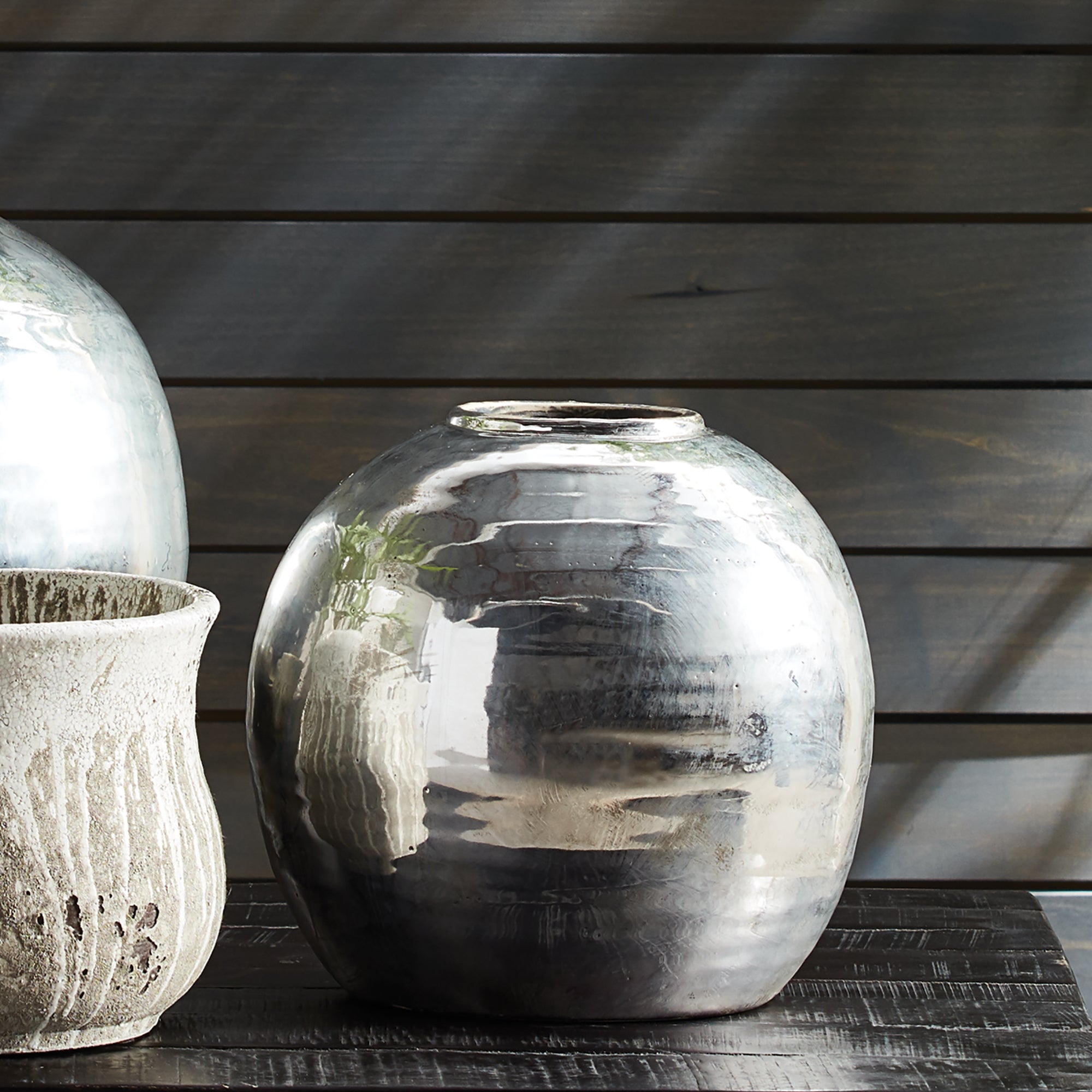 This organically shaped vase is a subtle, simple design. The reflective surface and antiqued finish make the Ida Vase a mod accent for the home.